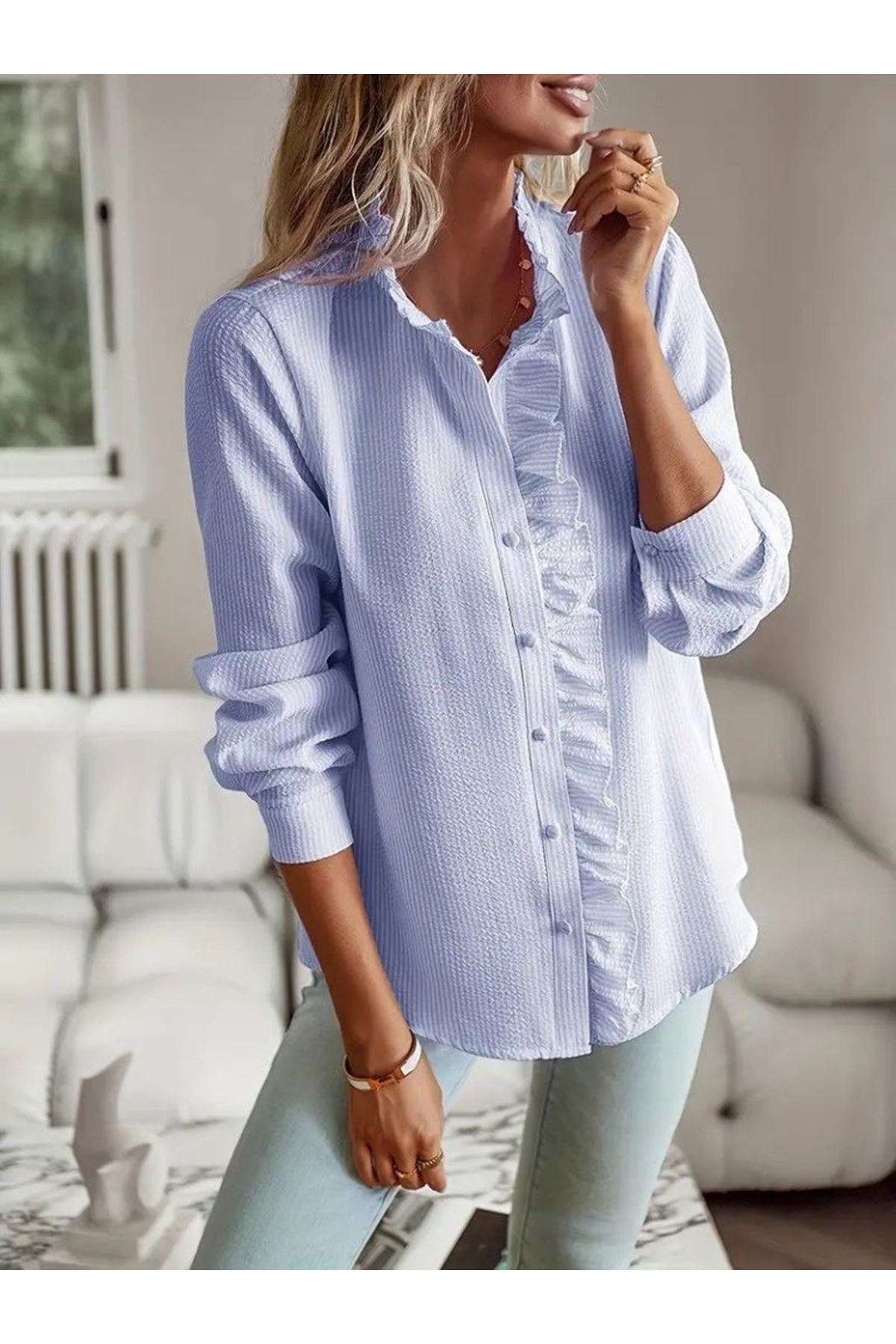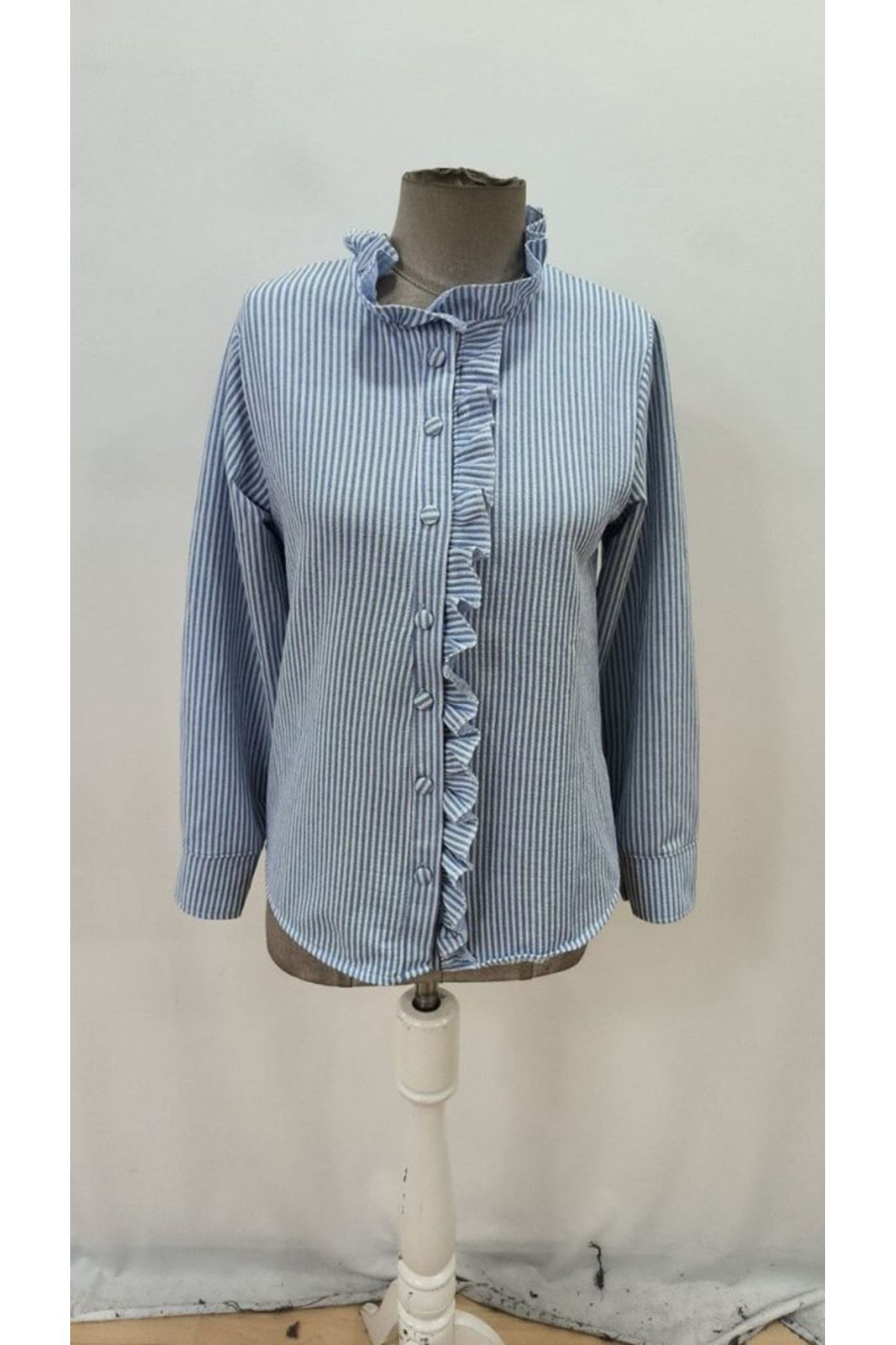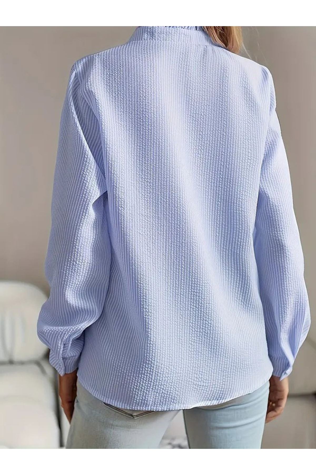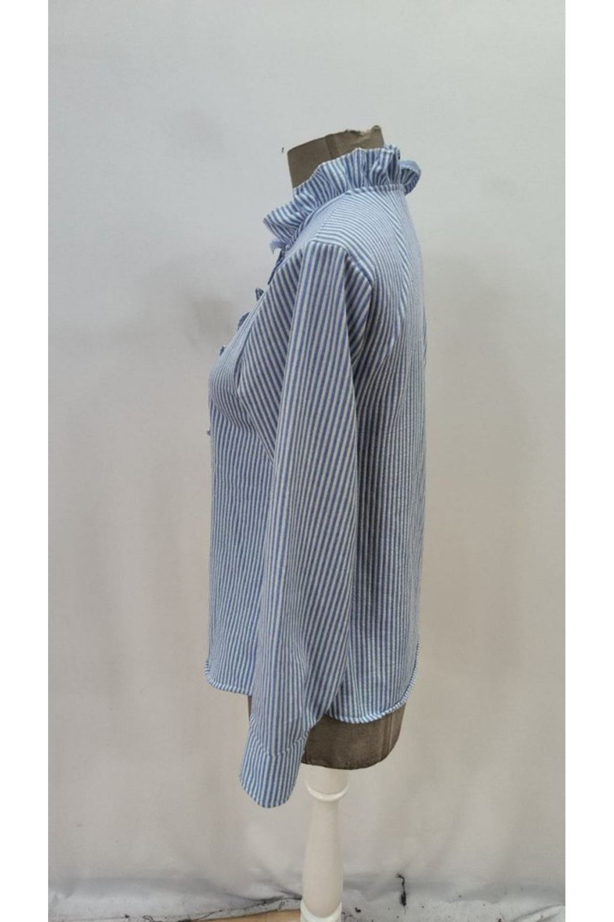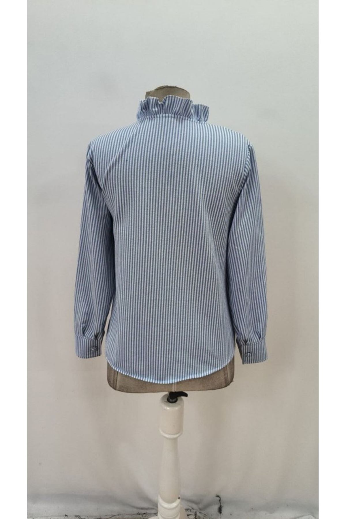 Kadın Uzun Kollu Fırfır Yakalı önden Düğmeli çizgili Burgu Gömlek