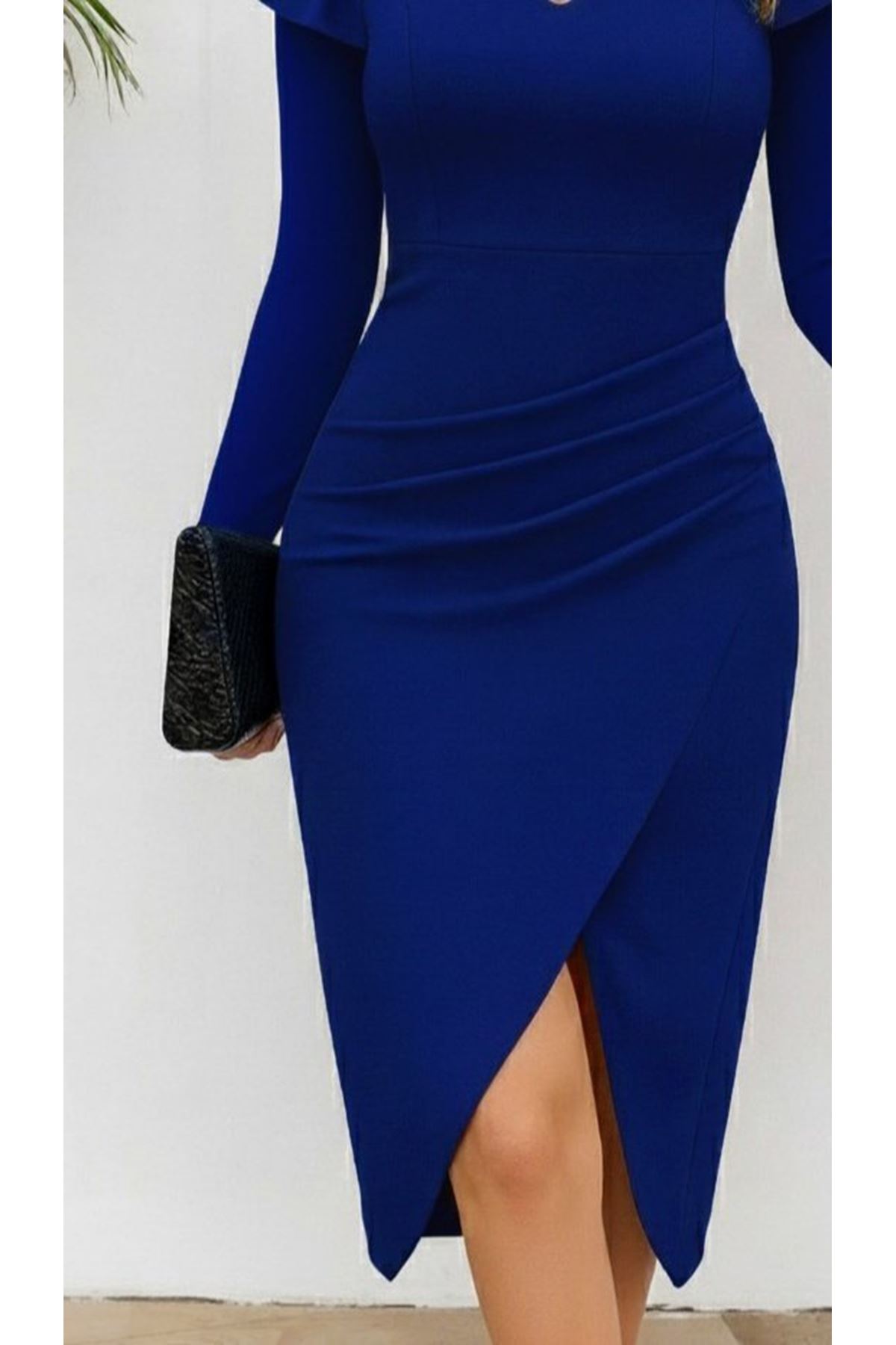 Kadın Uzun Kollu Kalp Yaka önden çapraz Detaylı Midi Ithal Krep Elbise