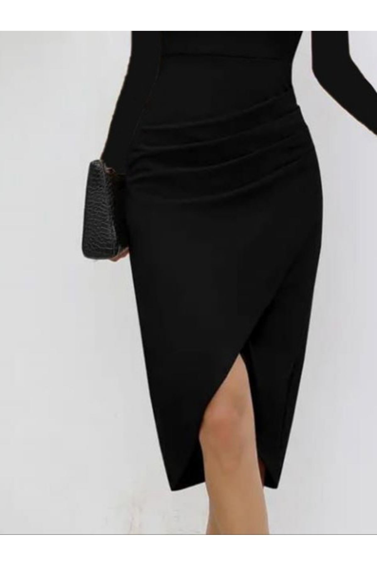 Kadın Uzun Kollu Kalp Yaka önden çapraz Detaylı Midi Ithal Krep Elbise
