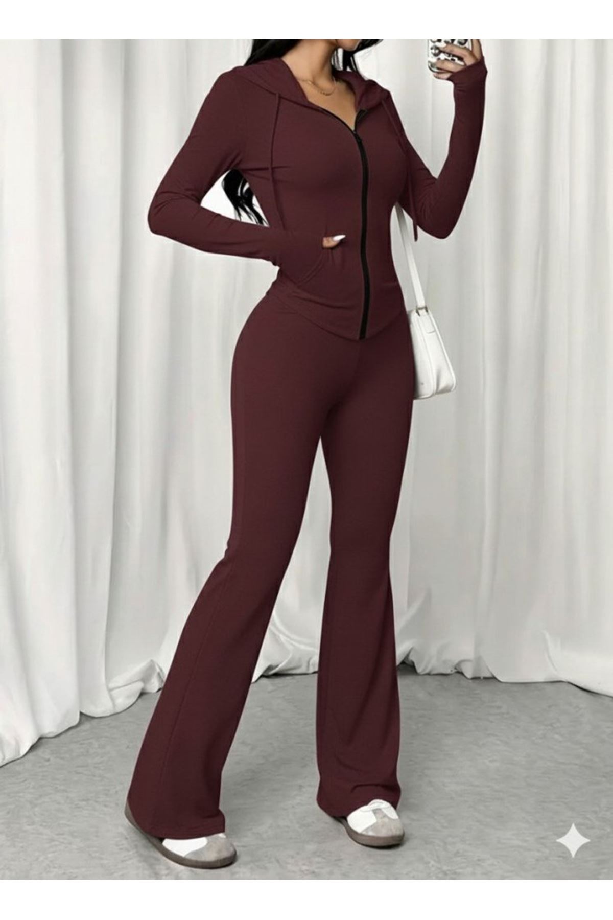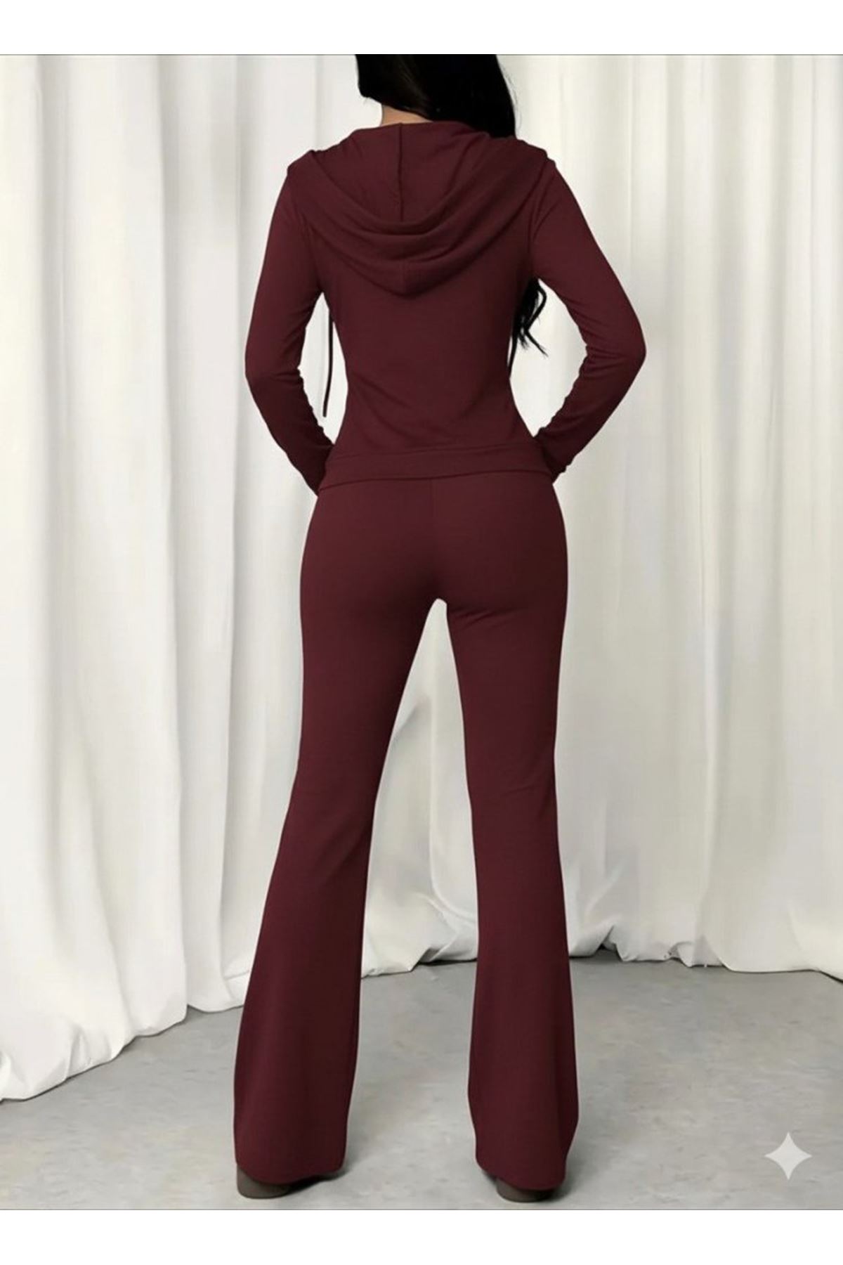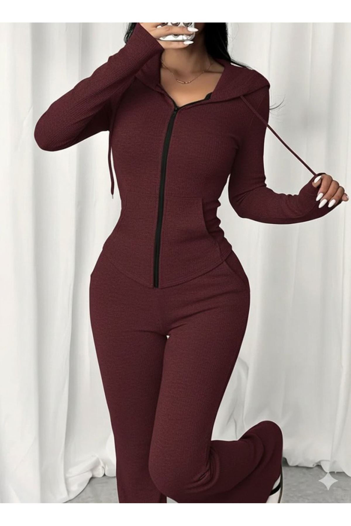 Kadın Uzun Kollu Kapşonlu Bağcıklı önü Fermuarlı Viskon Iki Iplik Bluz Ve Pantolon Ikili Takım