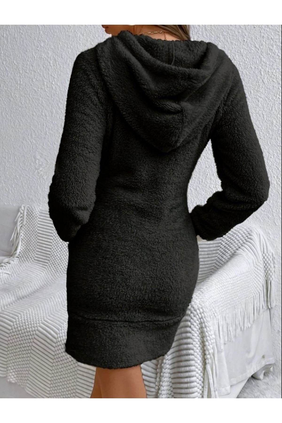 Kadın Uzun Kollu Kapşonlu Cepli Mini Peluş Elbise