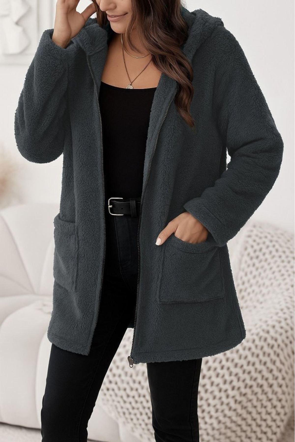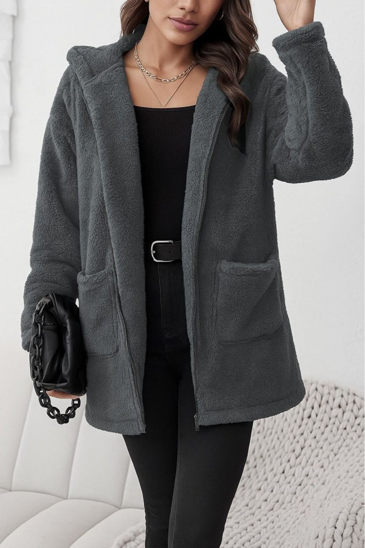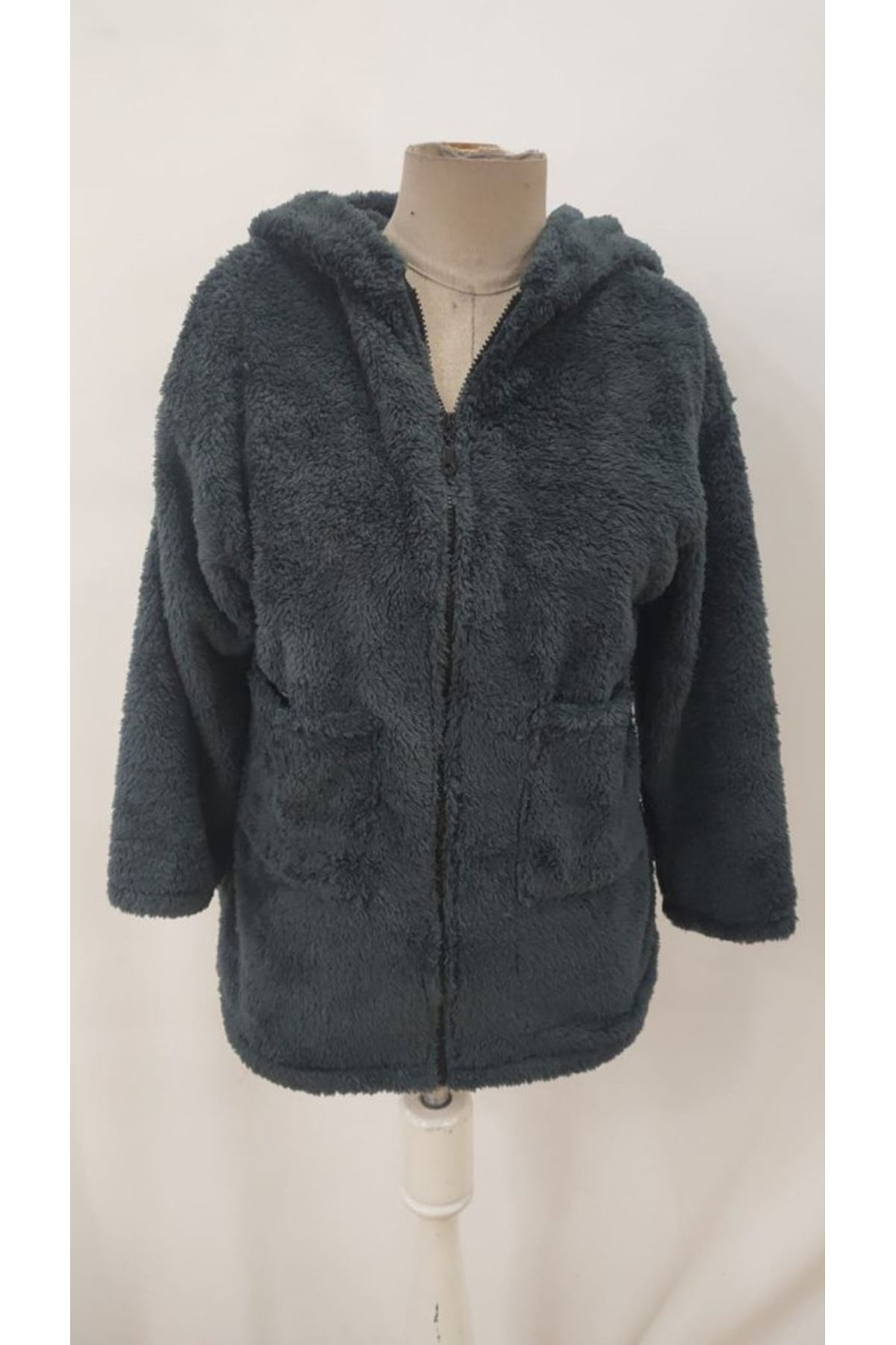 Kadın Uzun Kollu Kapşonlu önden Fermuarlı Cepli Welsoft Ceket