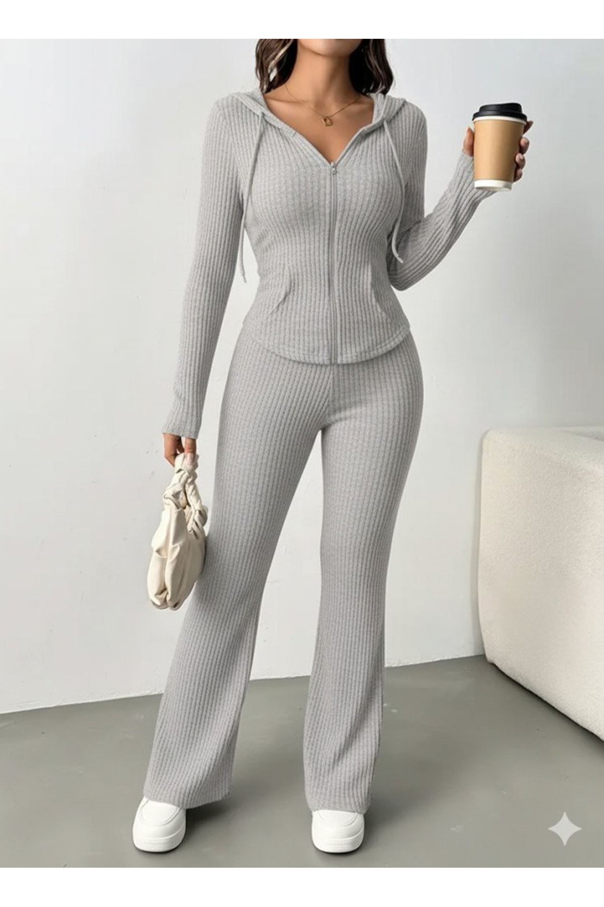 Kadın Uzun Kollu Kapşonlu önden Fermuarlı Kaşkorse Bluz Ve Pantolon Ikili Takım