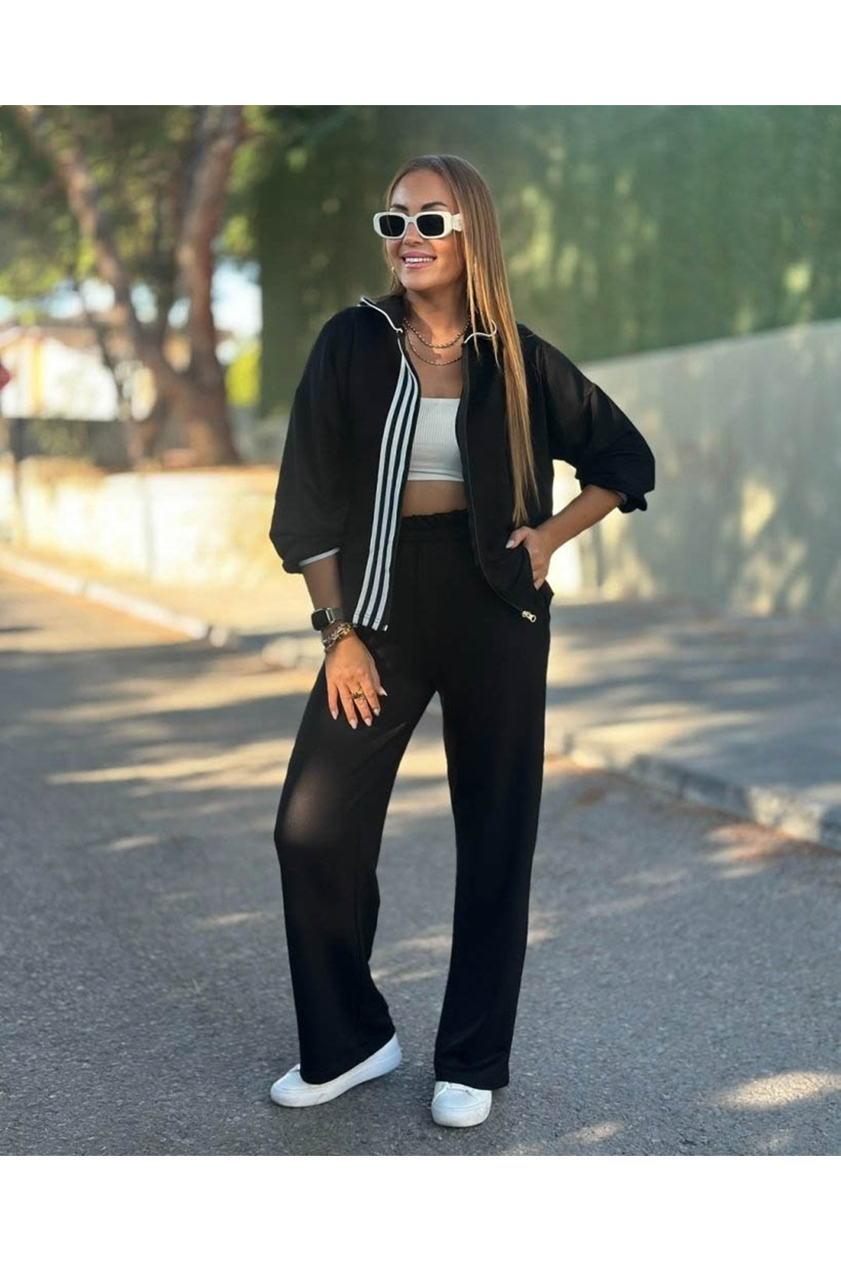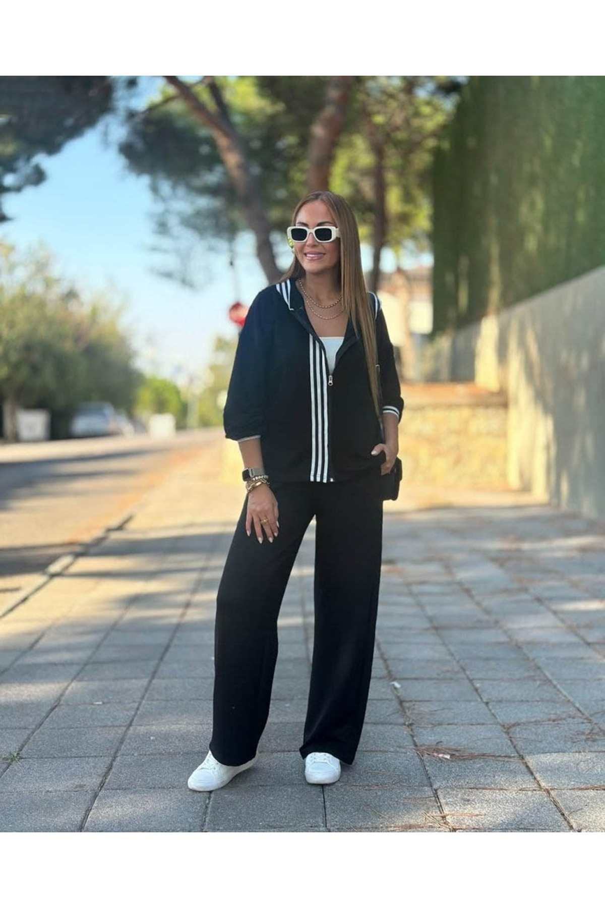 Kadın Uzun Kollu Kapşonlu Onu şerit Detaylı Fermuarlı Viskon Iki Iplik Bluz Ve Pantolon Ikili Takım
