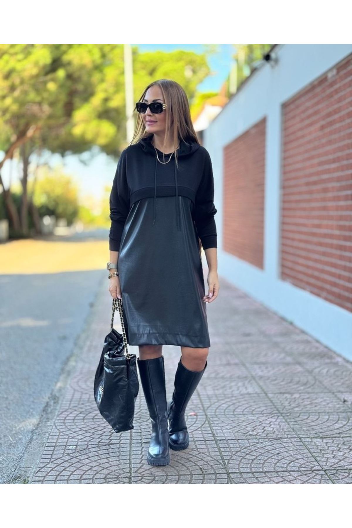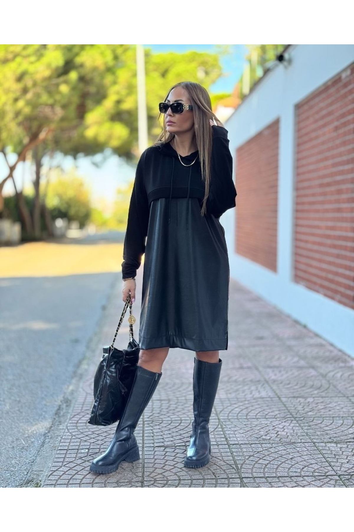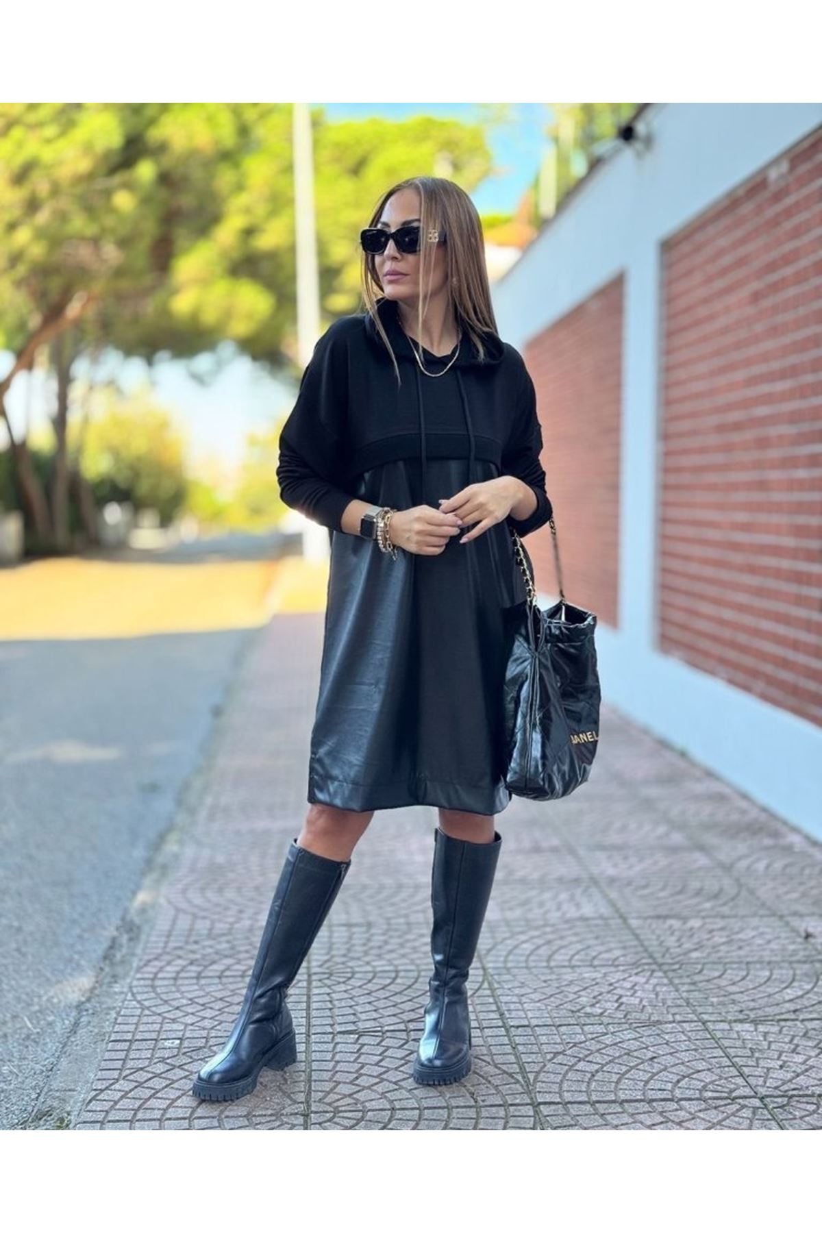 Kadın Uzun Kollu Kapüşon Ve Deri Detay Diz üstü Elbise