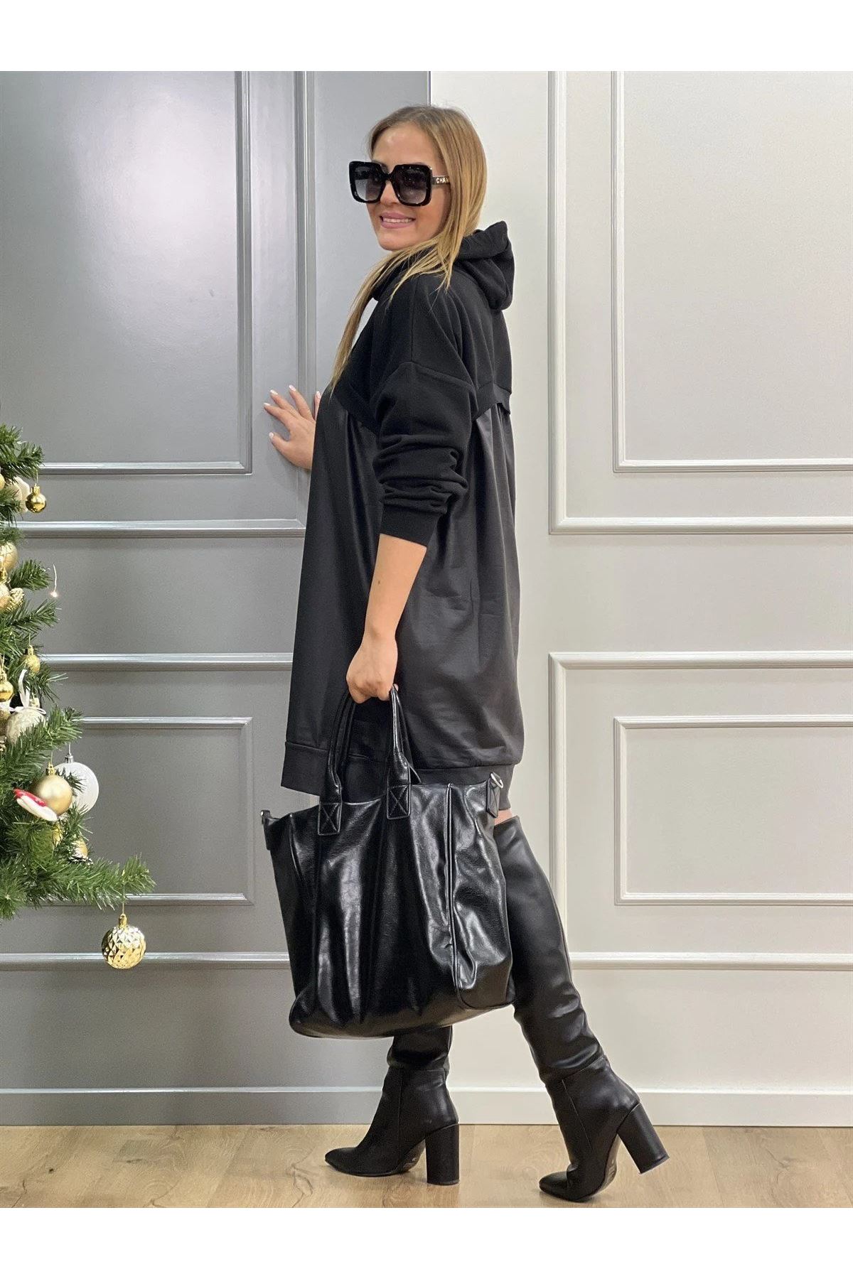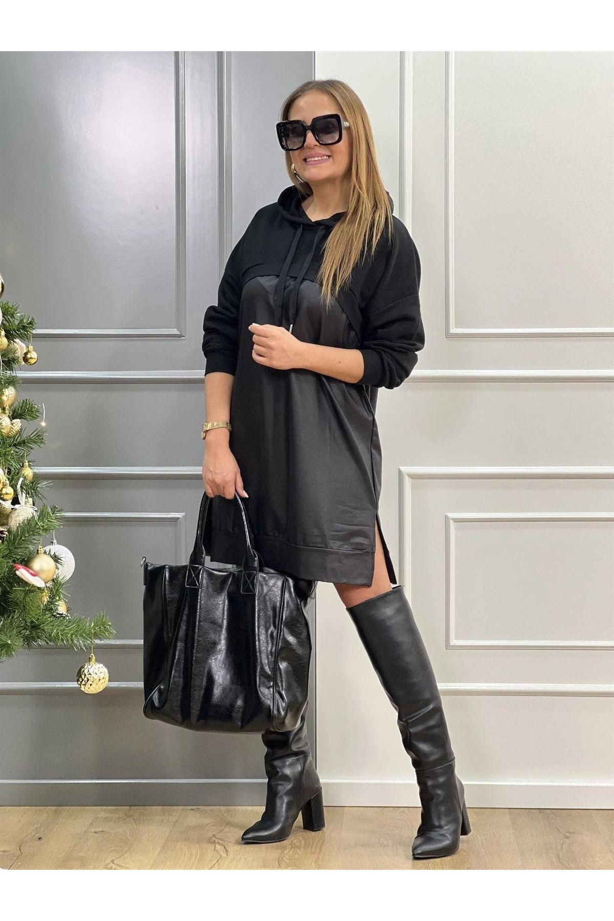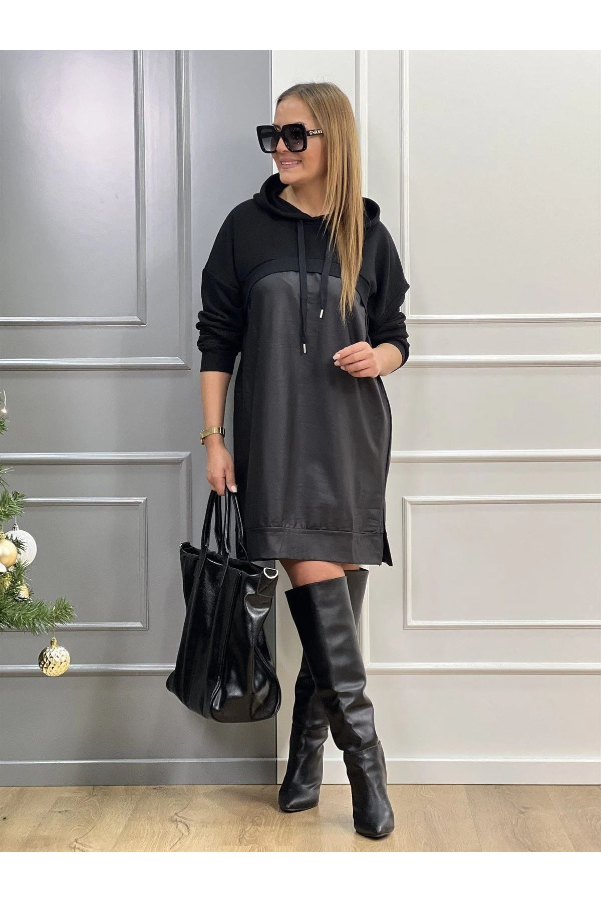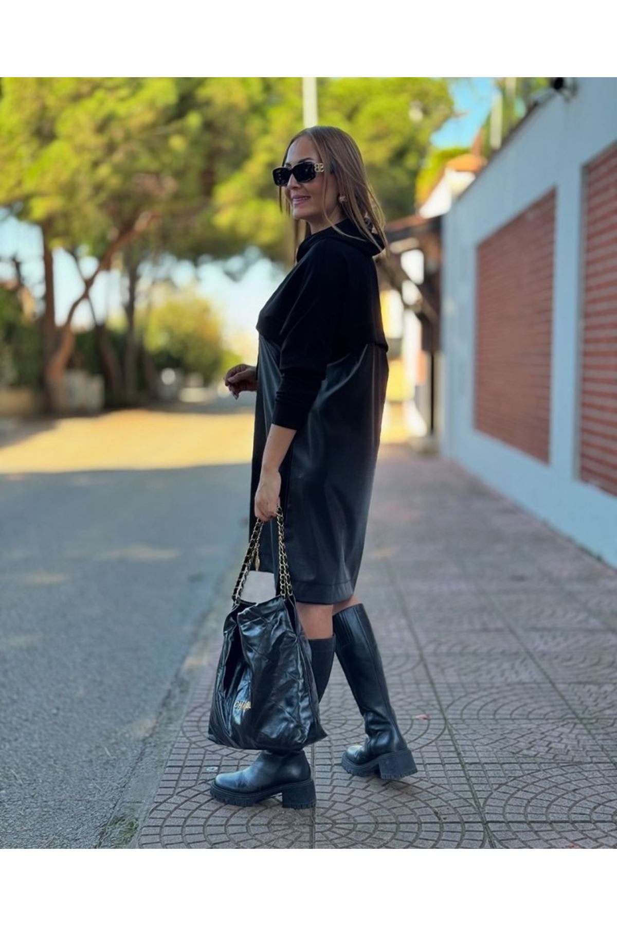 Kadın Uzun Kollu Kapüşon Ve Deri Detay Diz üstü Elbise