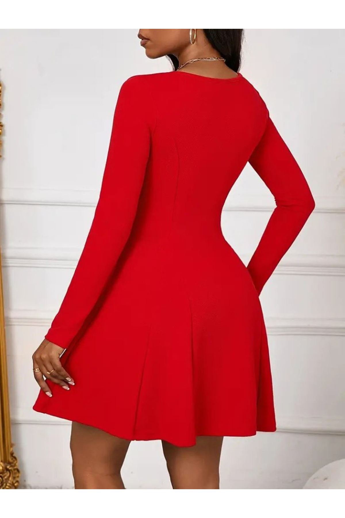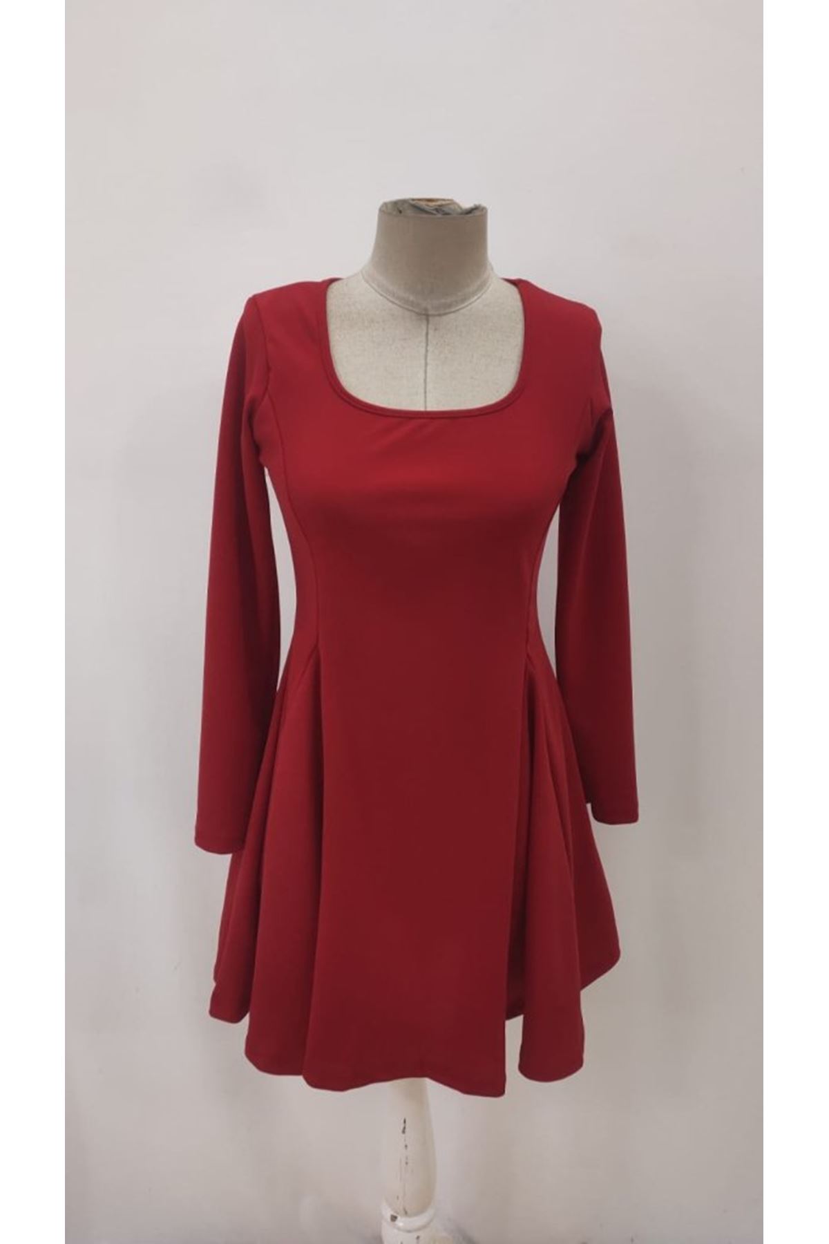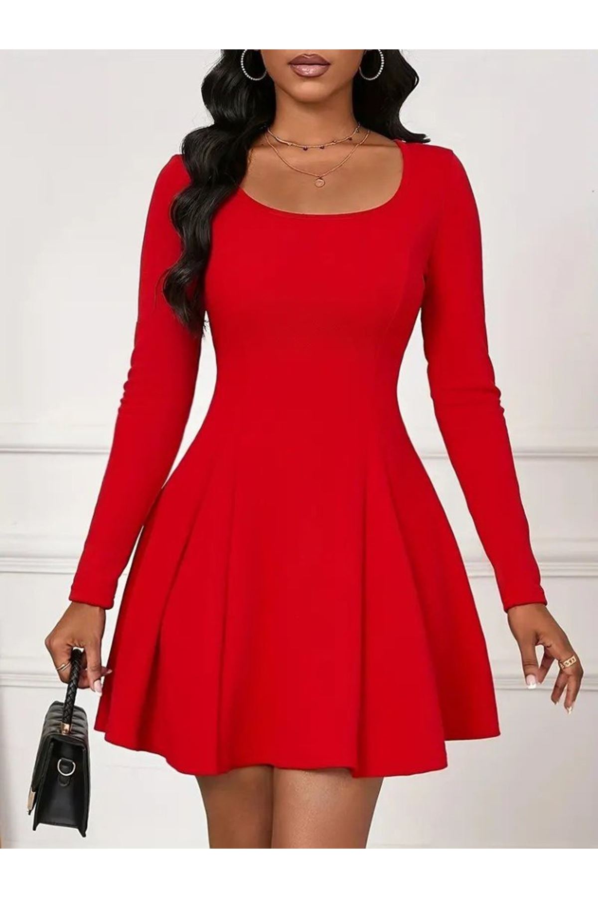 Kadın Uzun Kollu Kare Yakalı Mini Ithal Krep Elbise