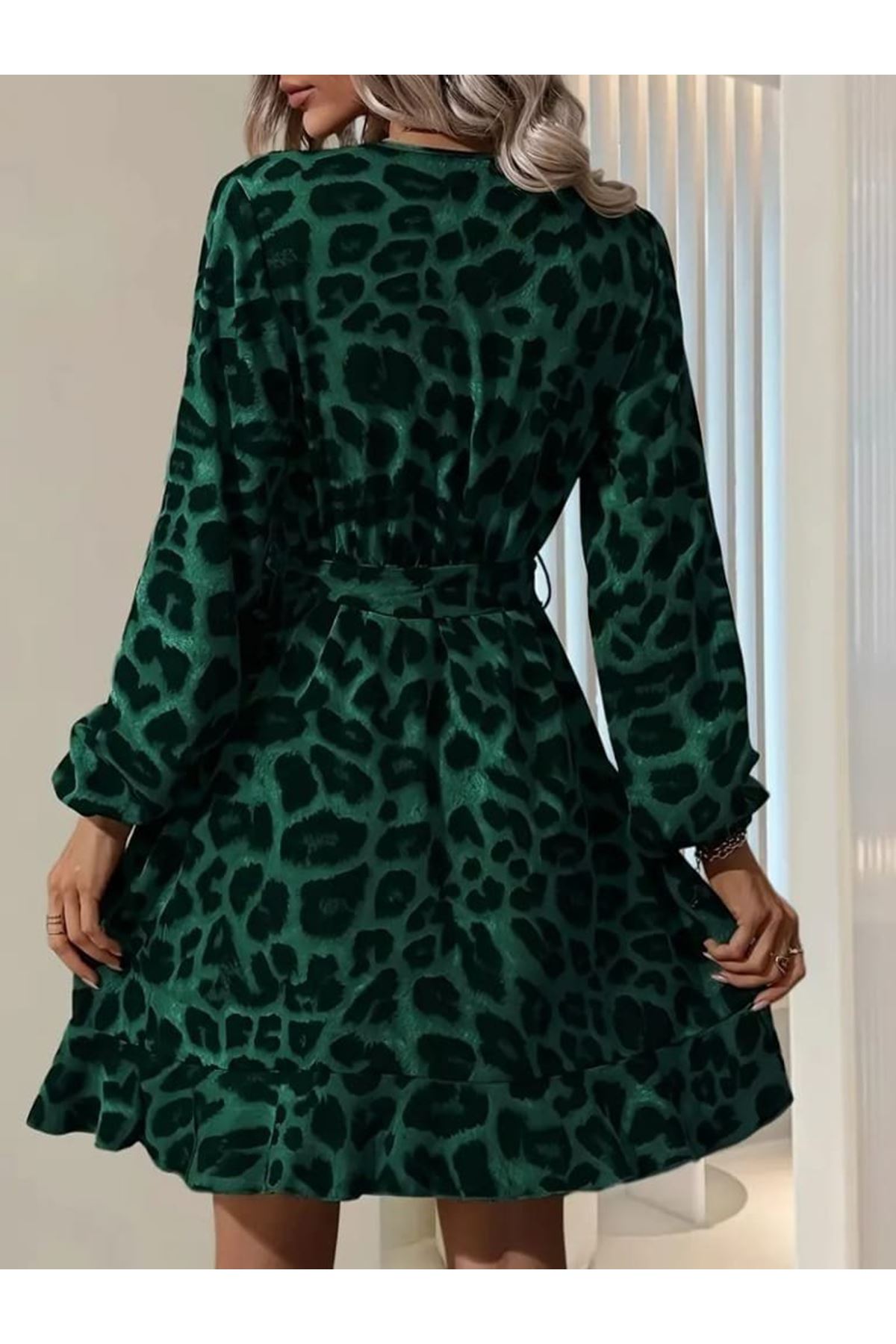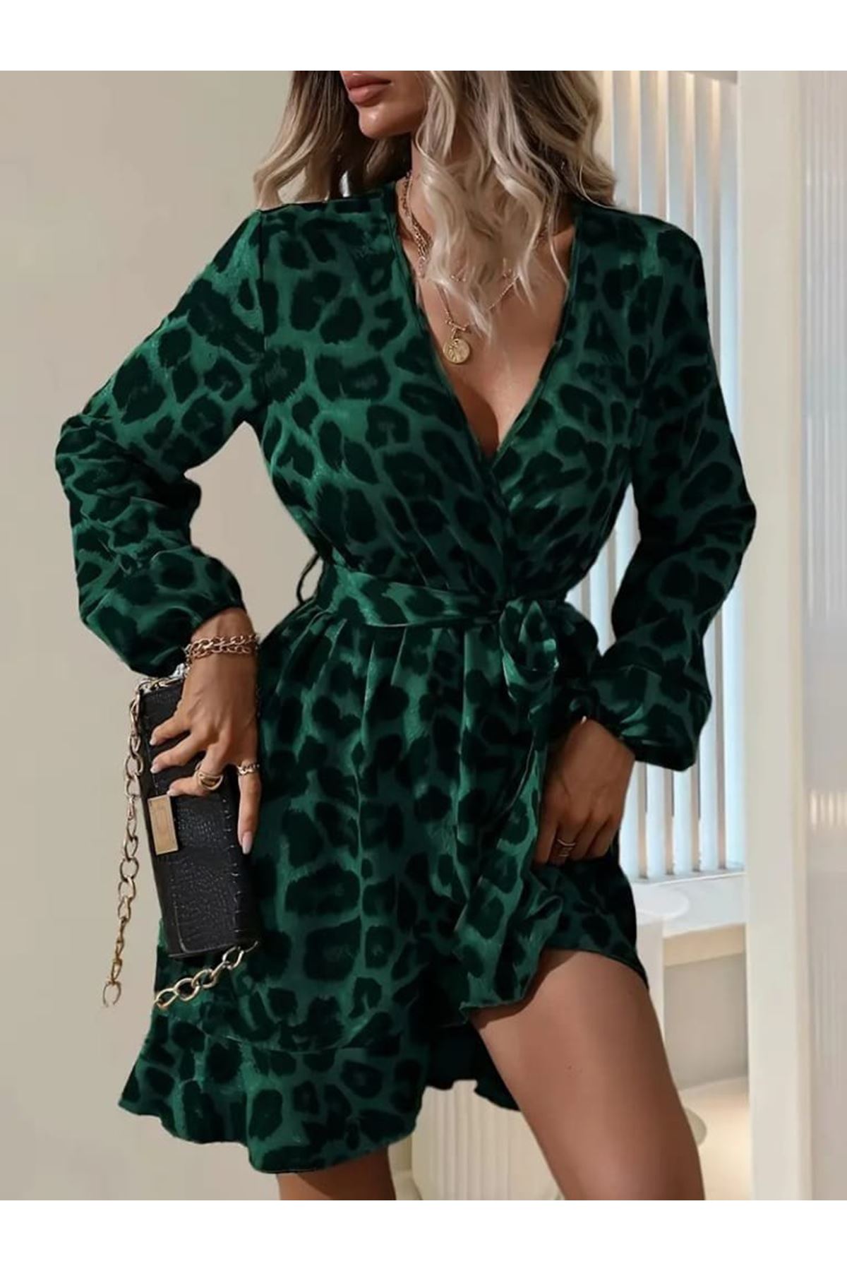 Kadın Uzun Kollu Kruvaze Yaka Beden Kuşaklı çapraz Kesim Detaylı Leopar Modal Mini Elbise