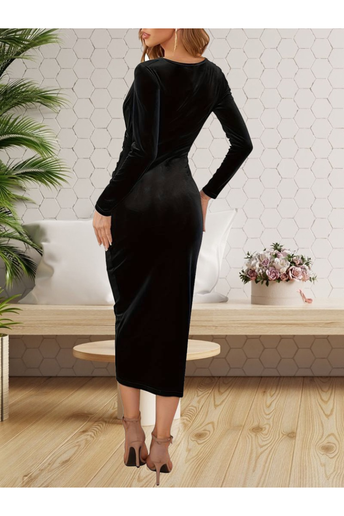 Kadın Uzun Kollu Kruvaze Yaka Belden Büzgü Detay Midi Kadife Elbise