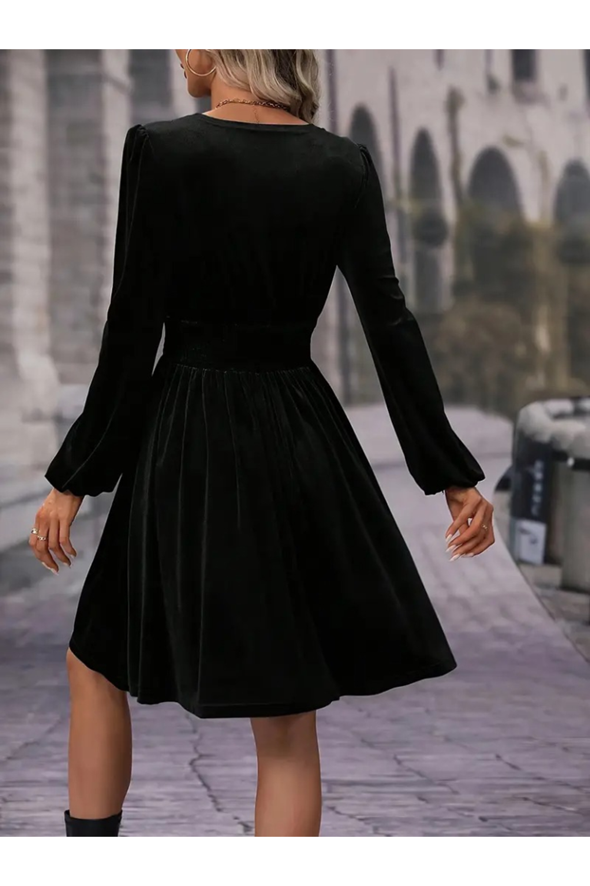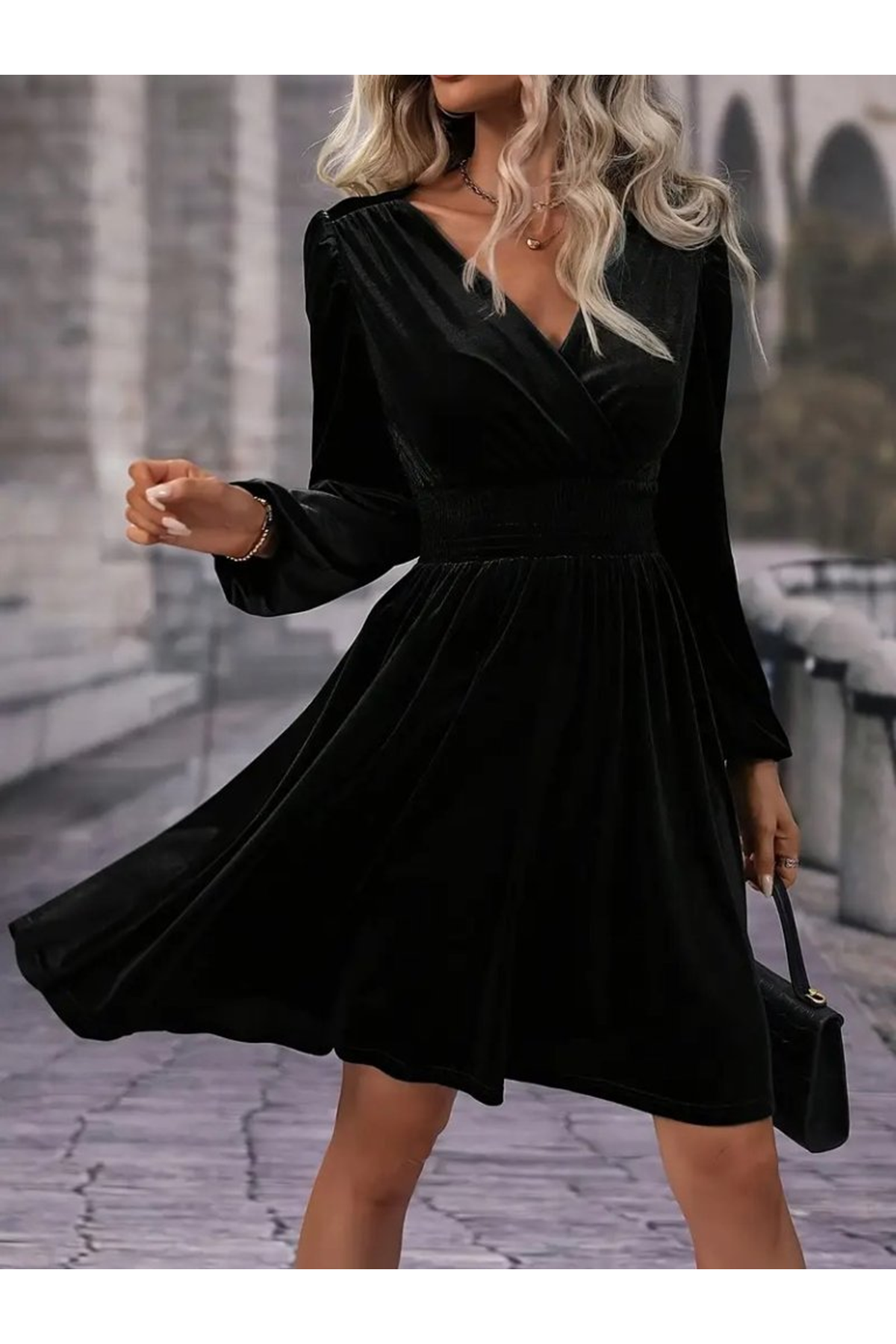 Kadın Uzun Kollu Kruvaze Yaka Beli Lastikli Kiloş Kadife Elbise