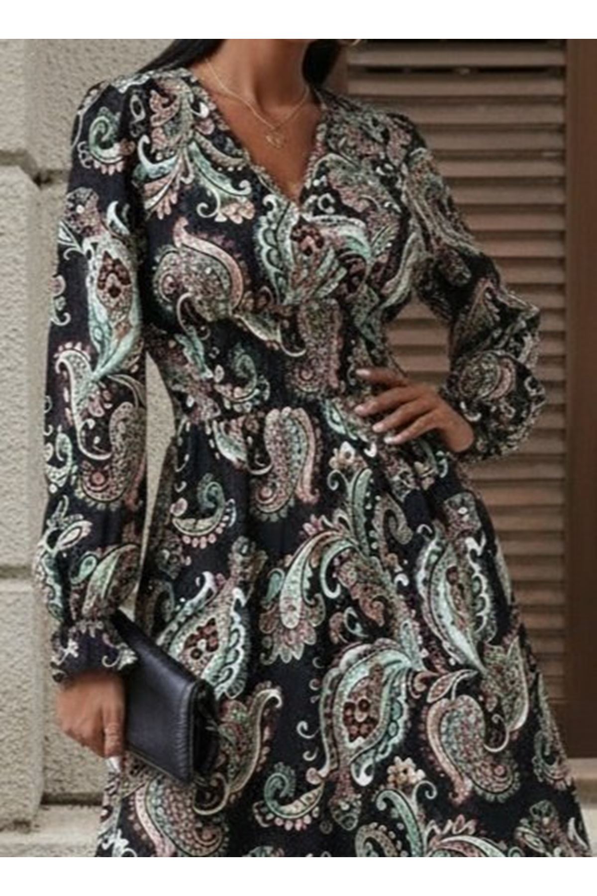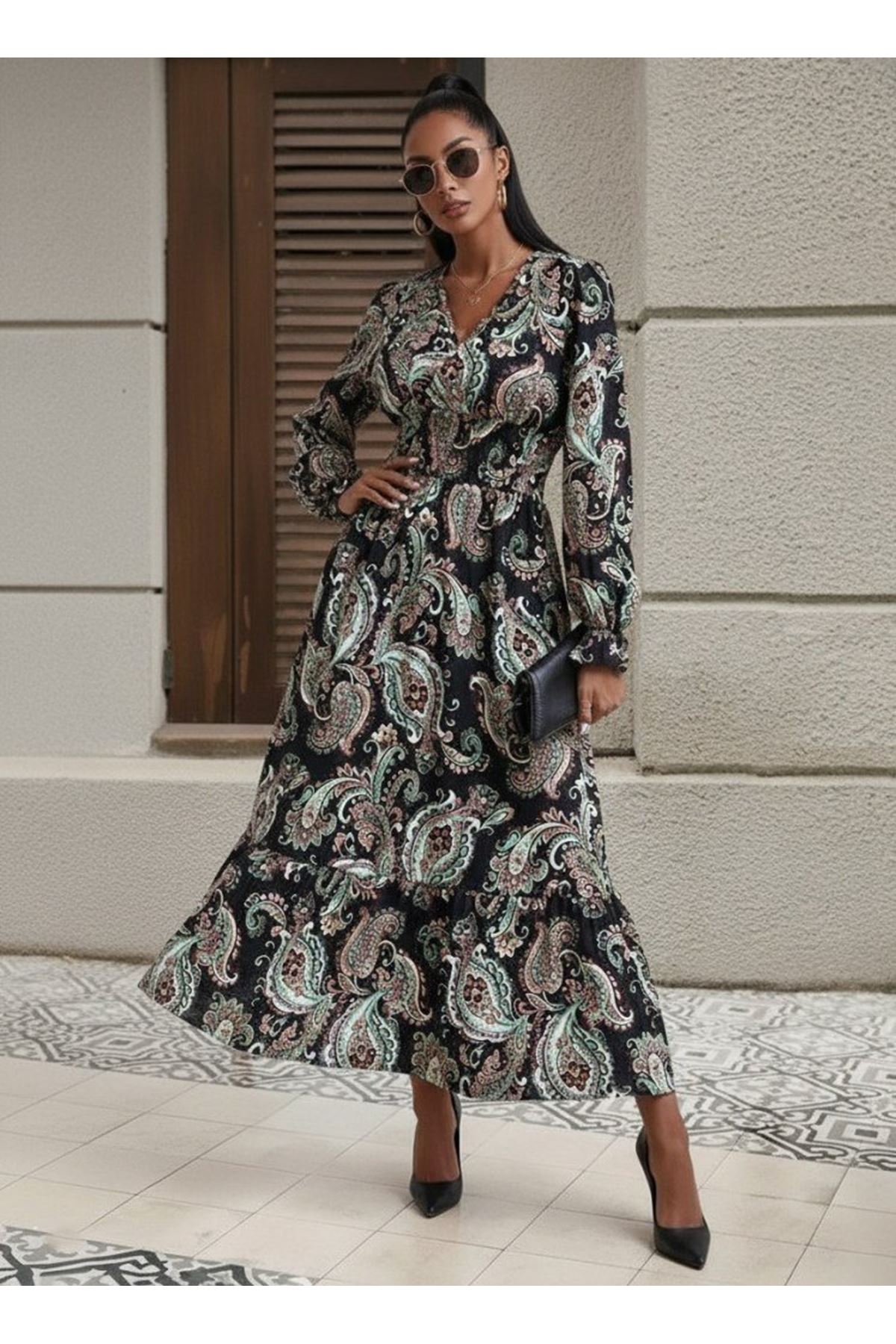Kadın Uzun Kollu Kruvaze Yaka Beli Lastikli Uzun Desenli Maxi Elbise