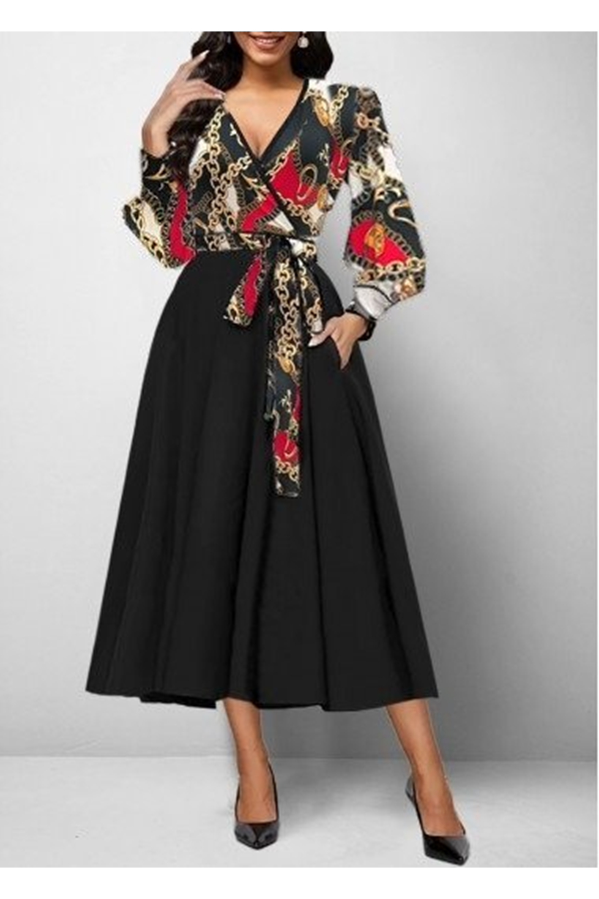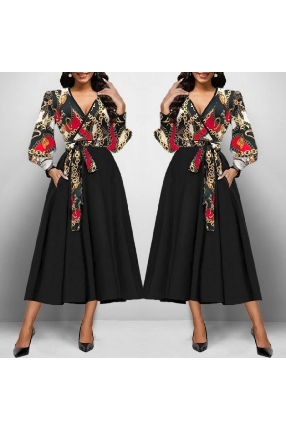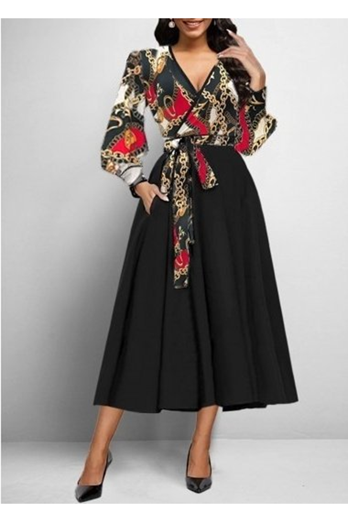 Kadın Uzun Kollu Kruvaze Yaka Dalgıç Krep Midi Boy Elbise