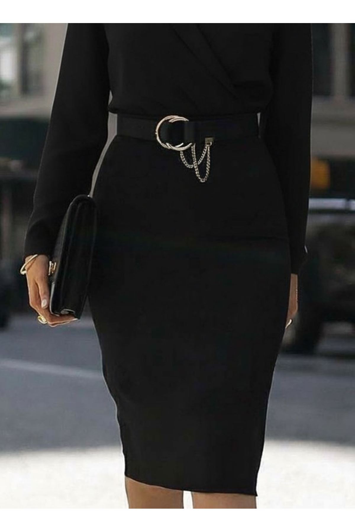 Kadın Uzun Kollu Kruvaze Yaka Janjan Krep Midi Elbise