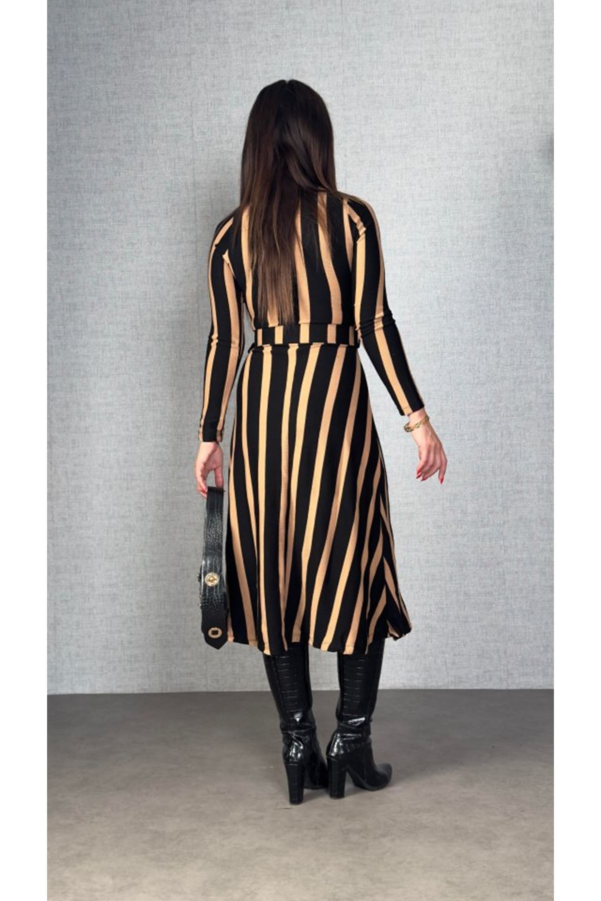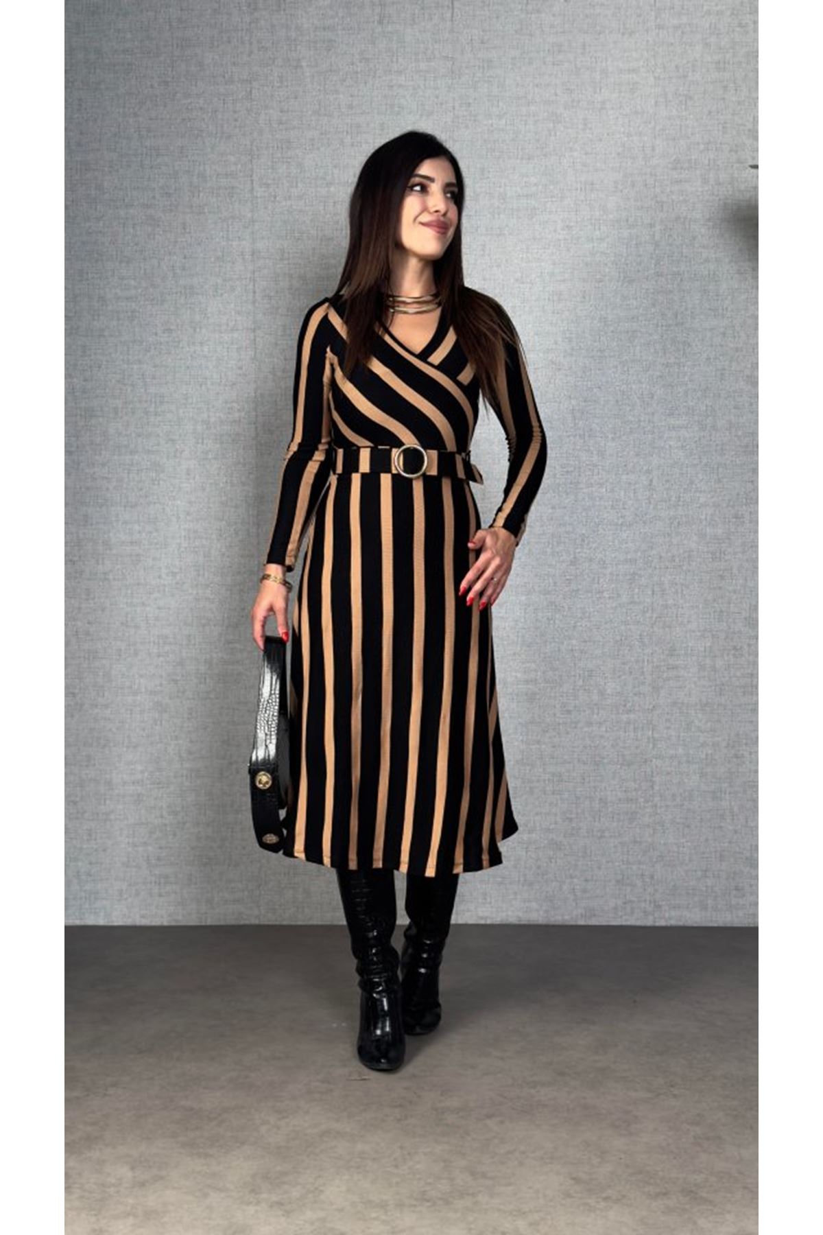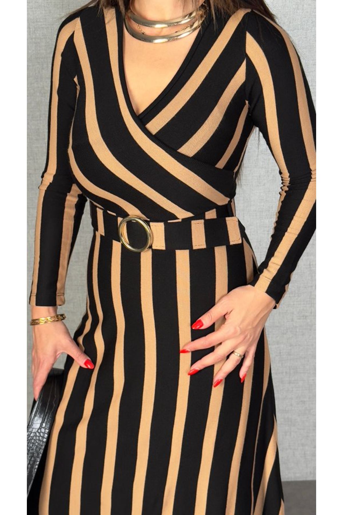 Kadın Uzun Kollu Kruvaze Yaka Kemer Dahil çizgili Triko Elbise