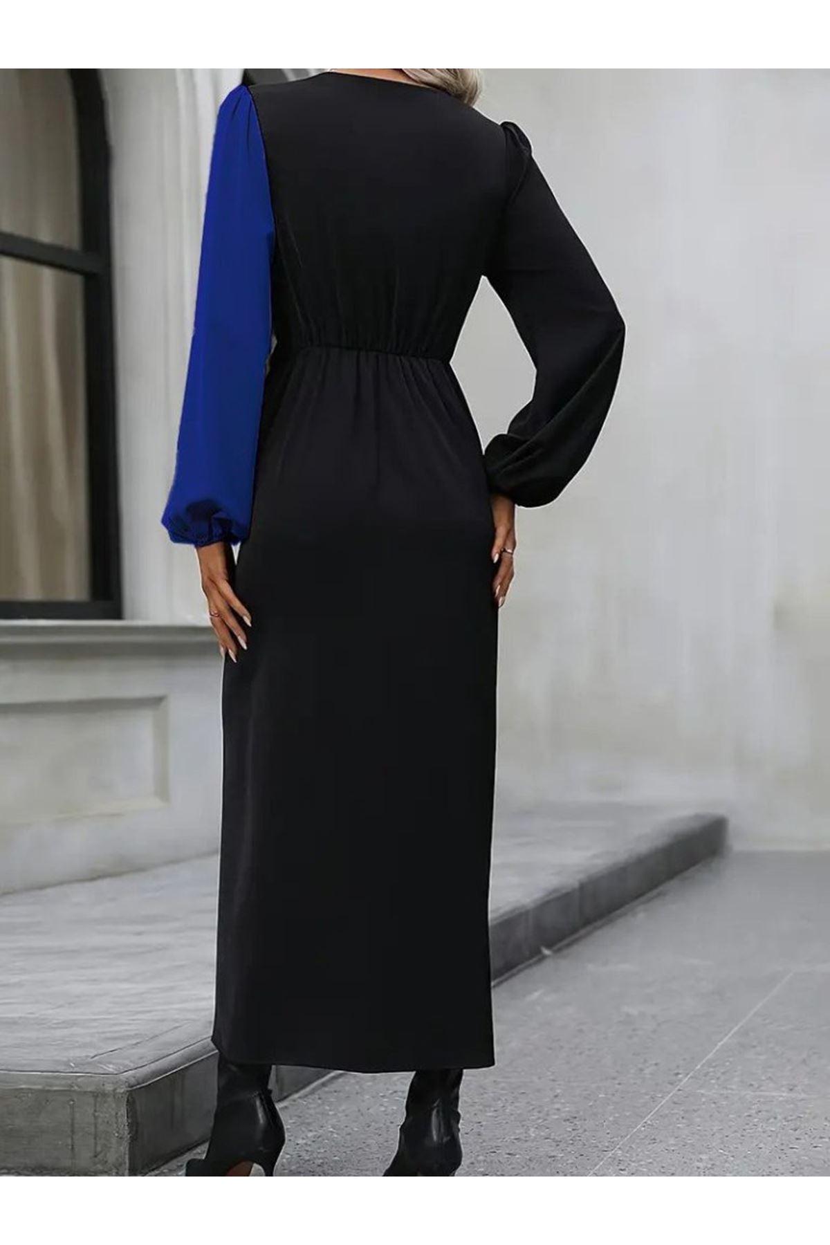 Kadın Uzun Kollu Kruvaze Yakalı Belden çapraz Detaylı çift Renkli Midi Ithal Krep Elbise
