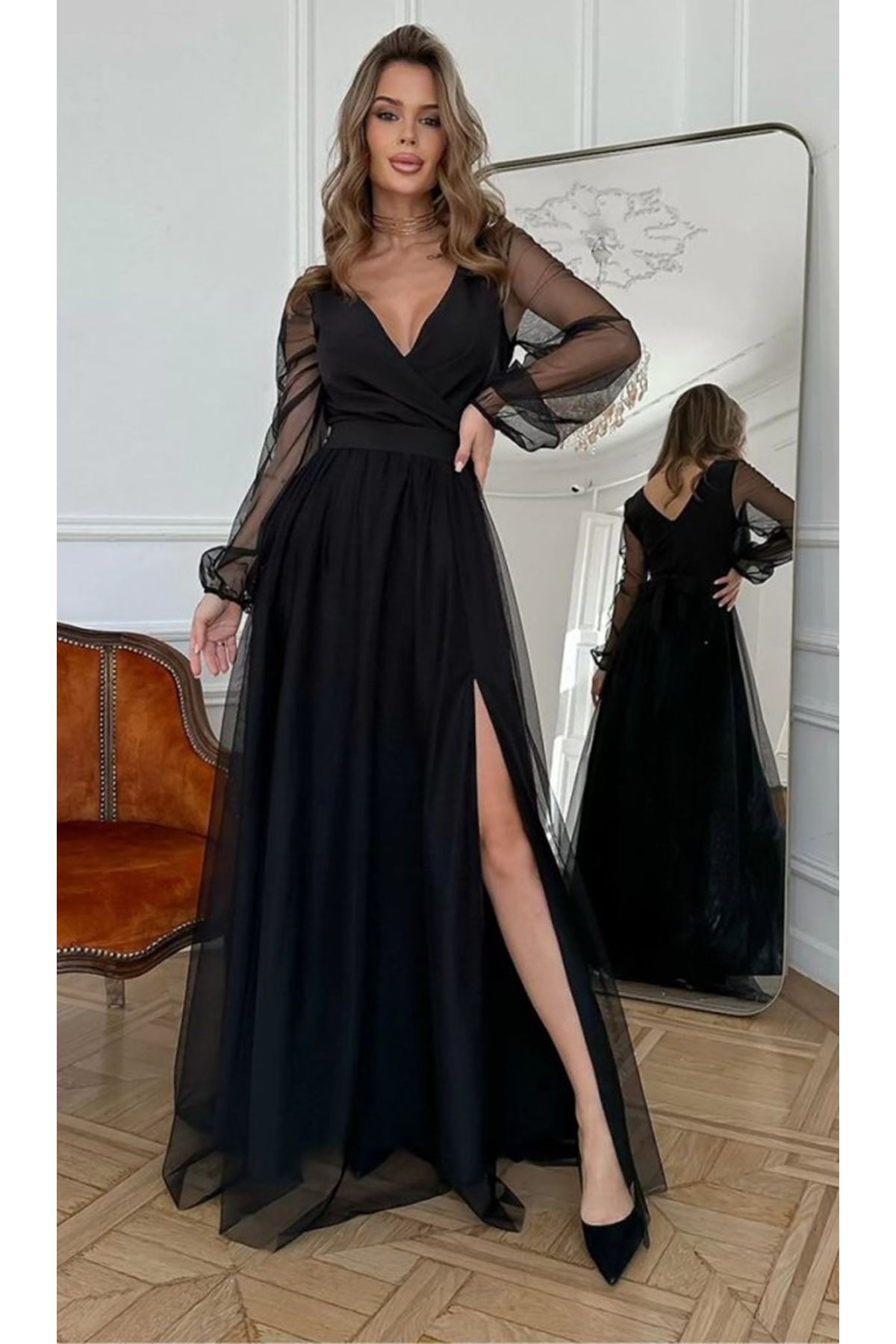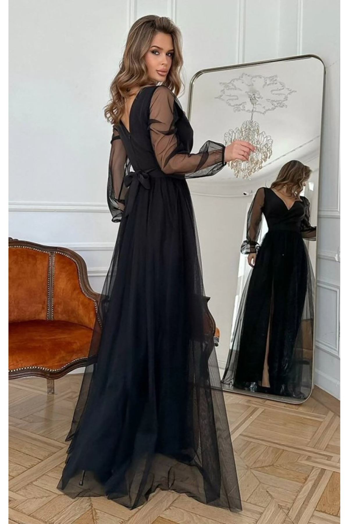 Kadın Uzun Kollu Kruvaze Yakalı Belden Kuşaklı Tüllü Uzun Ithal Krep Elbise