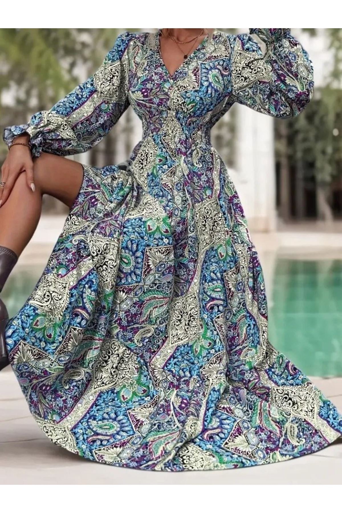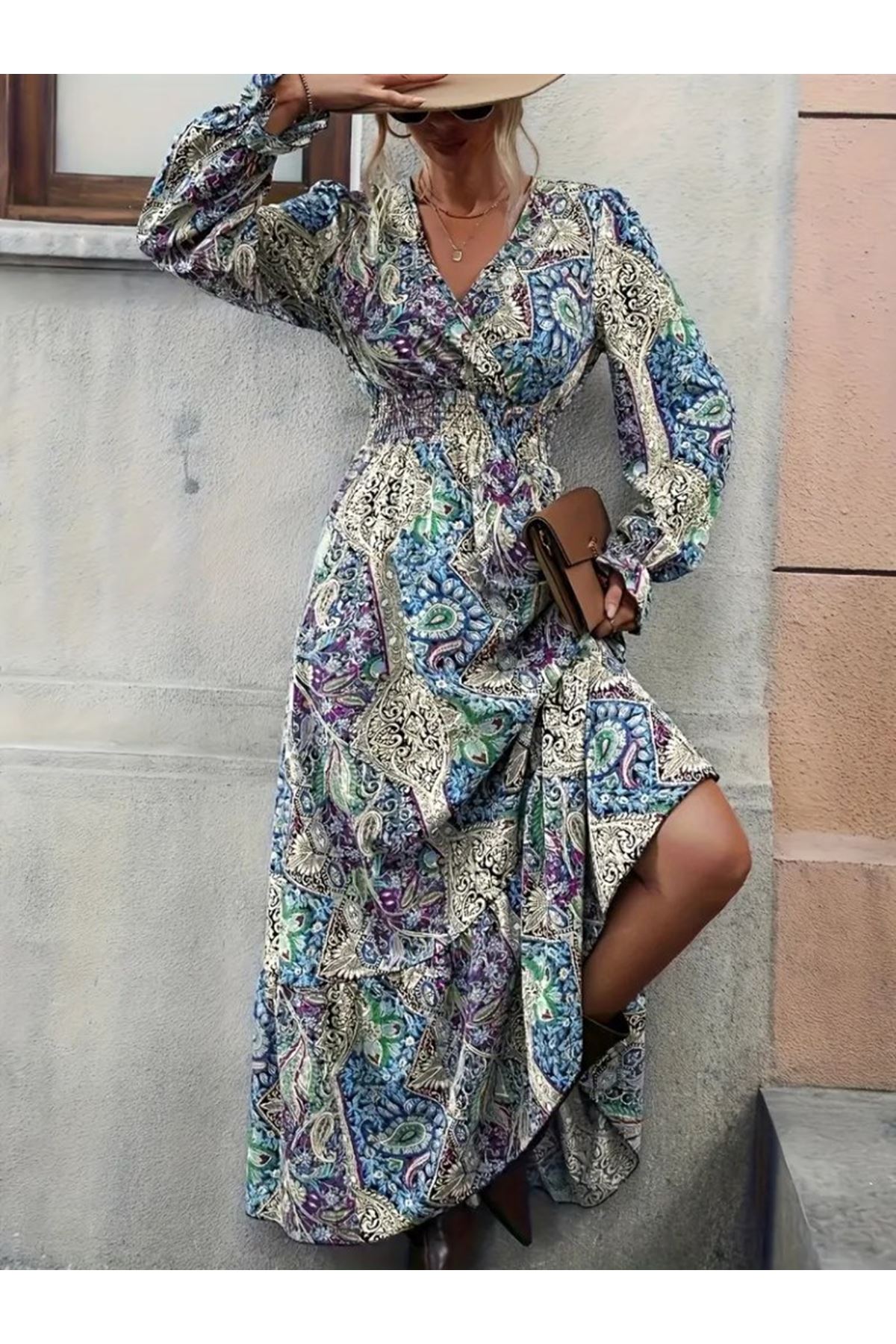 Kadın Uzun Kollu Kruvaze Yakalı Desenli Süprem Maxi Elbise