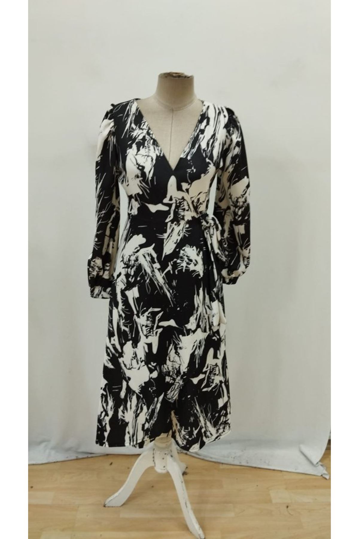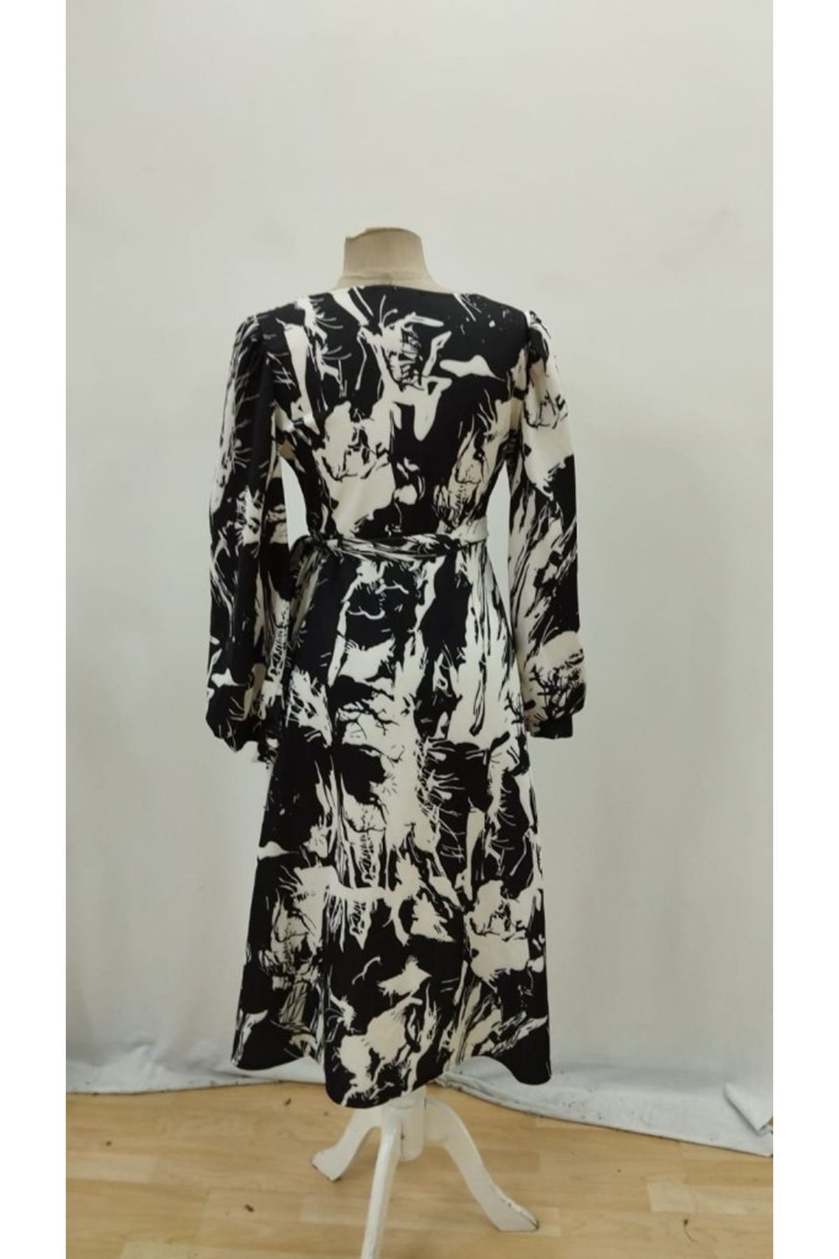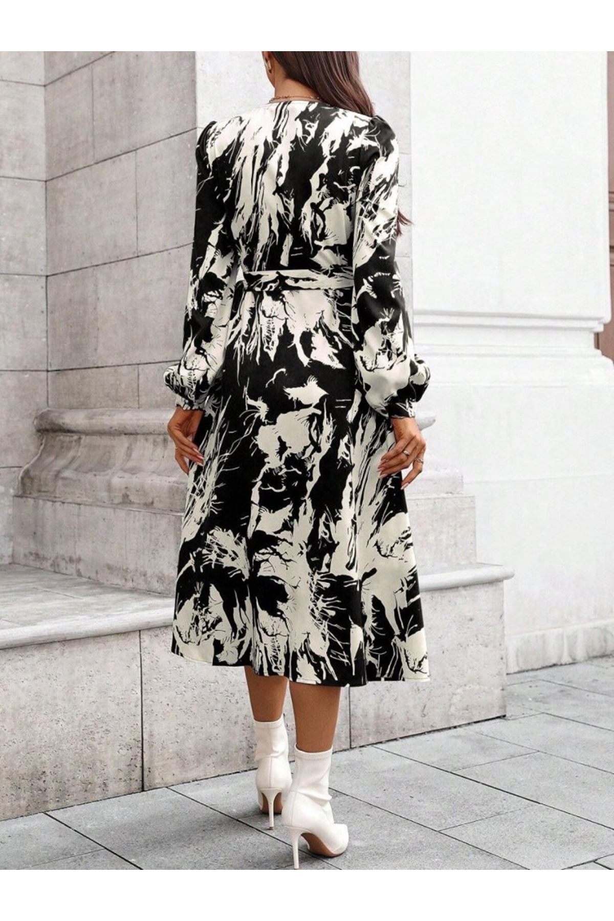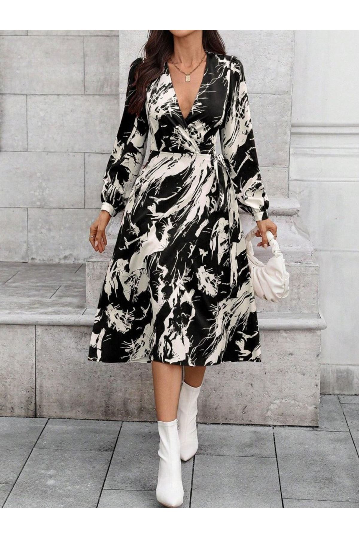 Kadın Uzun Kollu Kruvaze Yakalı Yandan Bağlamalı Desenli Mini Modal Elbise