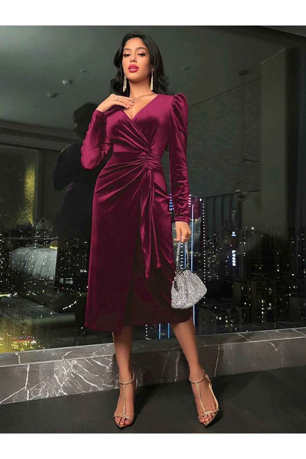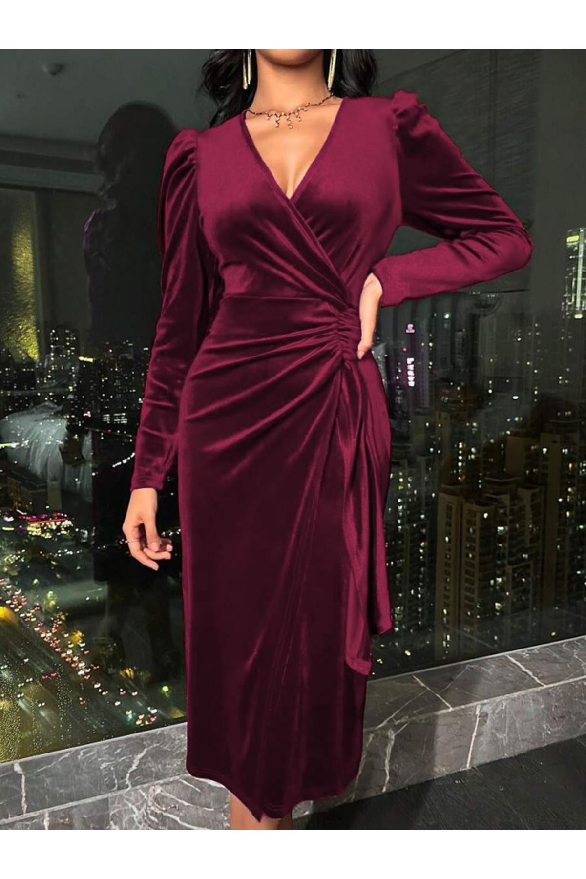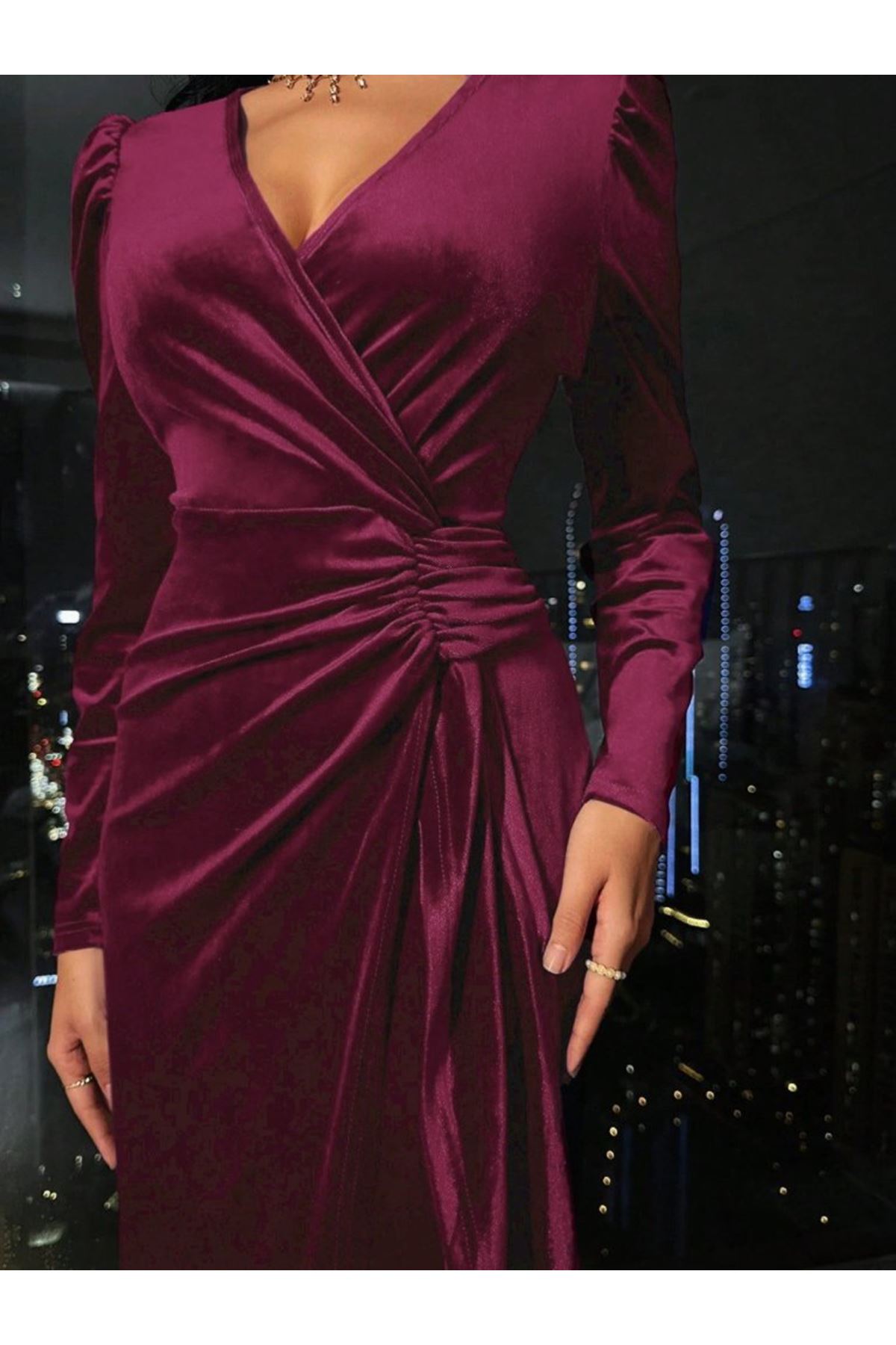 Kadın Uzun Kollu Kruvaze Yakalı Yandan Büzgülü Midi Kadife Elbise