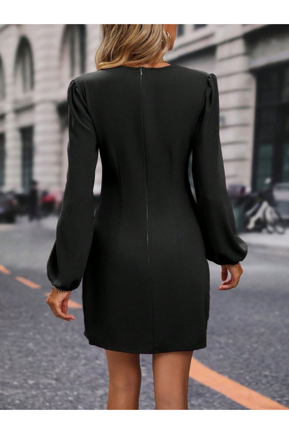 Kadın Uzun Kollu Kruvaze Yakalı Yanlardan Büzgü Detaylı Ithal Krep Kısa Elbise
