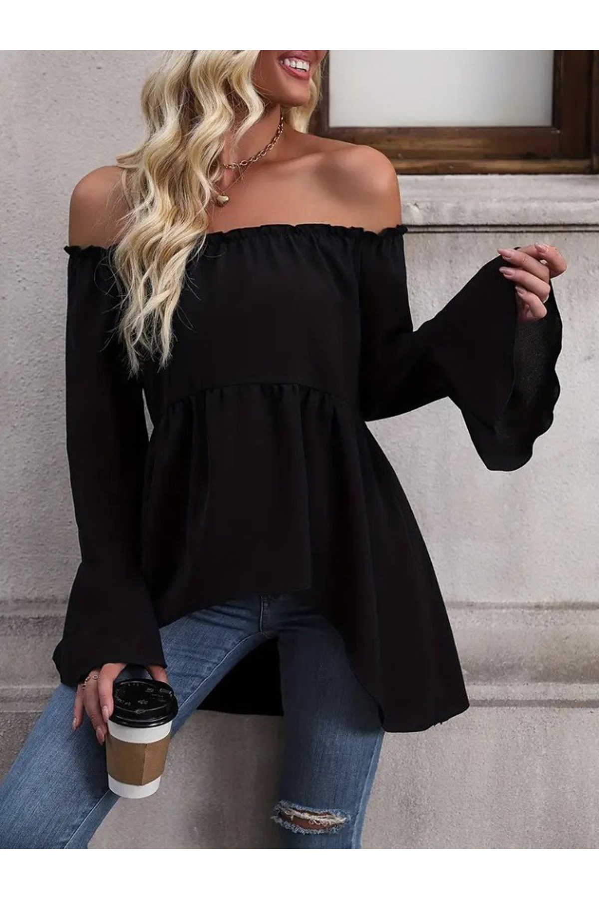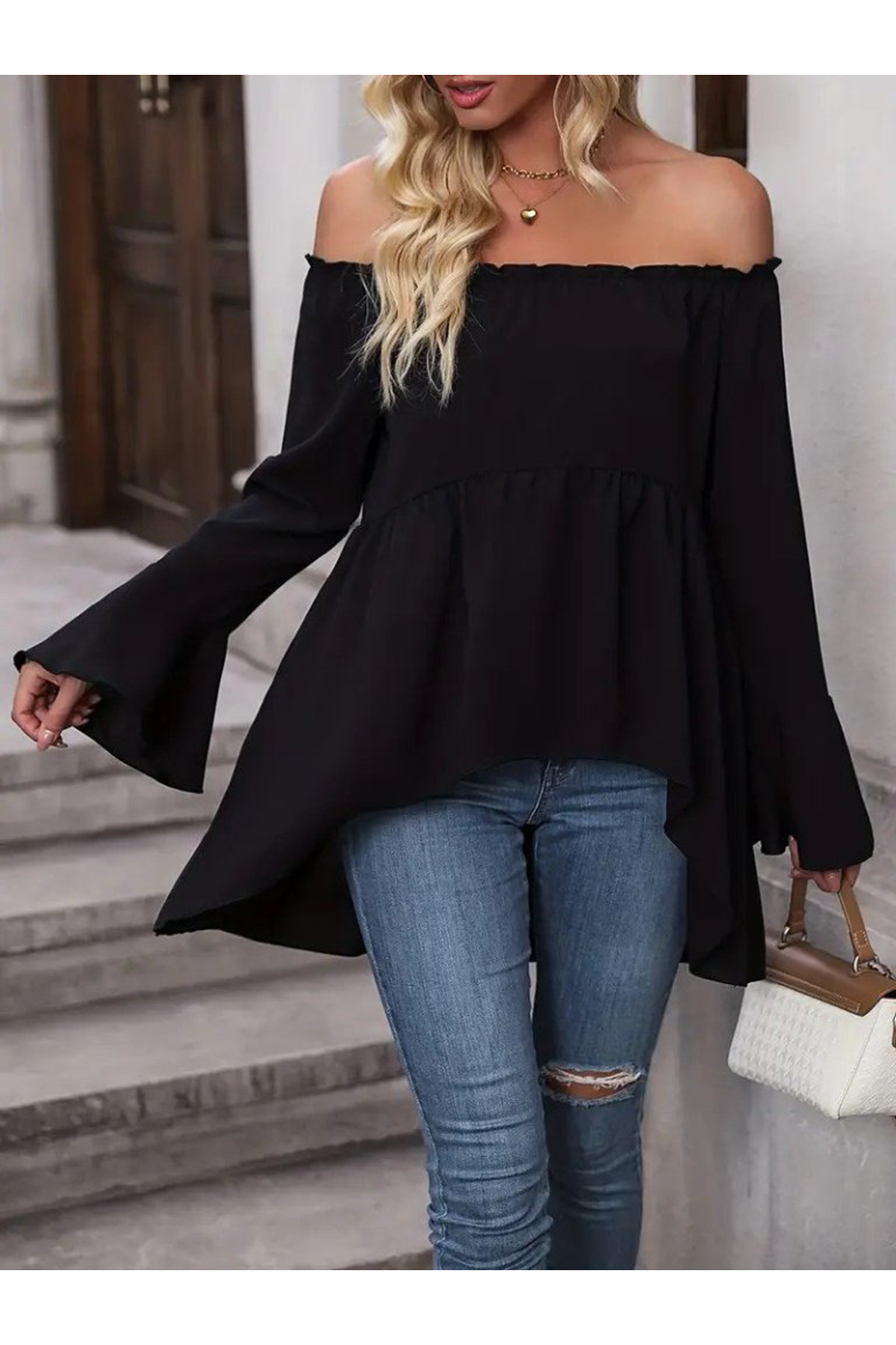 Kadın Uzun Kollu Madonna Yaka Asimetrik Detaylı Kolları Ispanyol Viskon Bluz