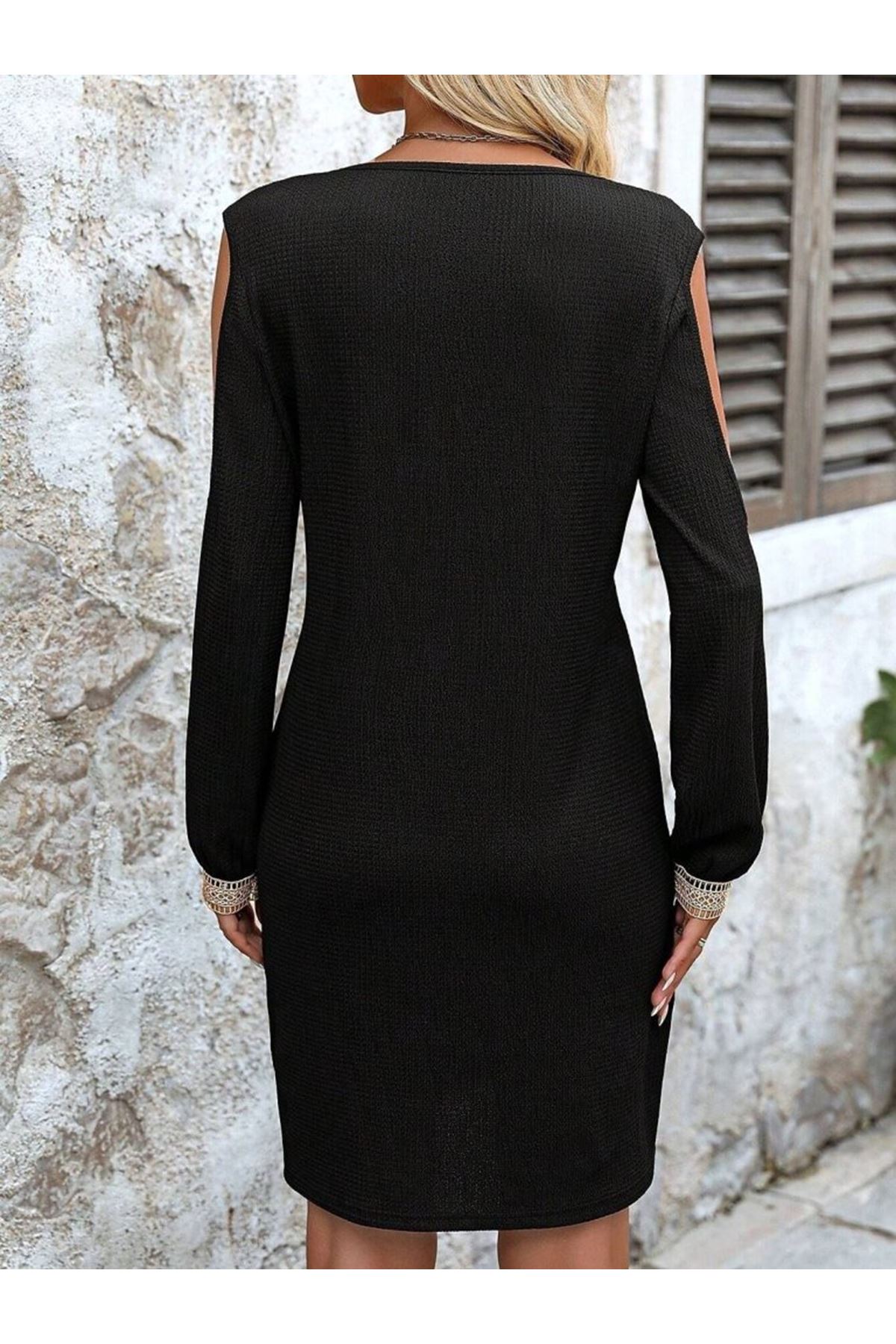 Kadın Uzun Kollu Omuzdan Açık V Dantel Yakalı Mini Waffle Elbise