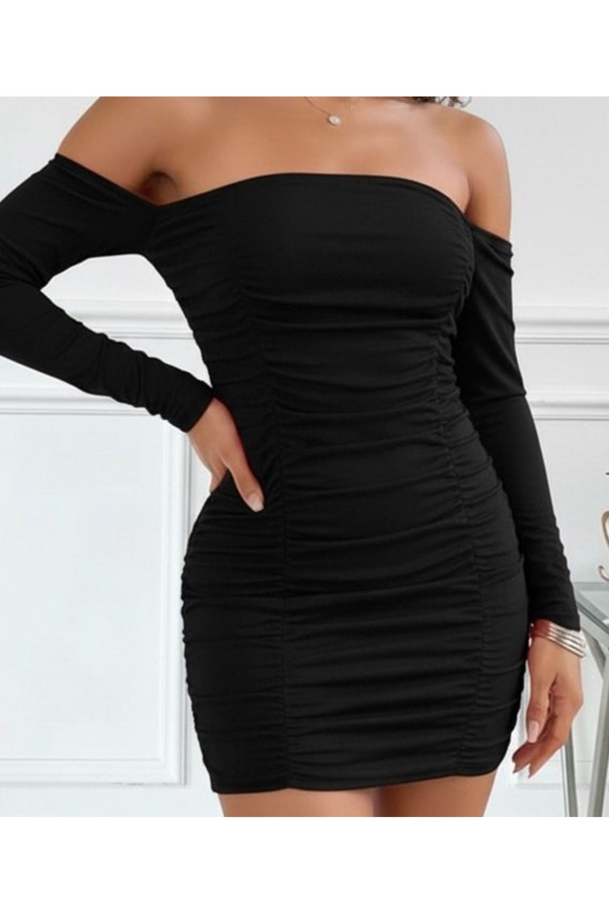 Kadın Uzun Kollu Omuzlardan Açık Takma Kollu Büzgülü Sandy Kısa Elbise