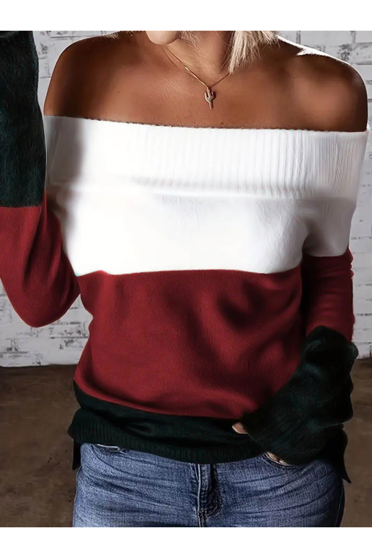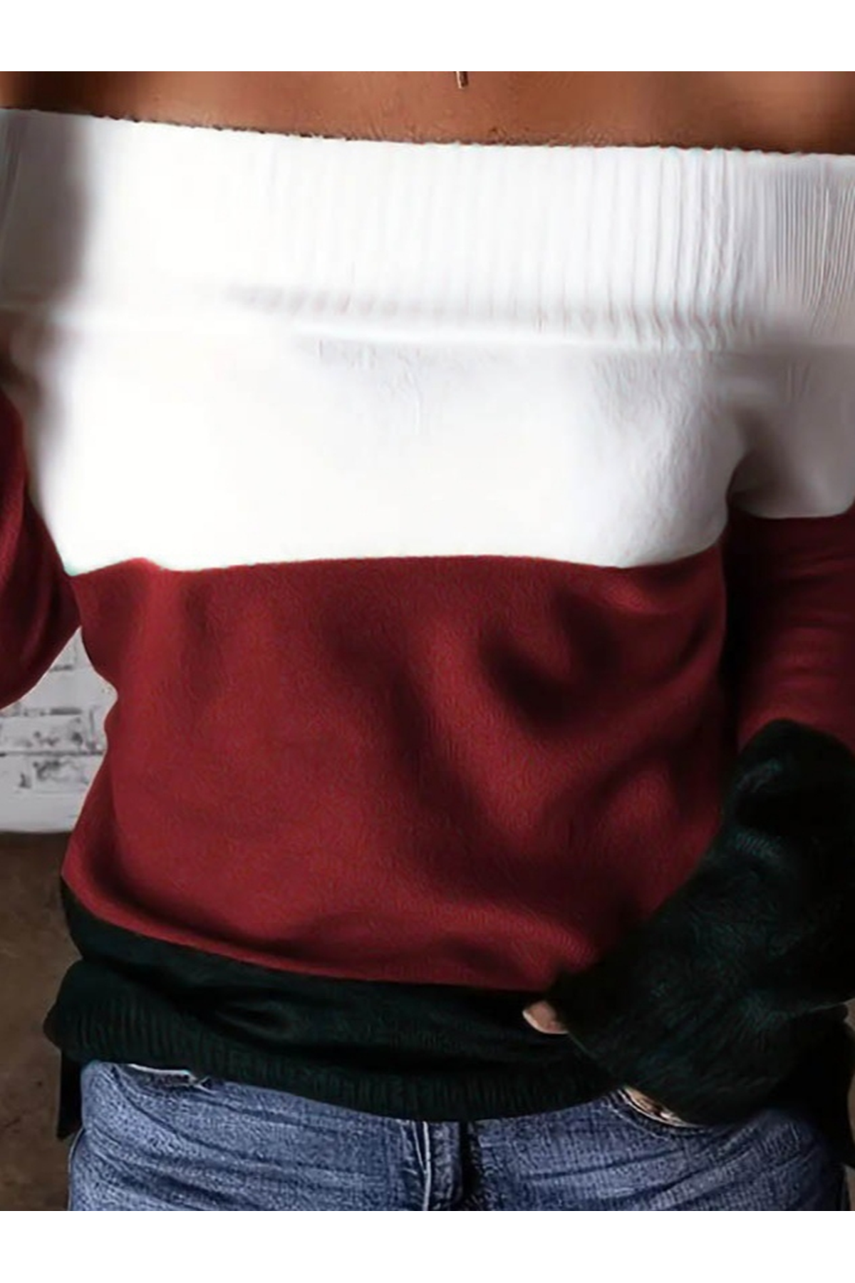 Kadın Uzun Kollu Omuzlardan Açık Uzun Kollu Blok çizgili Triko Bluz