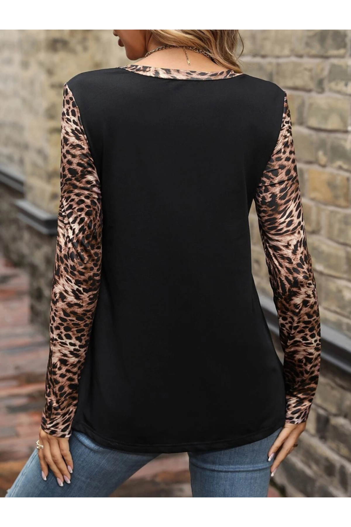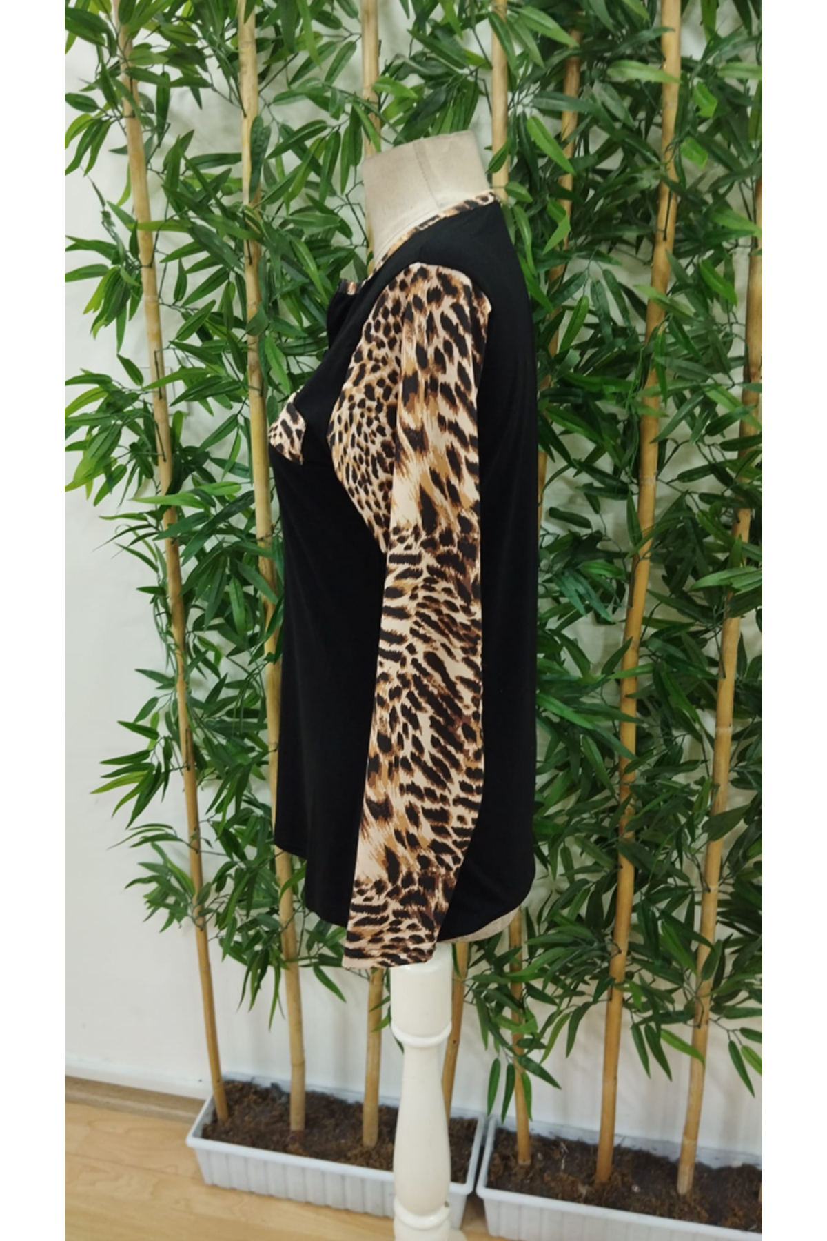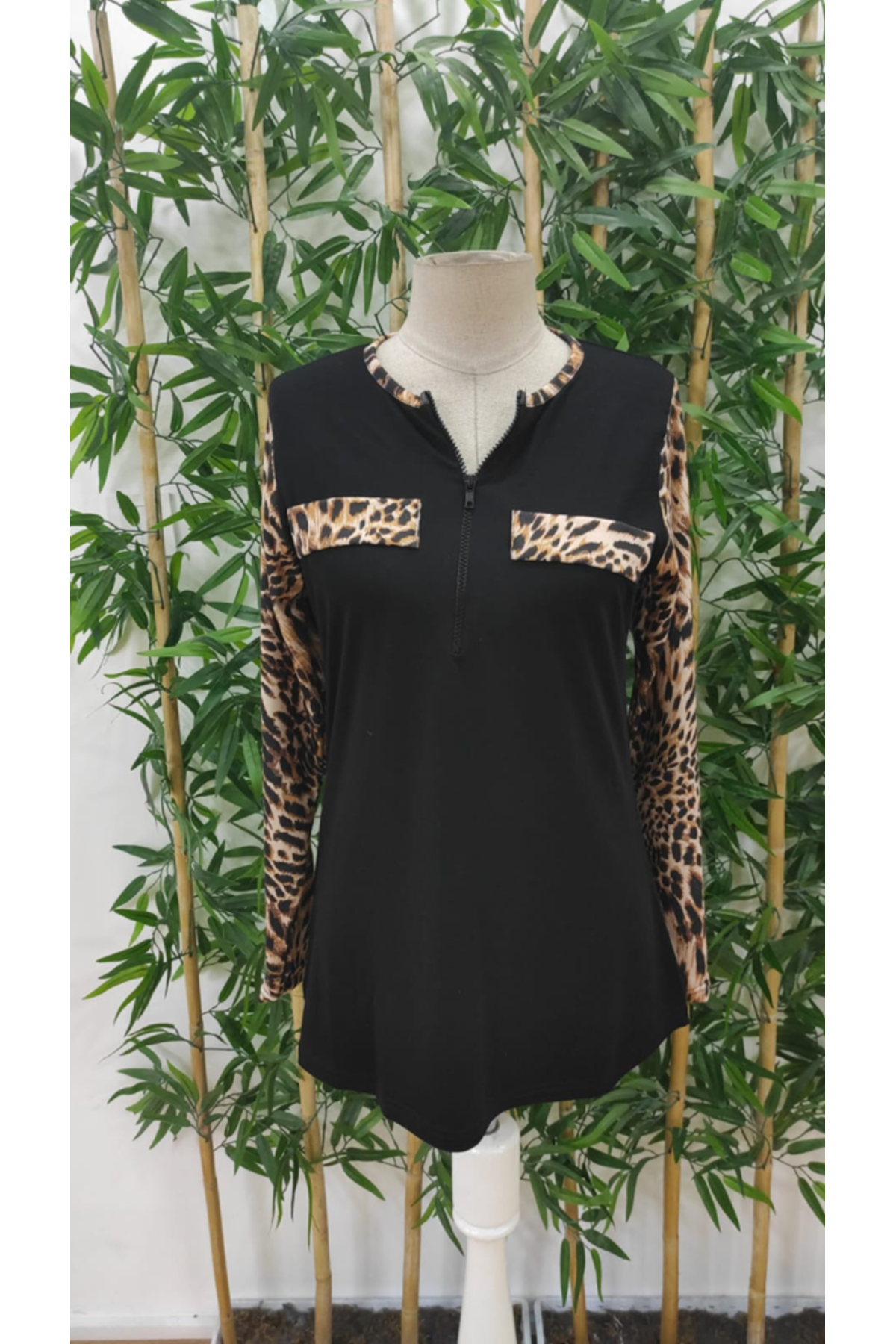Kadın Uzun Kollu önden Fermuarlı Cepli Leopar Detaylı Viskon