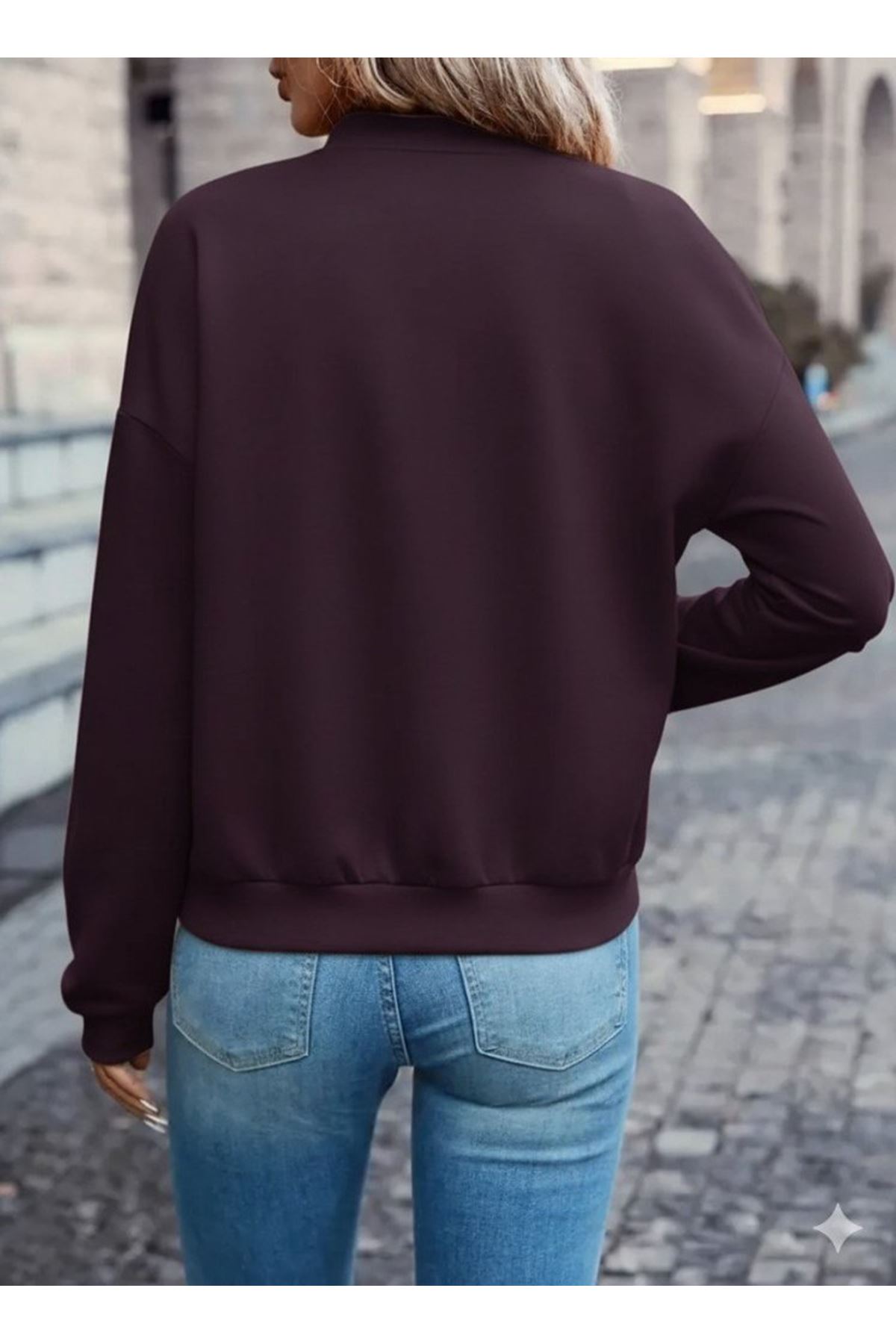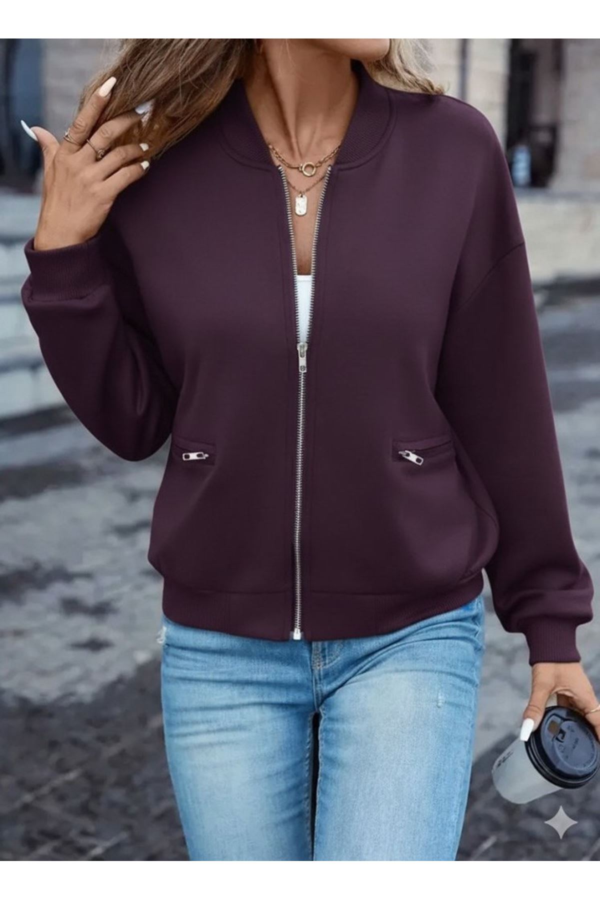 Kadın Uzun Kollu önden Fermuarlı Cepli Modal Mürdüm Ceket