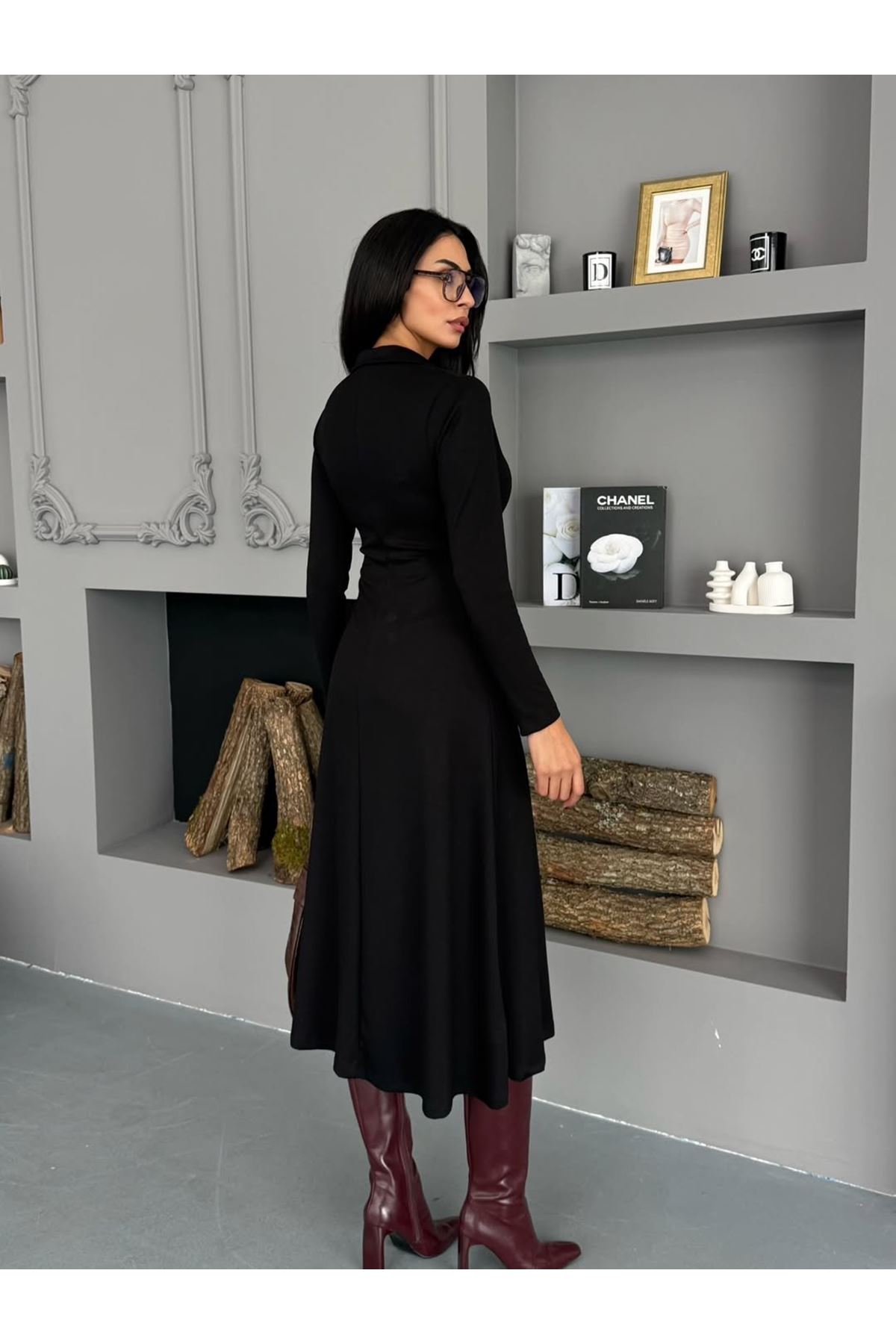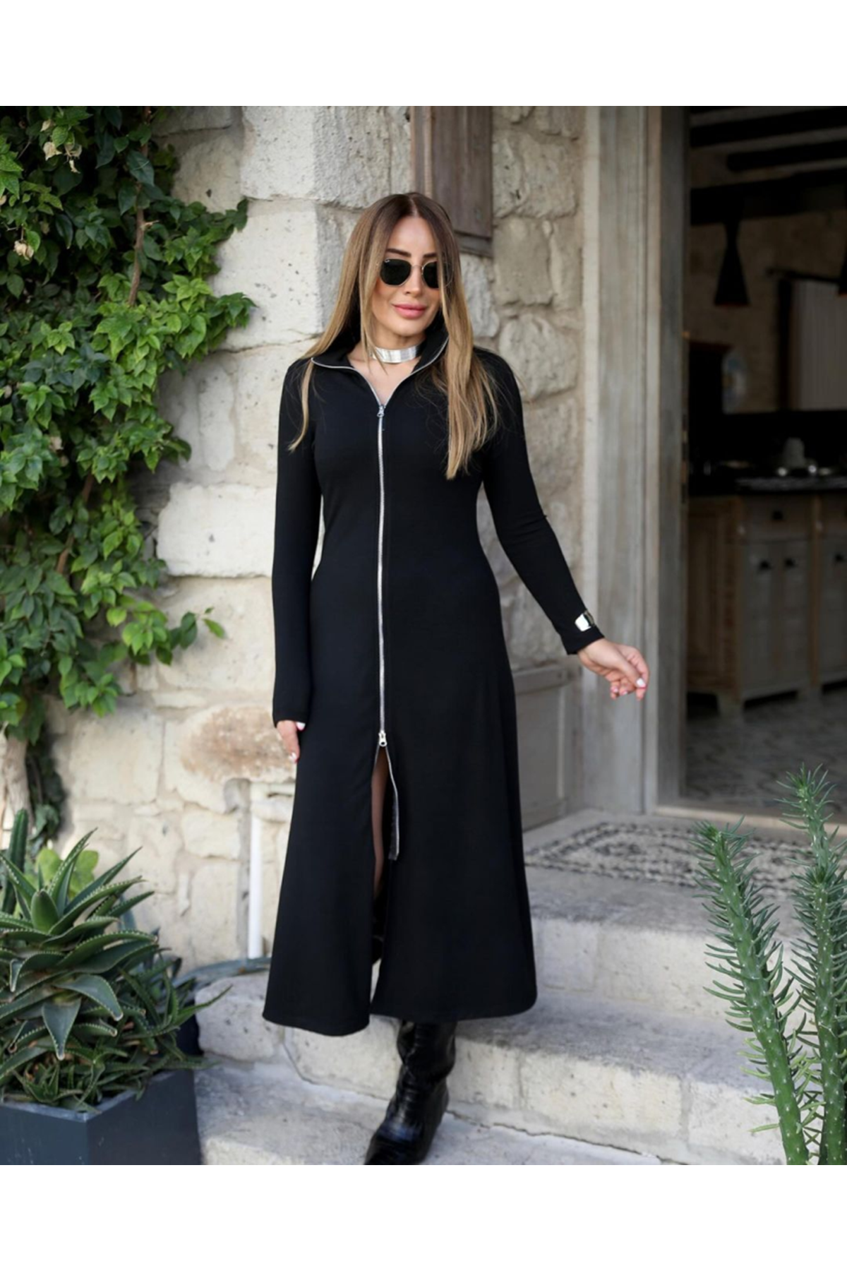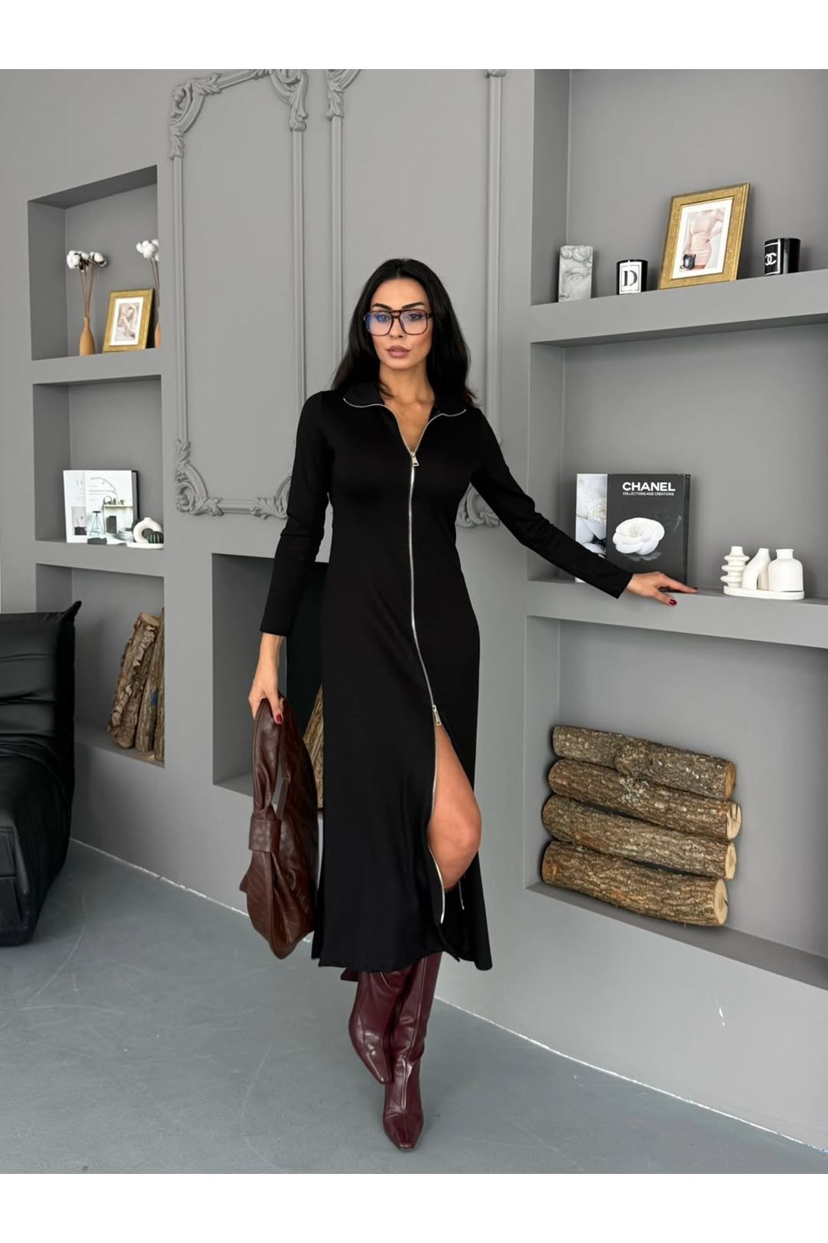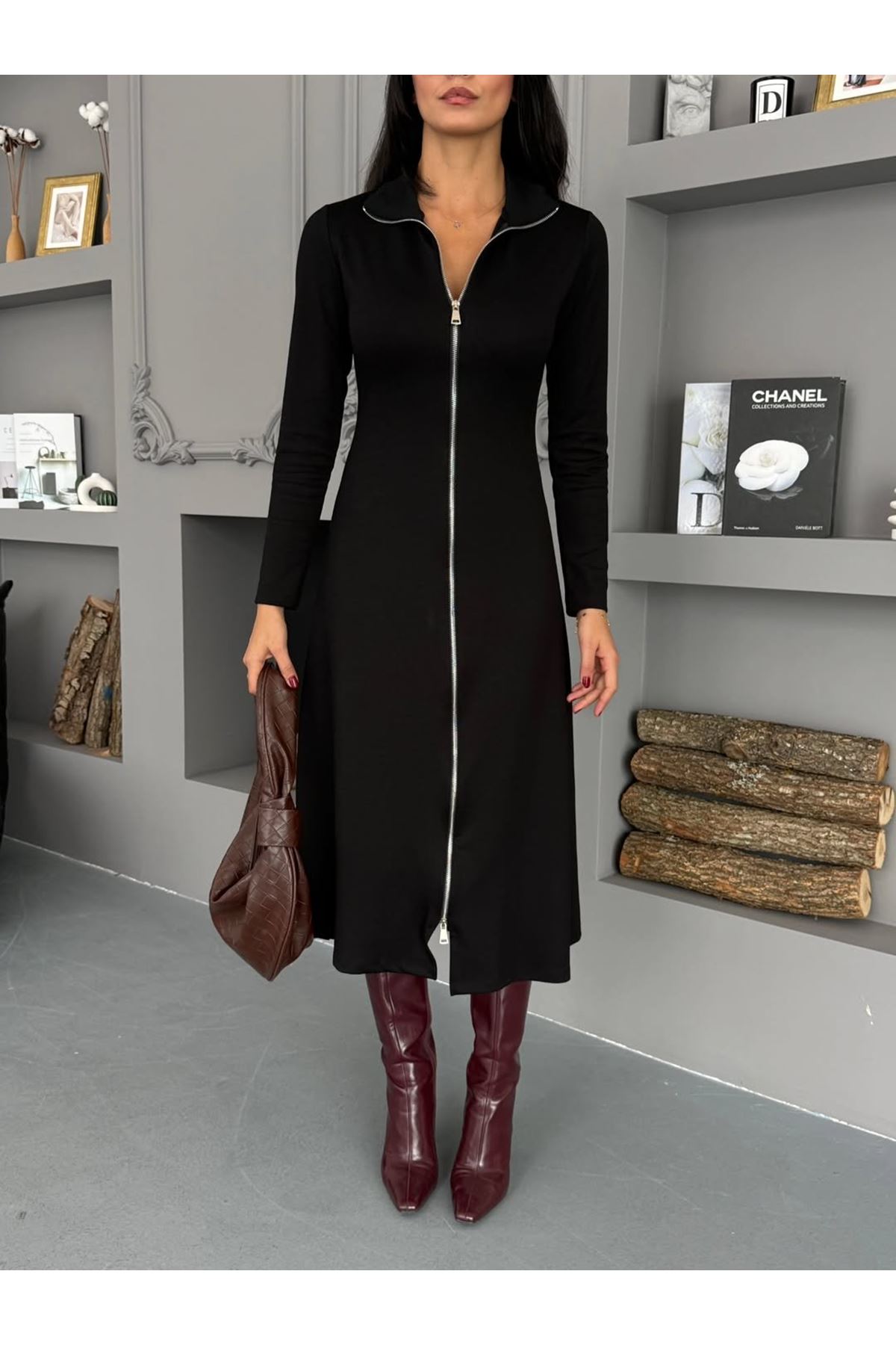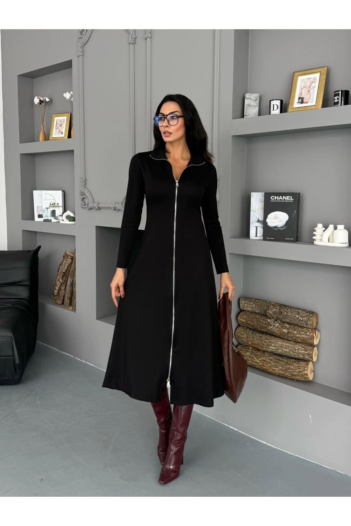 Kadın Uzun Kollu önden Fermuarlı Maxi Viskon Iki Iplik Elbise