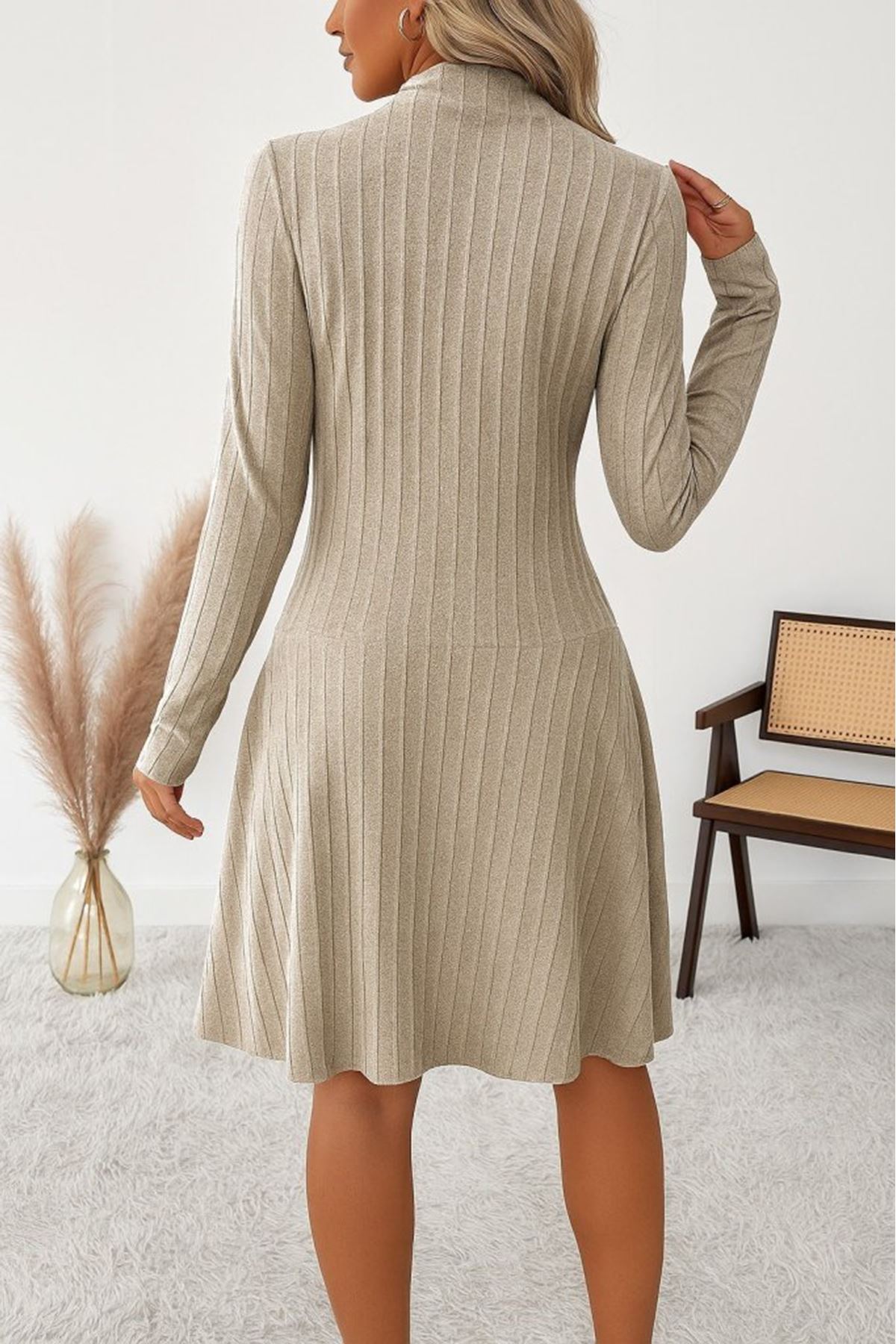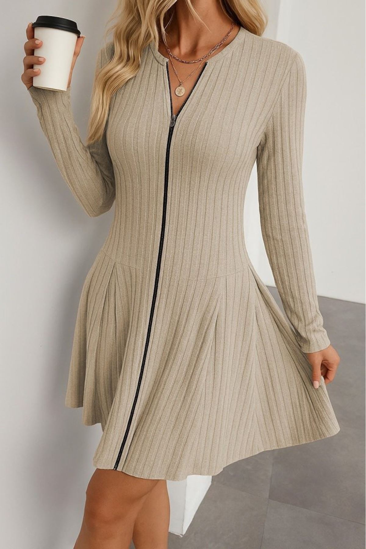 Kadın Uzun Kollu önden Fermuarlı Pileli şardonlu Kaşkorse Mini Elbise
