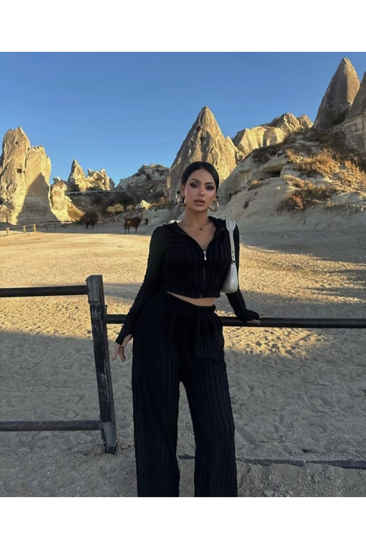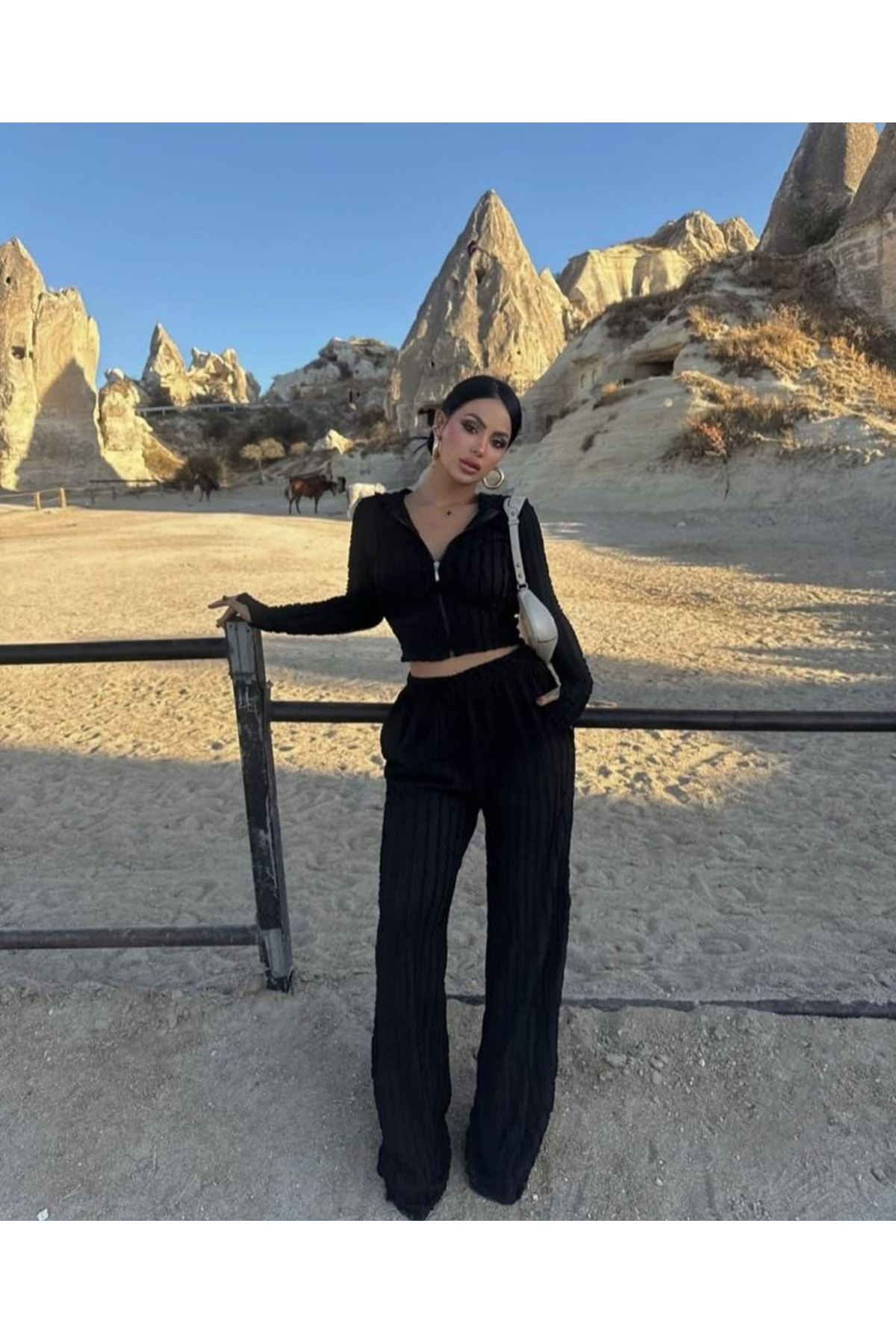Kadın Uzun Kollu Parmak Geçme Ve Fermuar Detay Kısa Ceket Ve İspanyol Paça Pantolon Ikili Takim