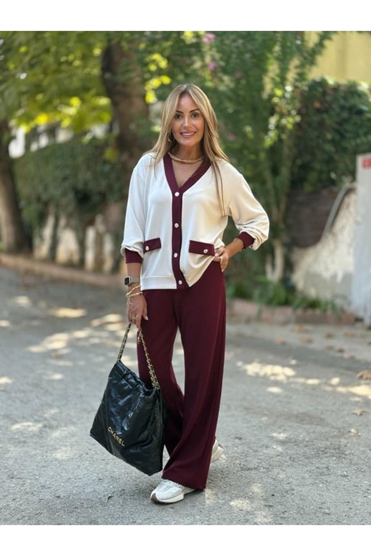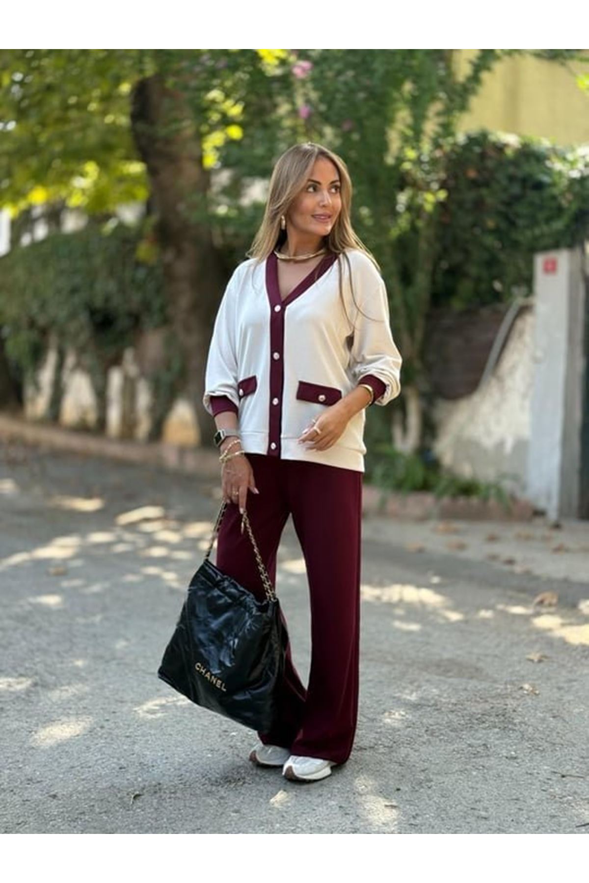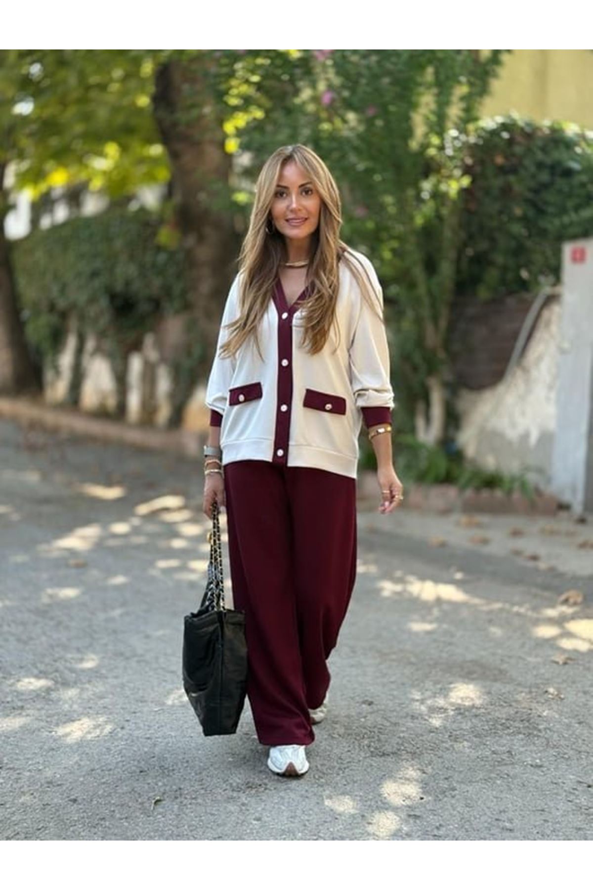 Kadın Uzun Kollu Ribanali Cep Detay Hırka Ve Bol Paça Pantolon Ikili Takım