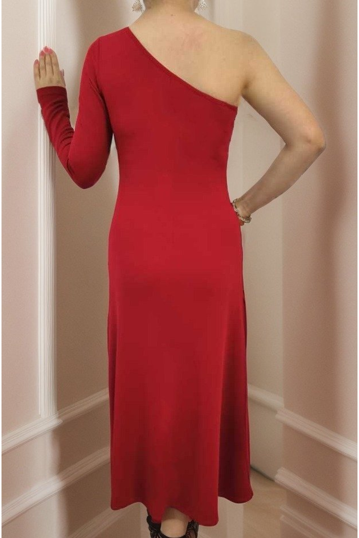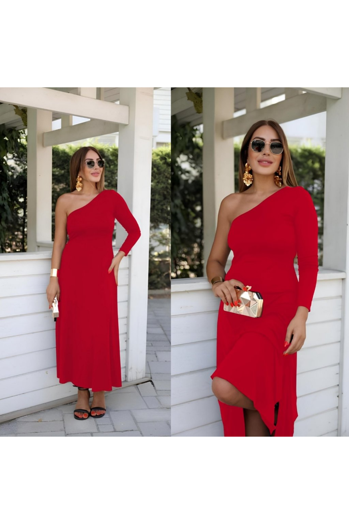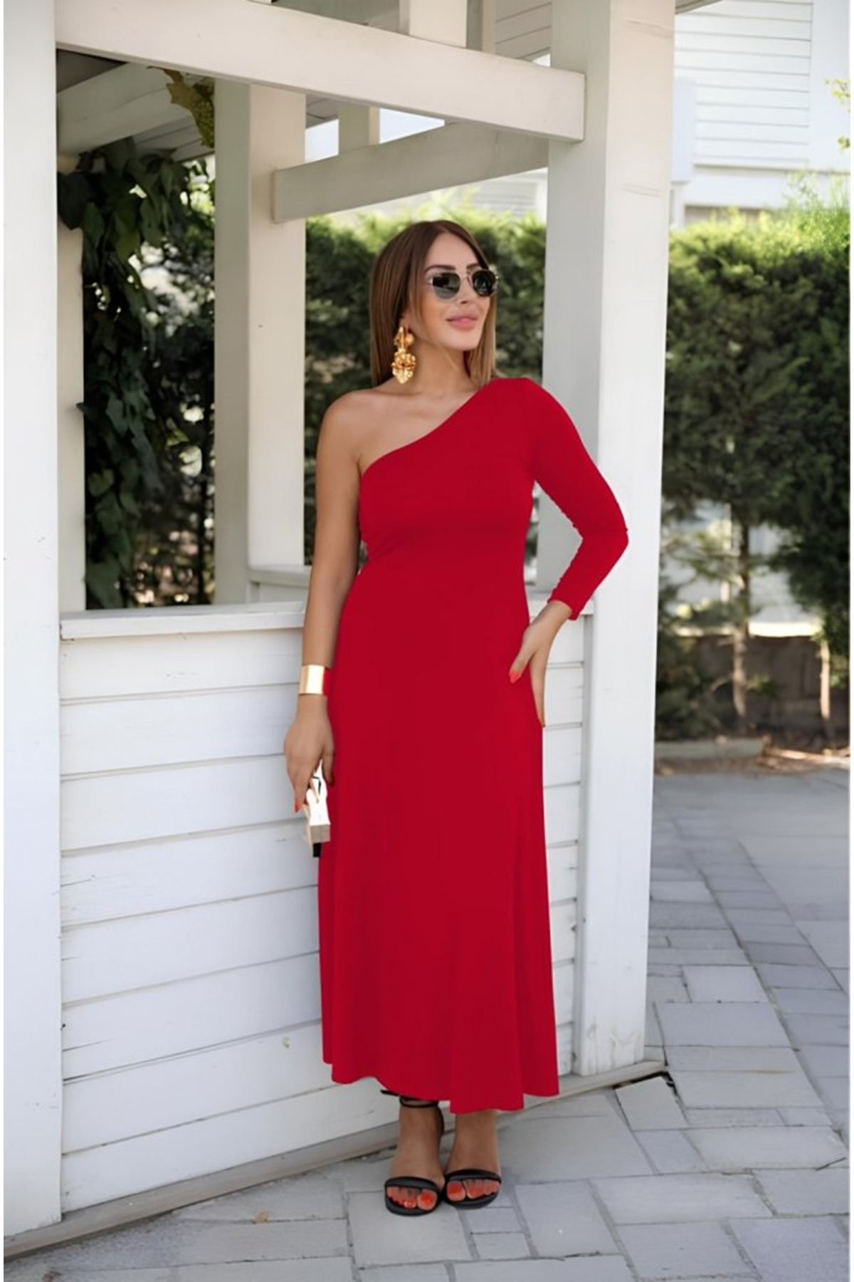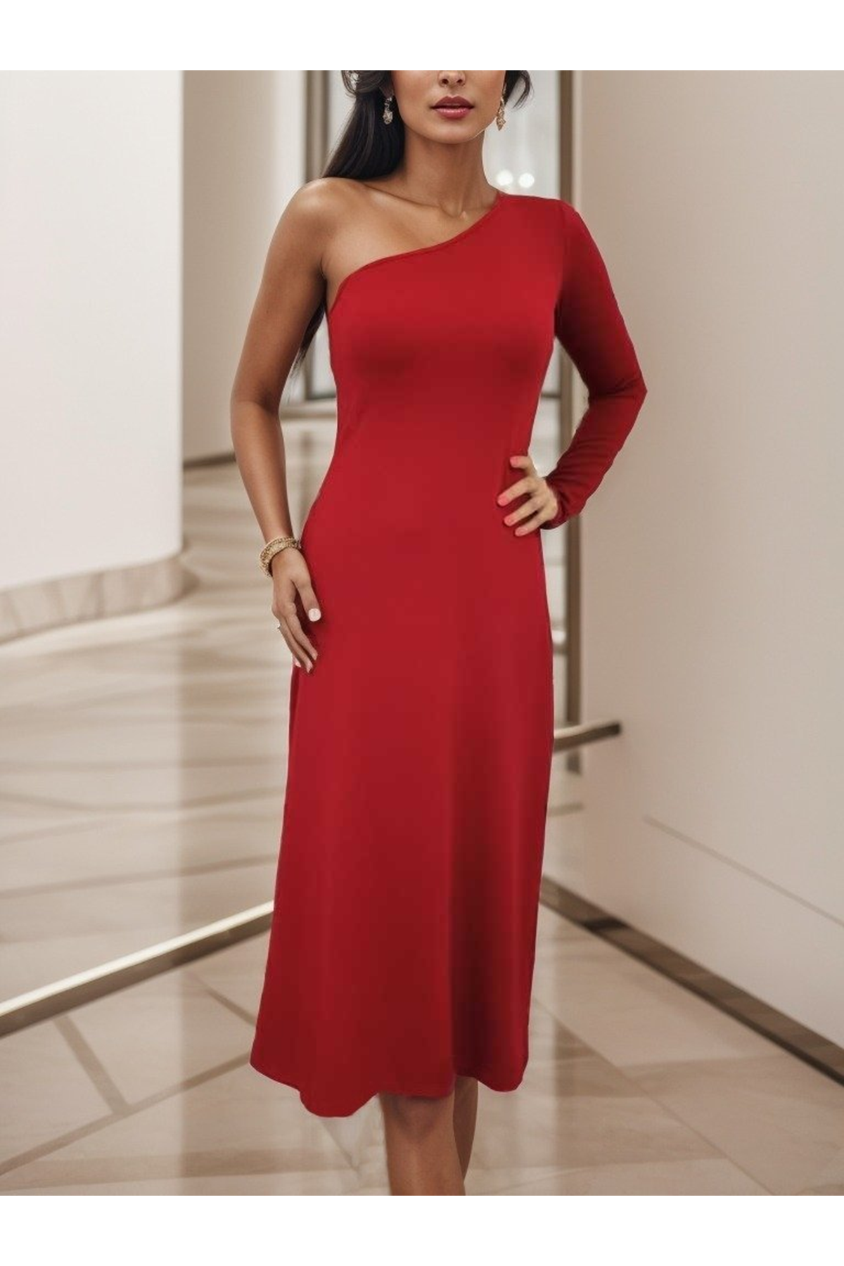 Kadın Uzun Kollu Tek Omuz Detay Krep Elbise