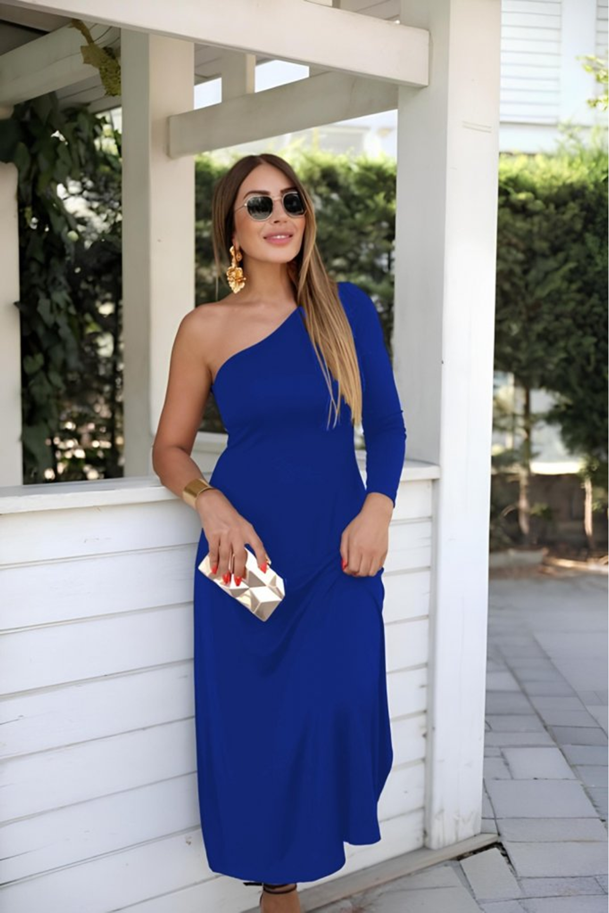 Kadın Uzun Kollu Tek Omuz Detay Krep Elbise