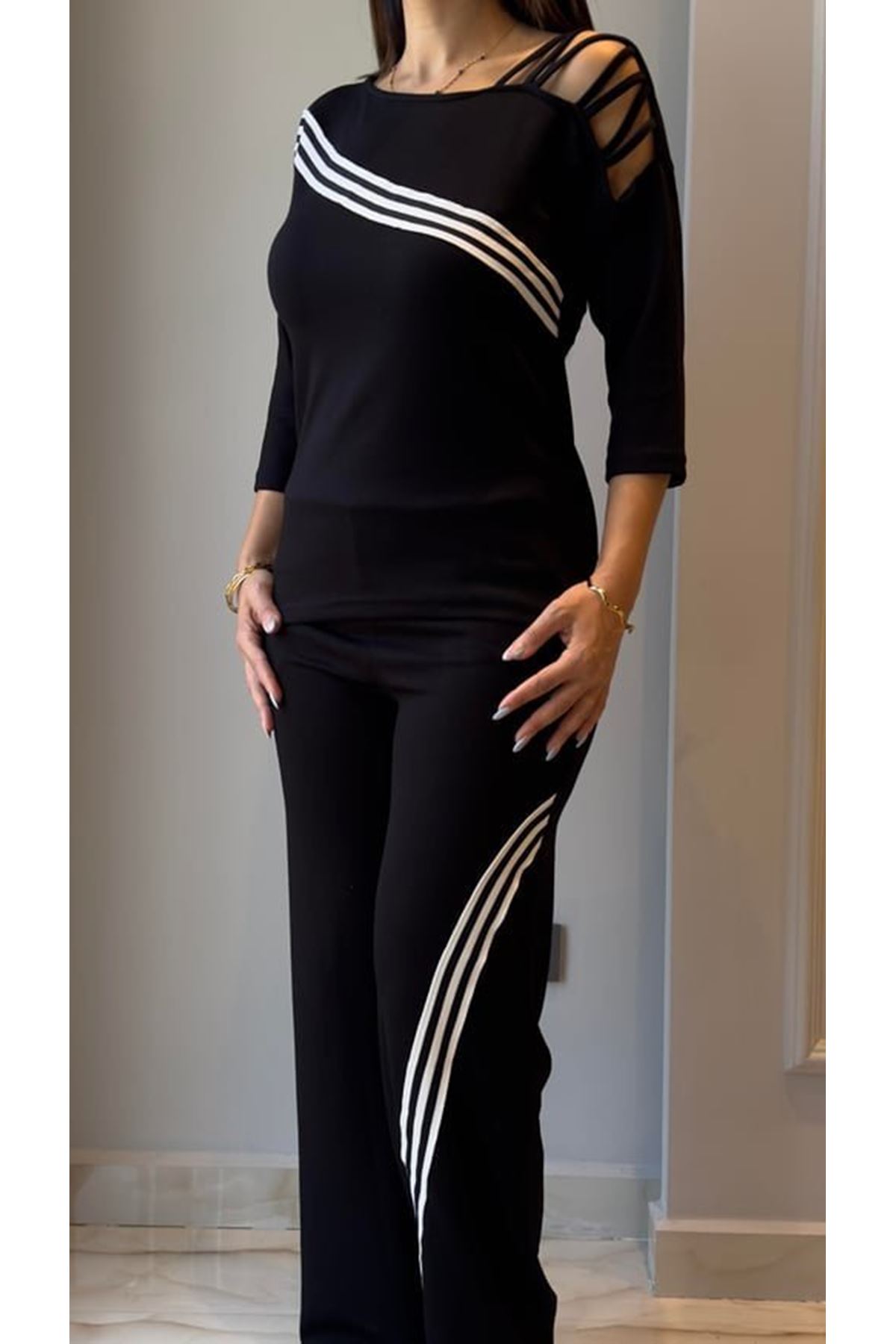 Kadın Uzun Kollu Truvakar Kol Tek Omuz çapraz şerit Detaylı Ribanalı Viskon Iki Iplik Bluz Ve Pantolon Ikili Takım