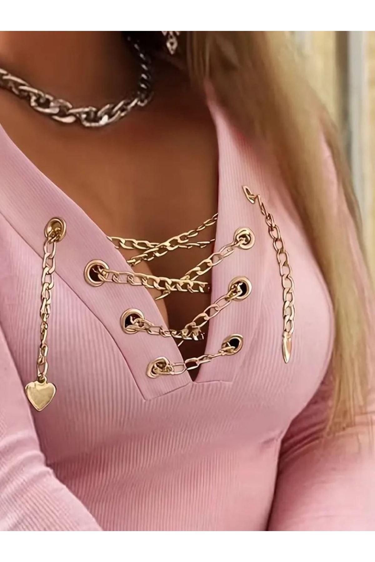 Kadın Uzun Kollu V çapraz Zincir Detaylı Kaşkorse Bluz