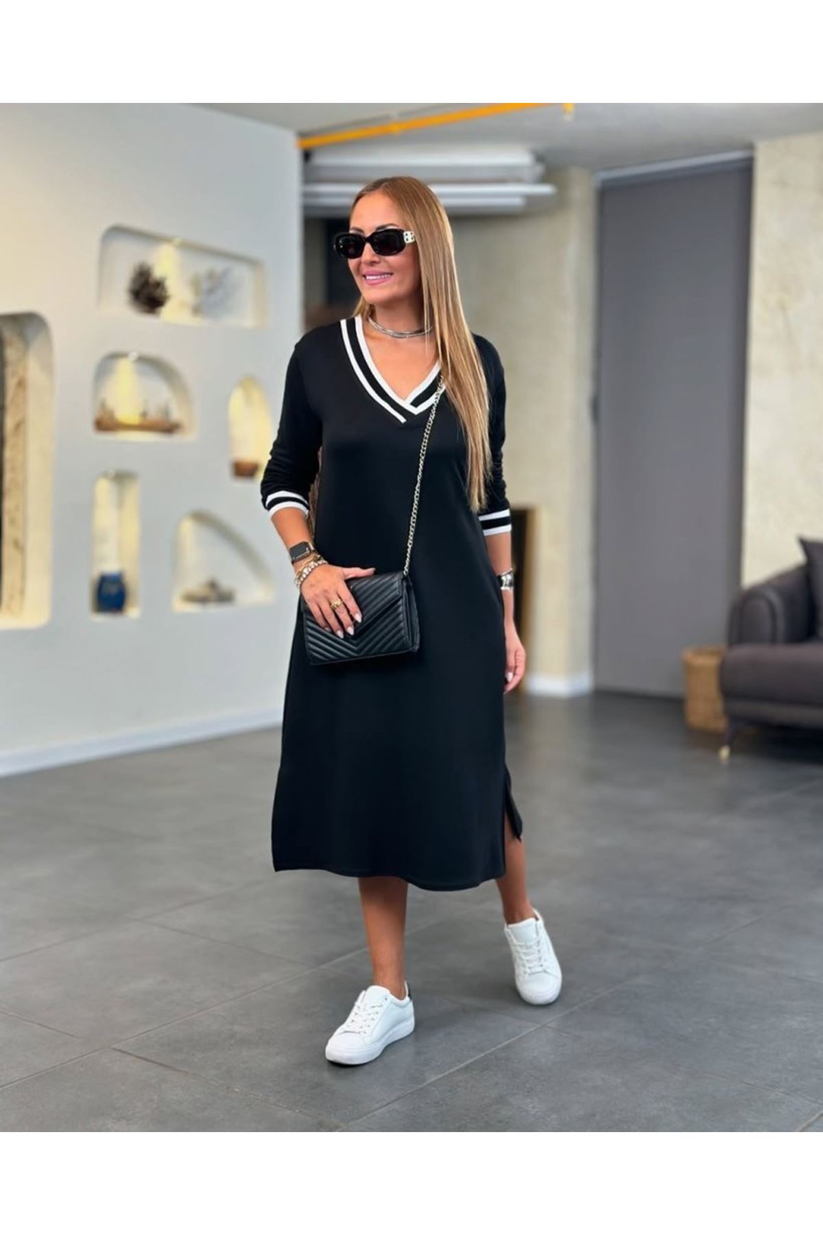 Kadın Uzun Kollu V Ribana Yakalı Yanlardan Yırtmaçlı Midi Viskon Iki Iplik Elbise