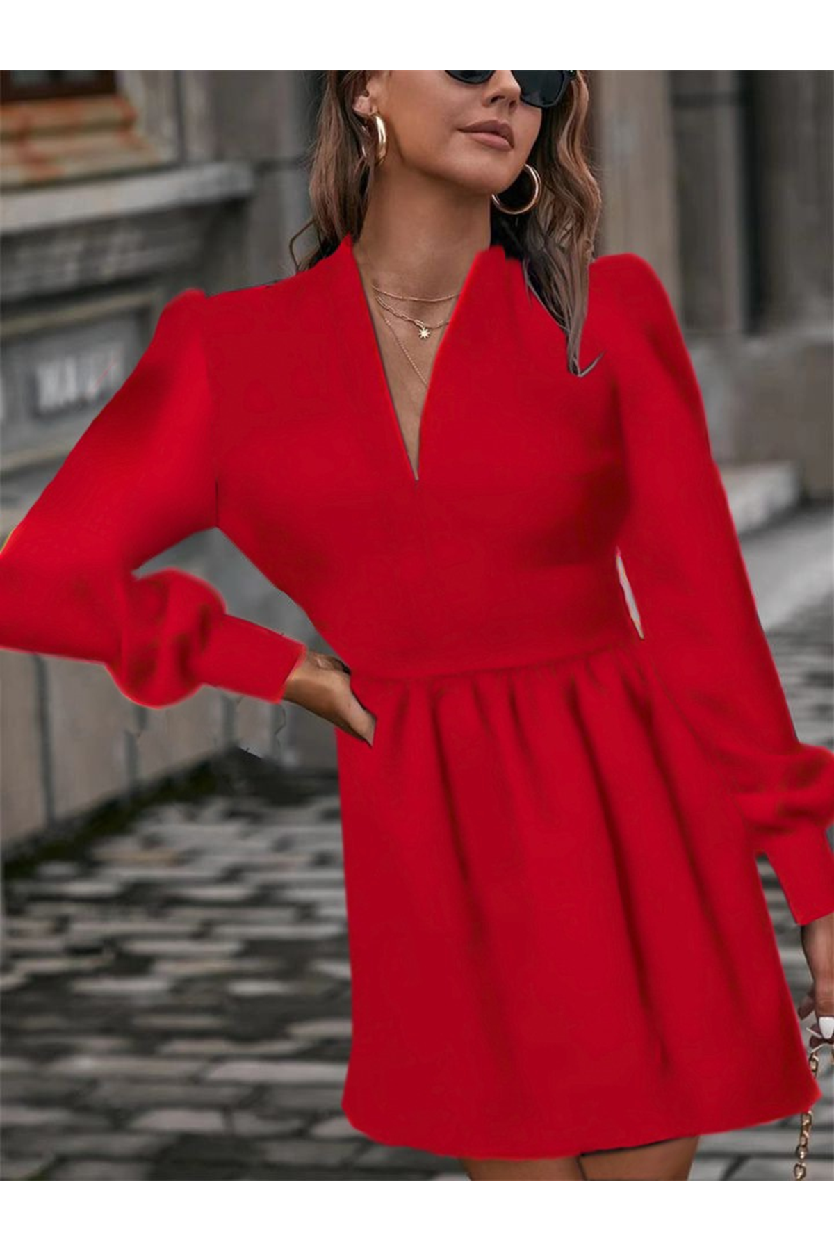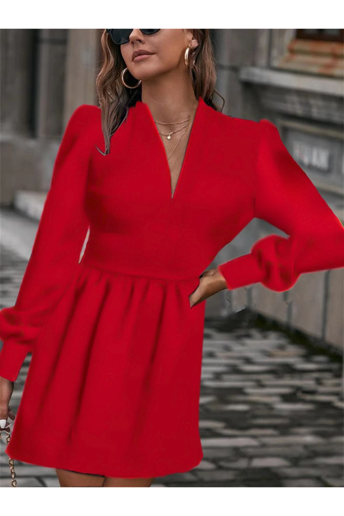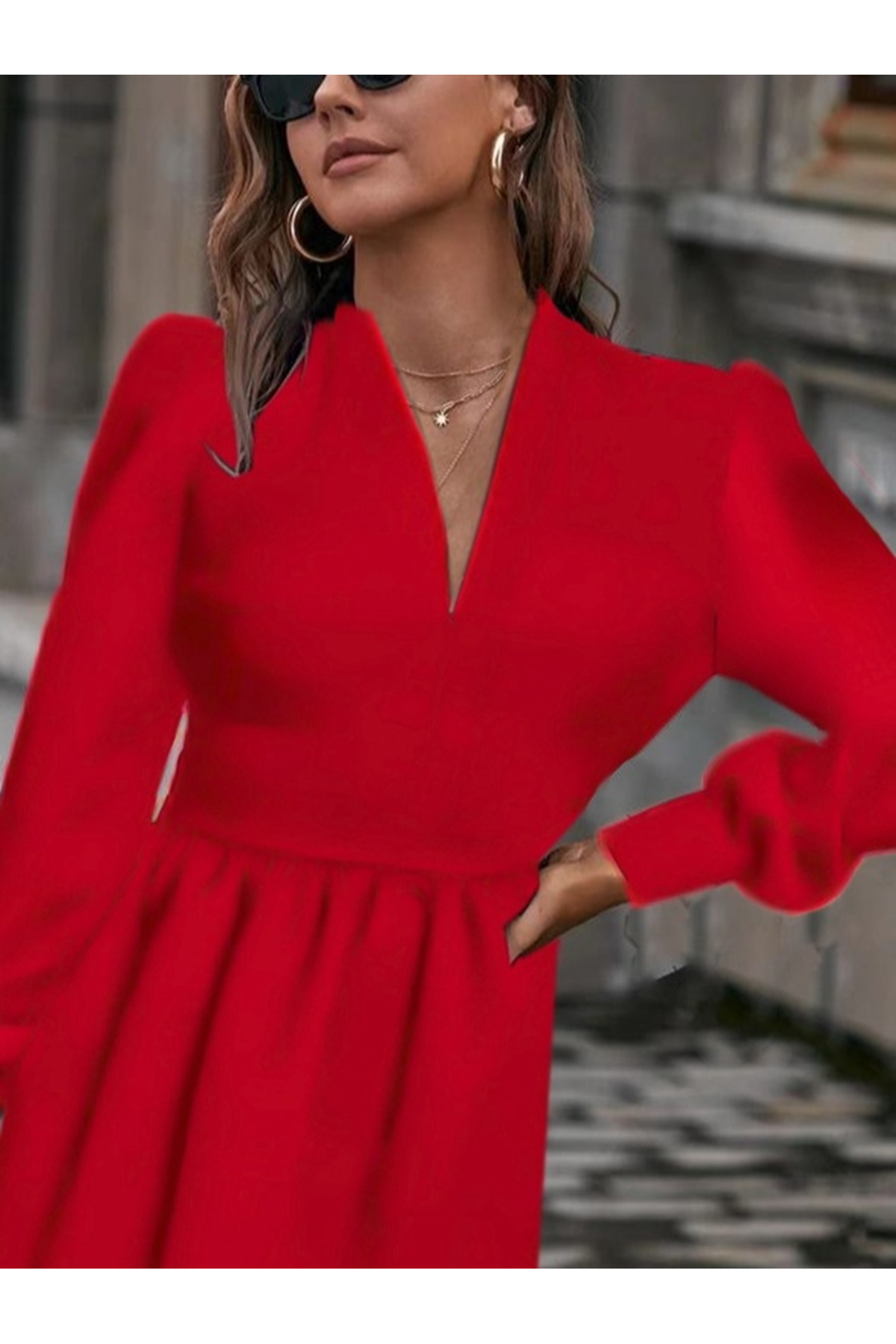 Kadın Uzun Kollu V Yaka Belden Hafif Pileli Scuba Krep Mini Boy Elbise