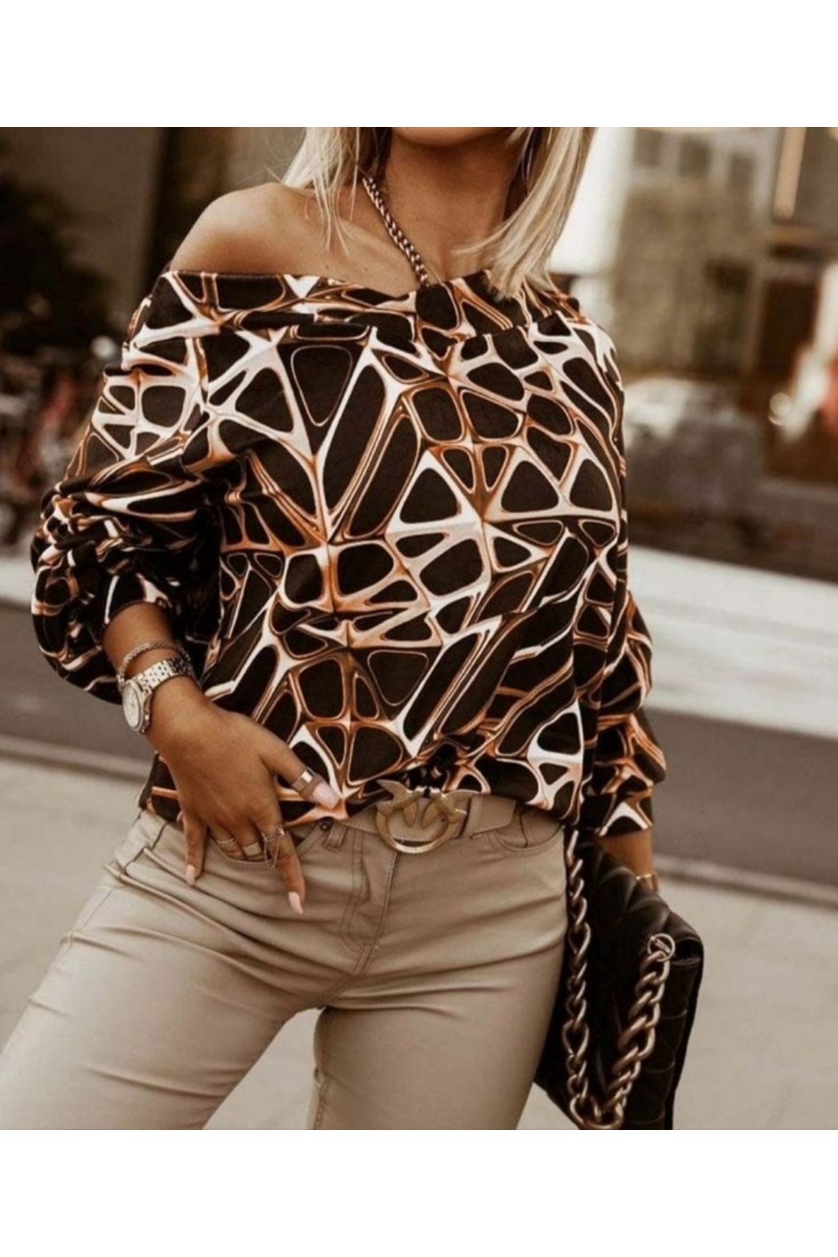 Kadın Uzun Kollu V Yaka Düşük Omuz Geometrik Desen şardonlu Dalgıç Bluz
