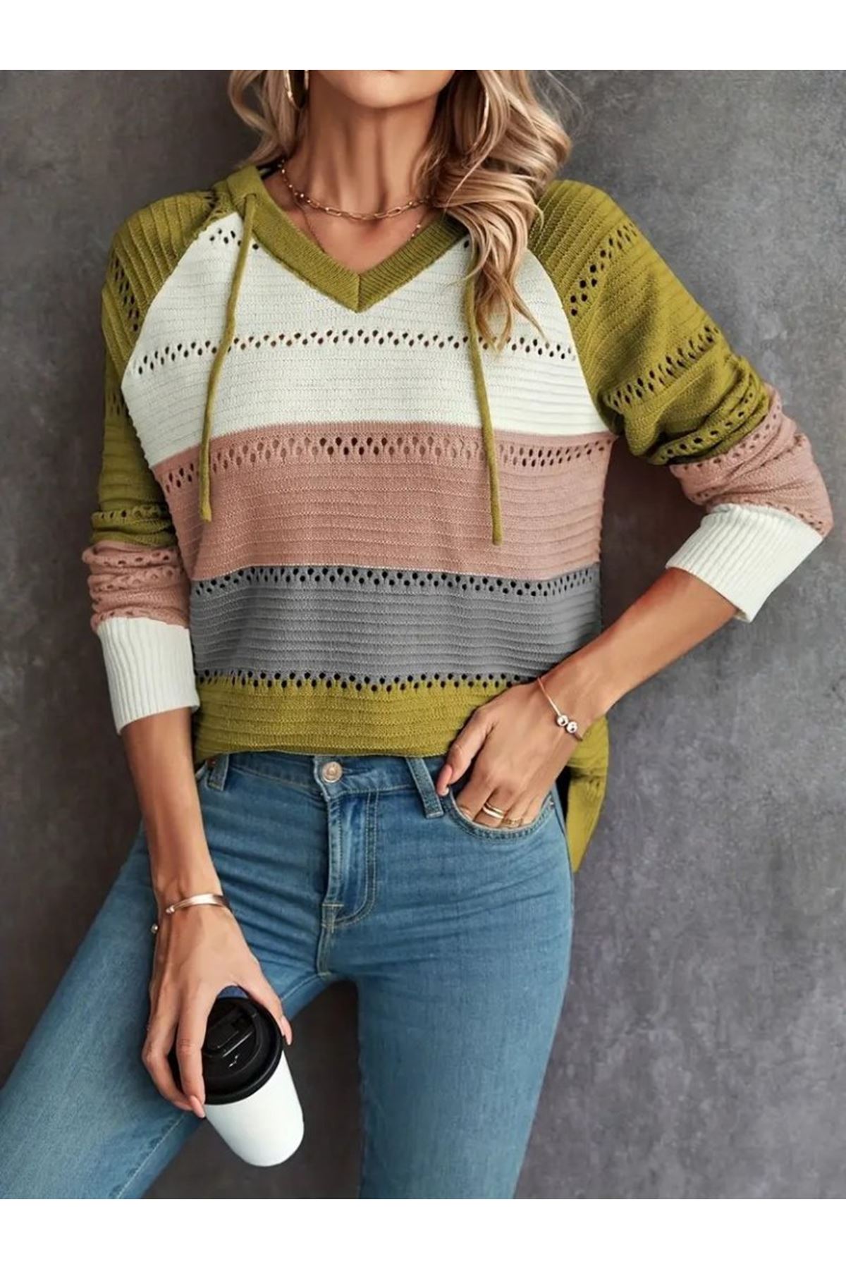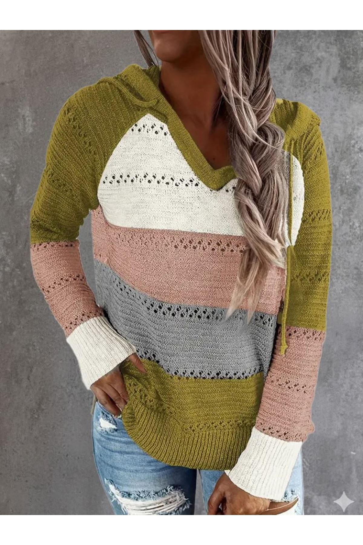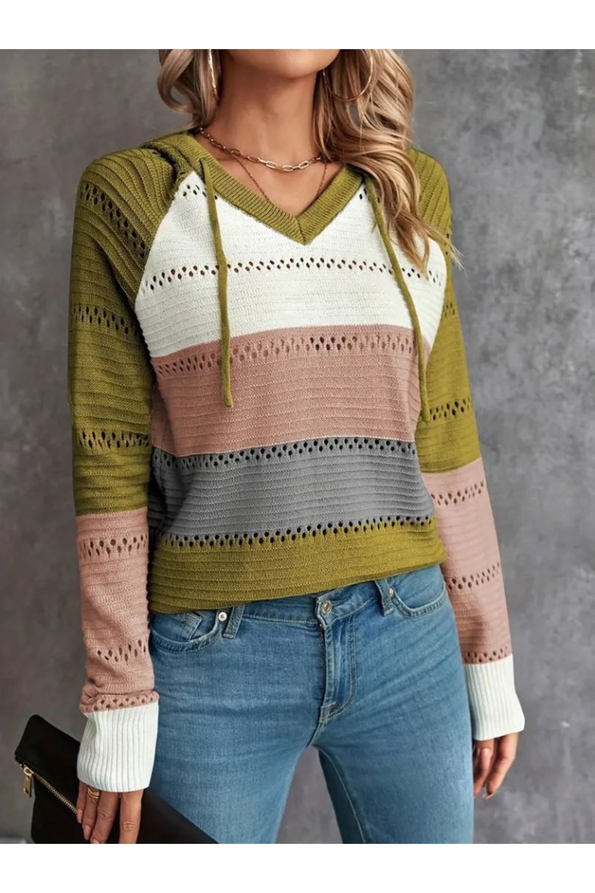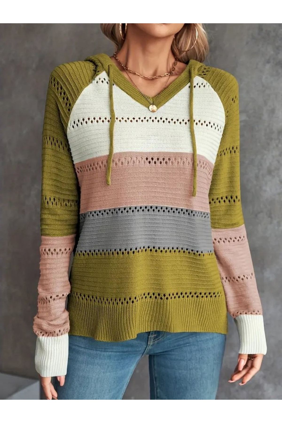 Kadın Uzun Kollu V Yakalı Bağcıklı Kapşonlu Triko Bluz