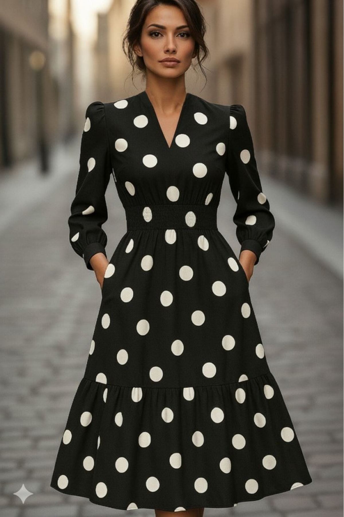 Kadın Uzun Kollu V Yakalı Beli Lastikli Puantiyeli Uzun Krep Elbise