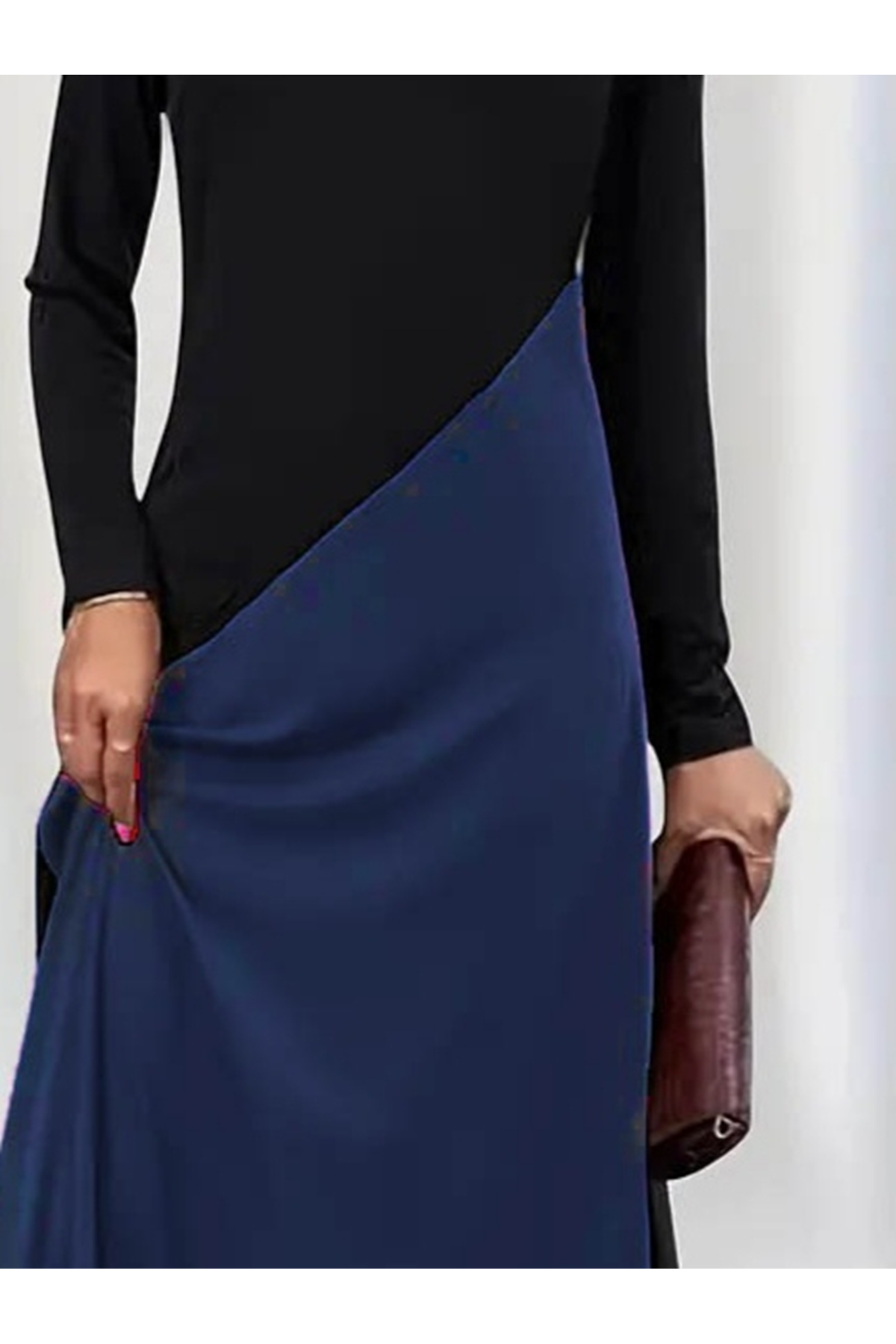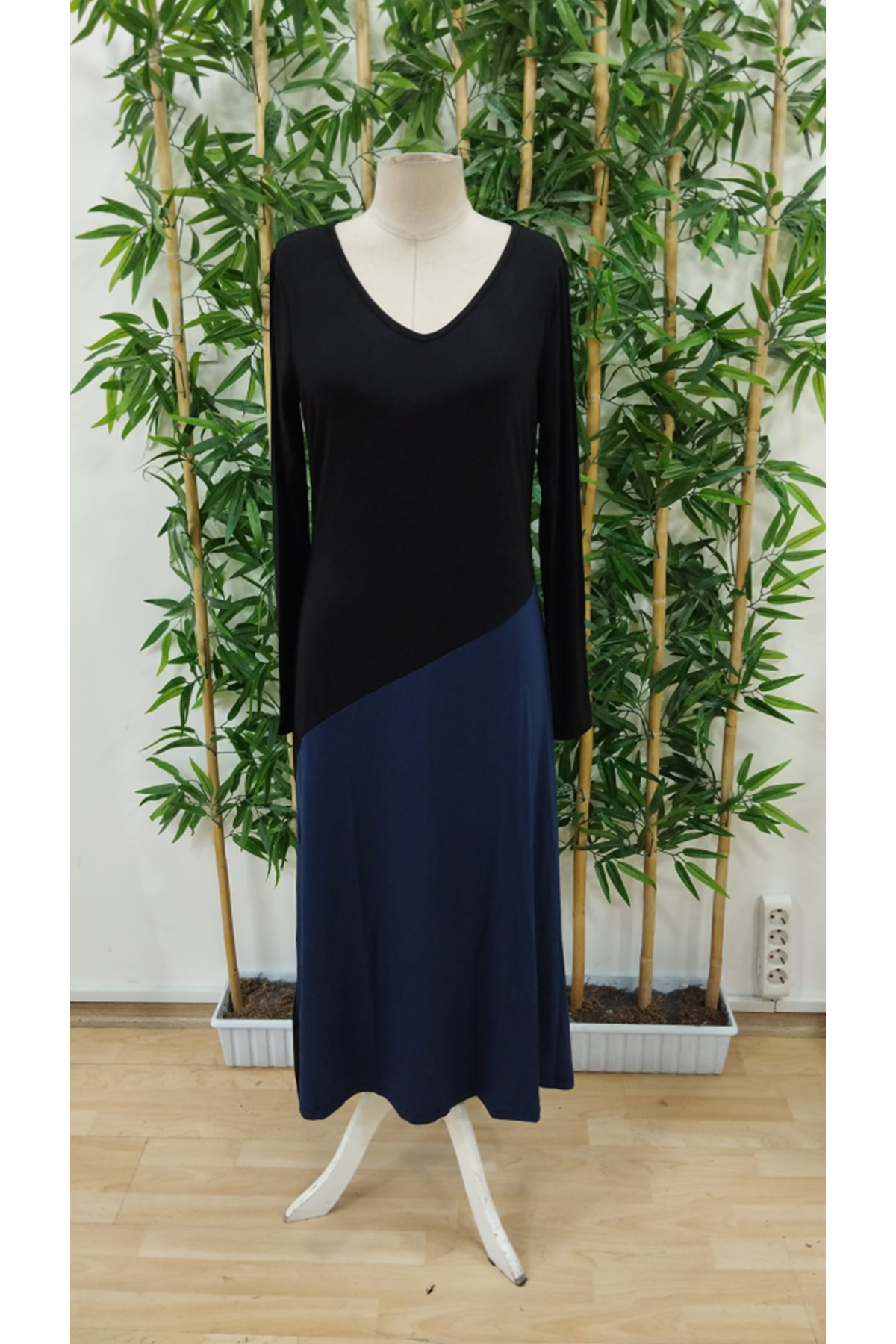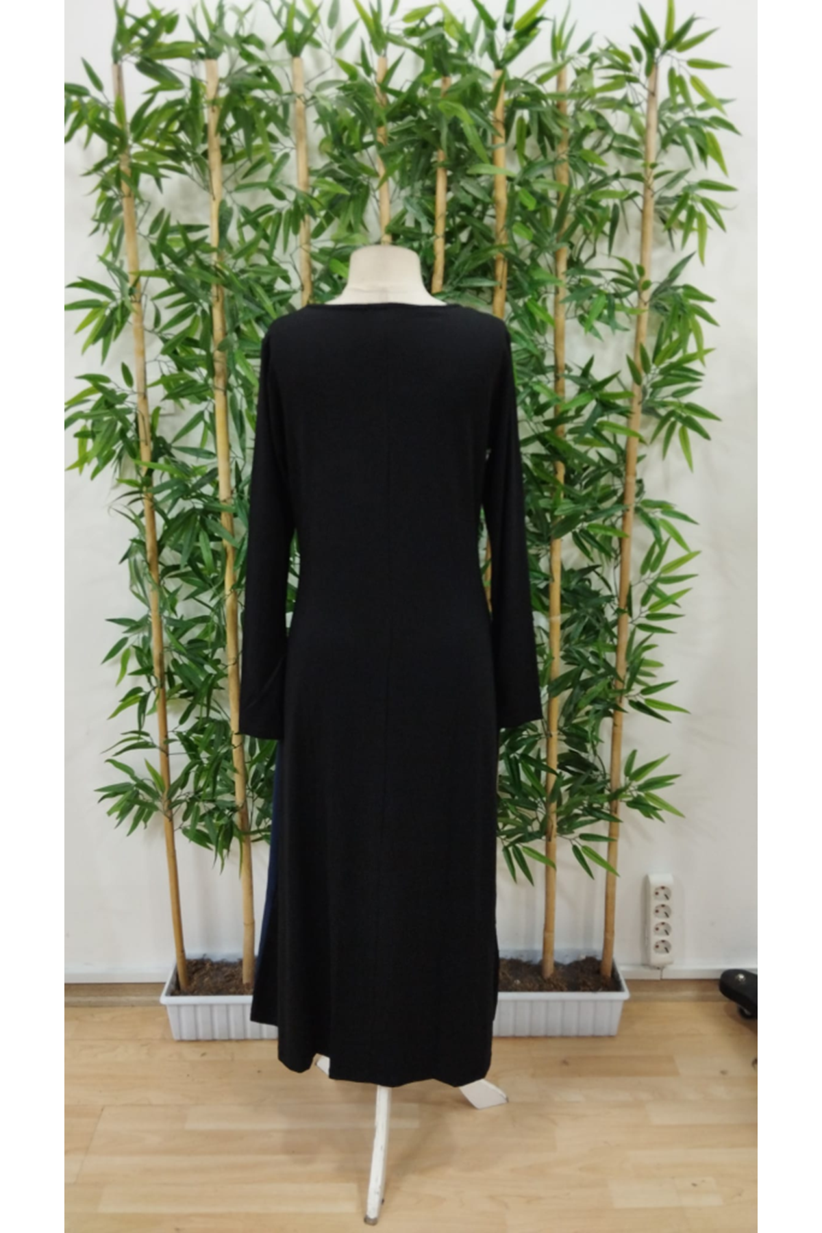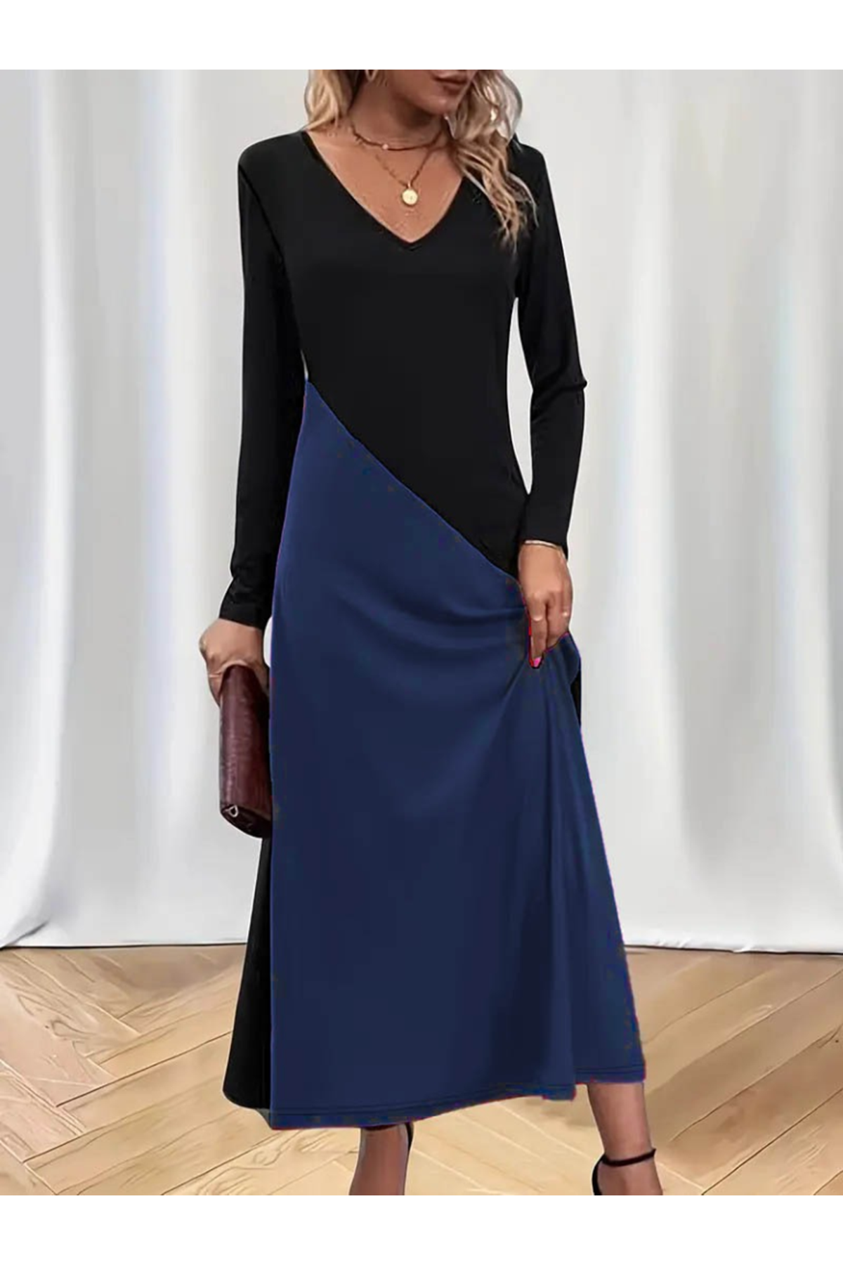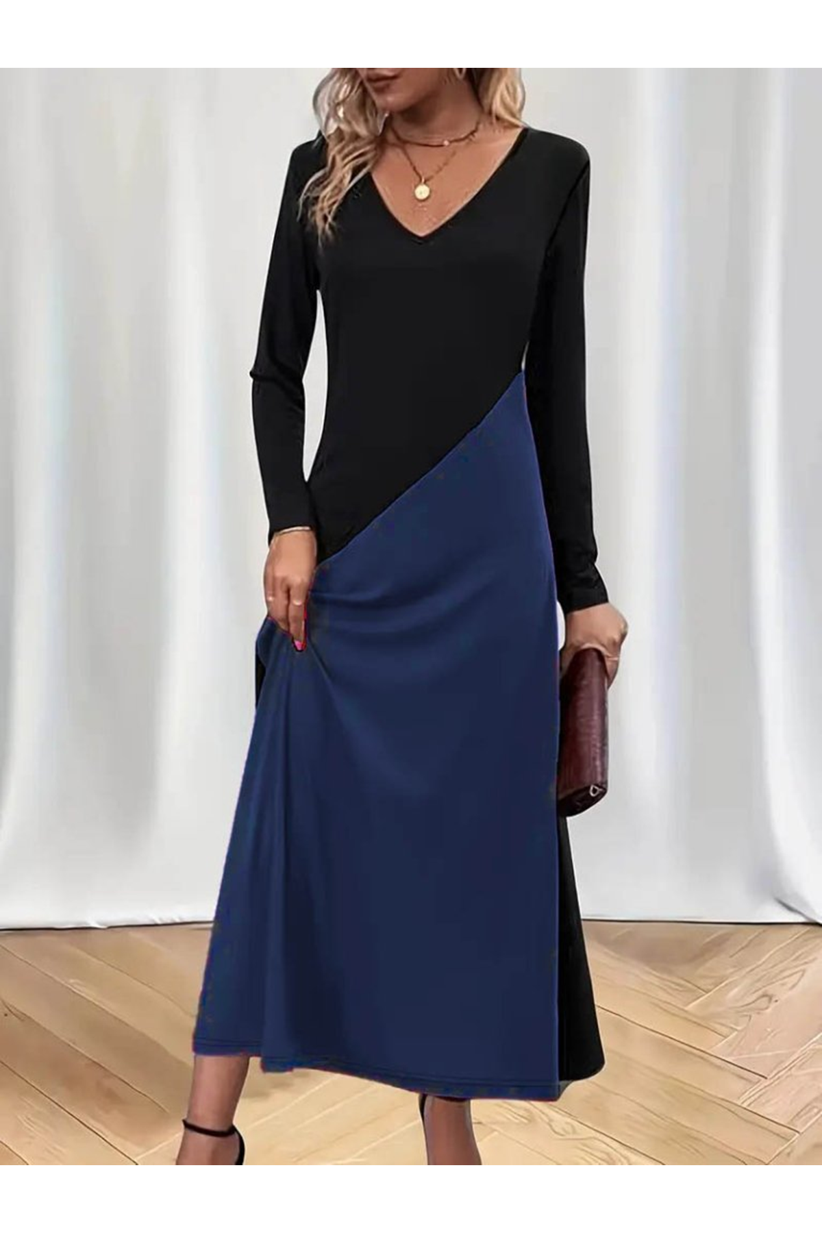 Kadın Uzun Kollu V Yakalı Blok Desenli Viskon Elbise