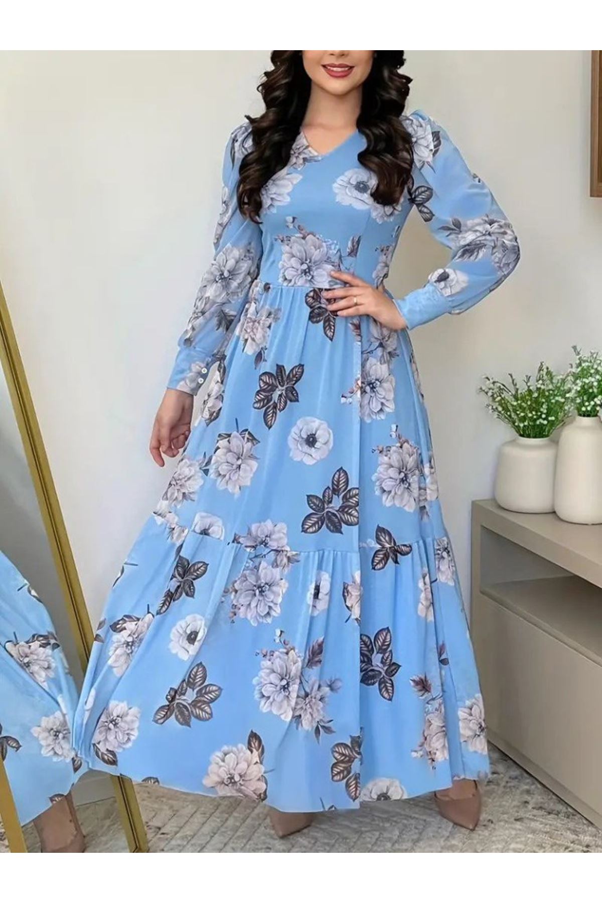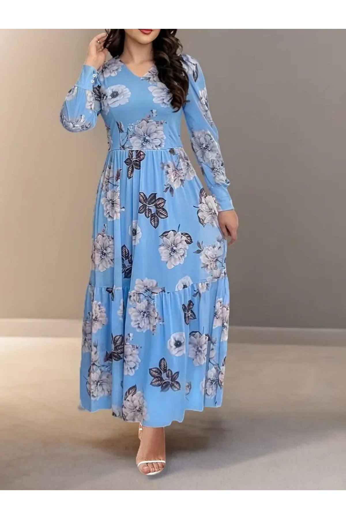 Kadın Uzun Kollu V Yakalı çiçek Desenli Maxi Süprem Elbise