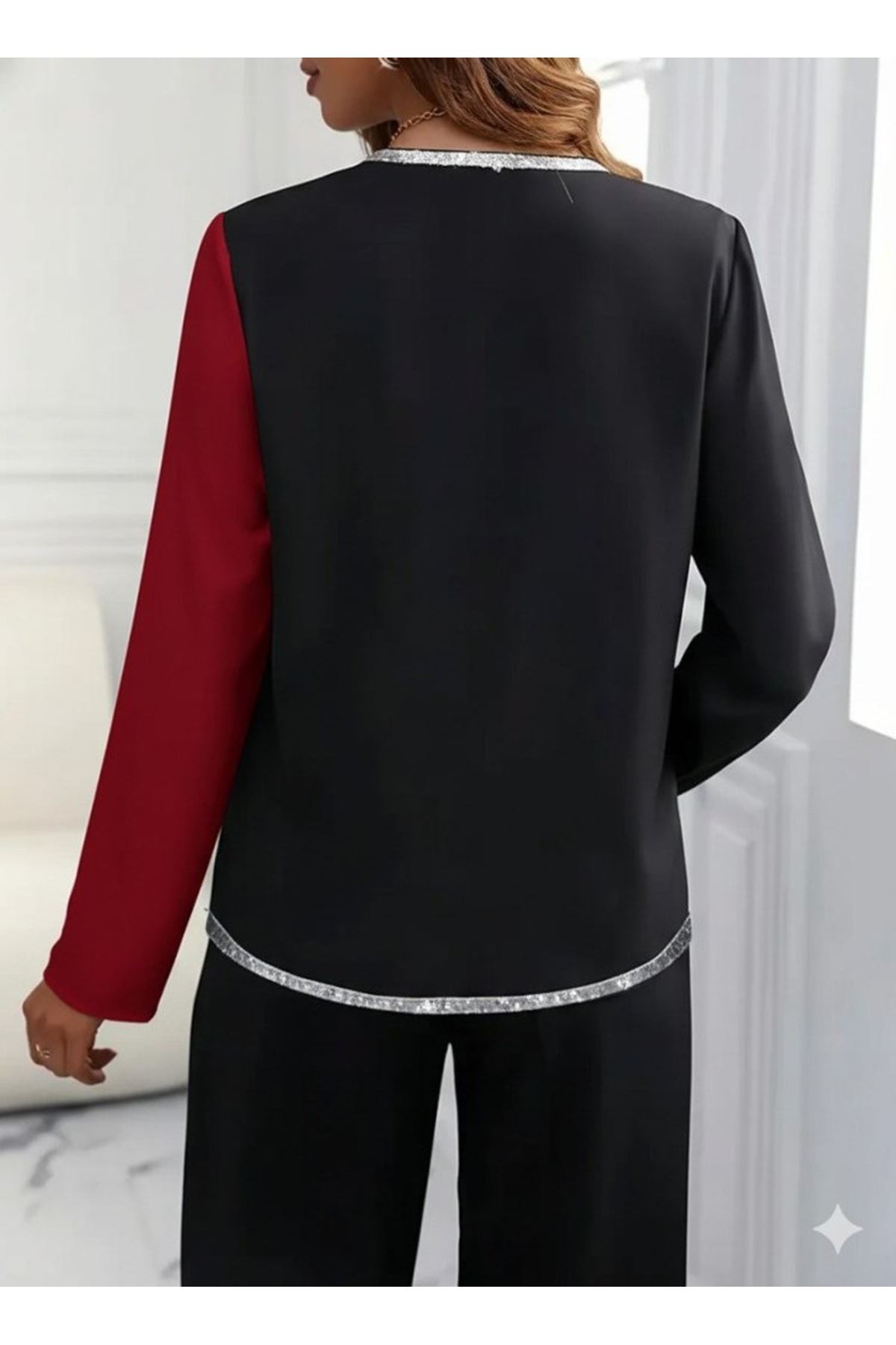 Kadın Uzun Kollu V Yakalı Pul Payet Işlemeli Ithal Krep Bluz
