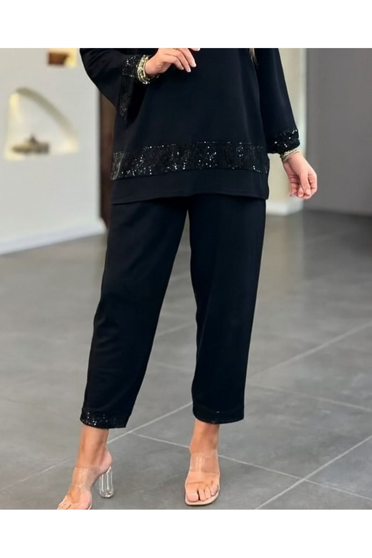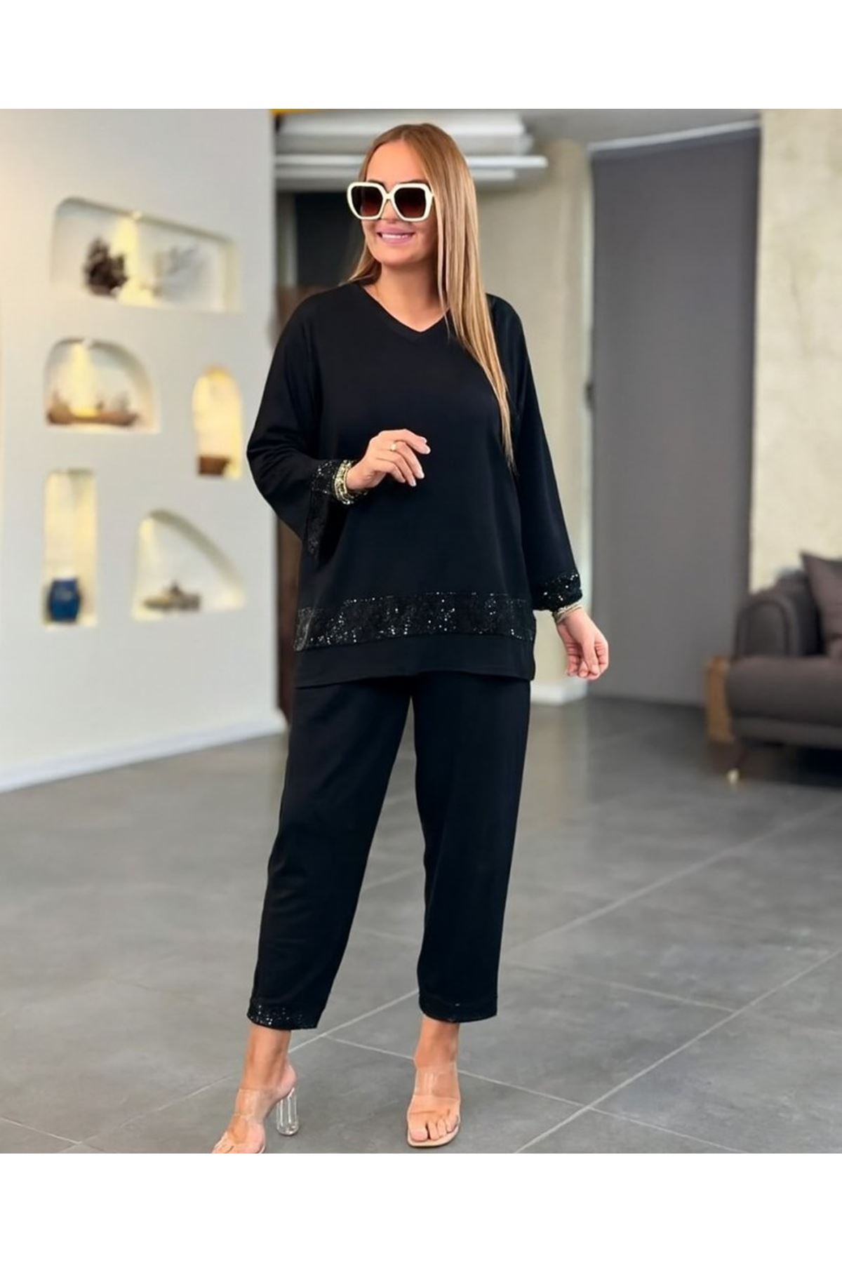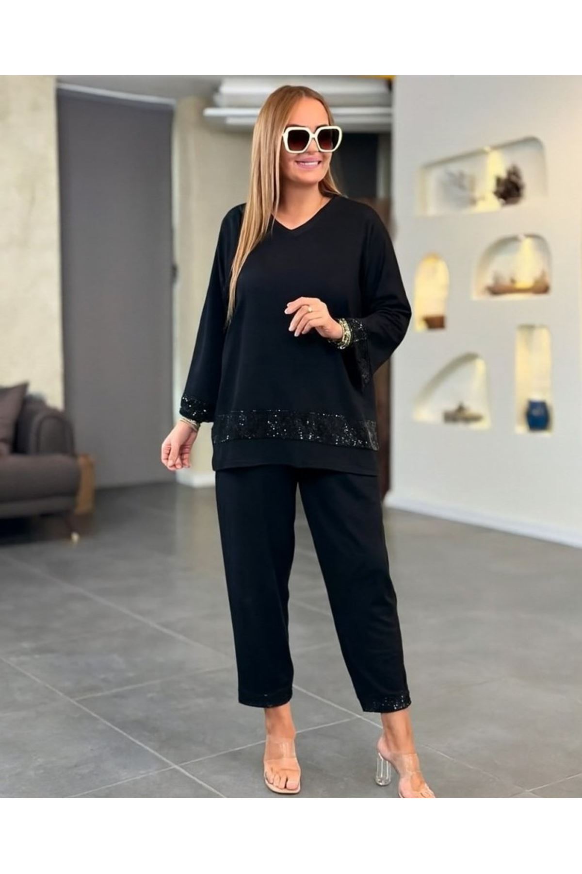 Kadın Uzun Kollu V Yakalı Pulpayet Viskon Iki Iplik Bluz Ve Pantolon Takım