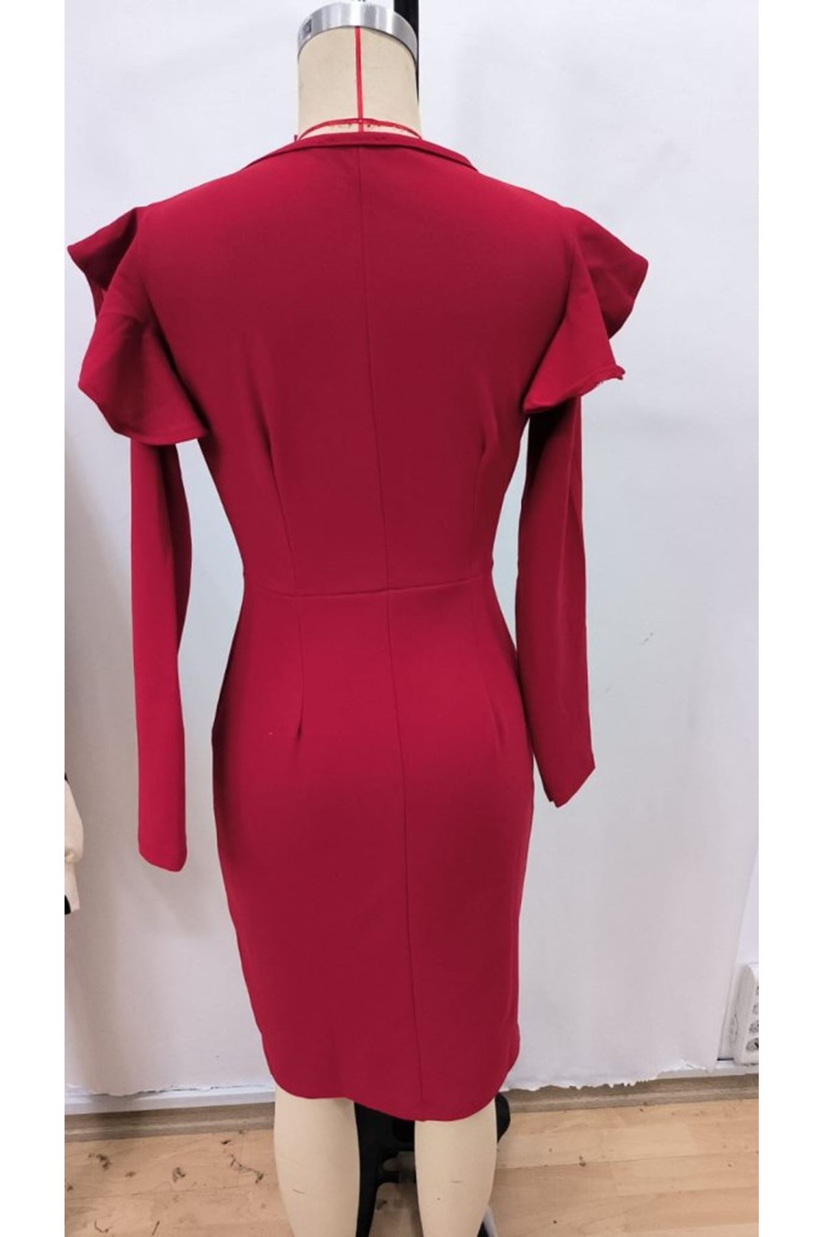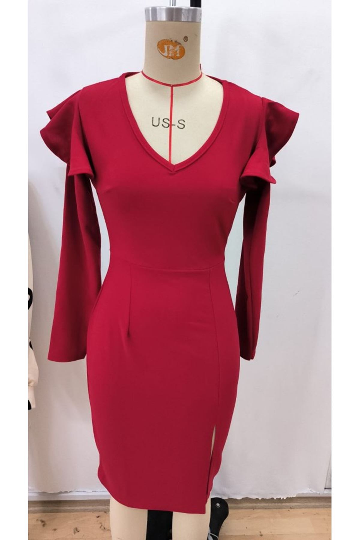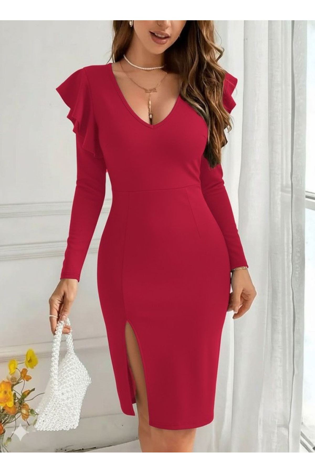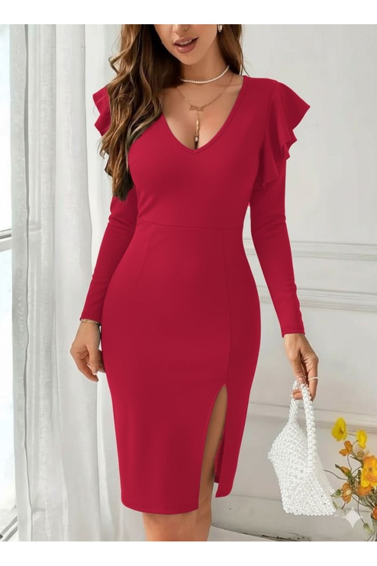 Kadın Uzun Kollu V Yakalı Yandan Yırtmaçlı Midi Ithal Krep Elbise