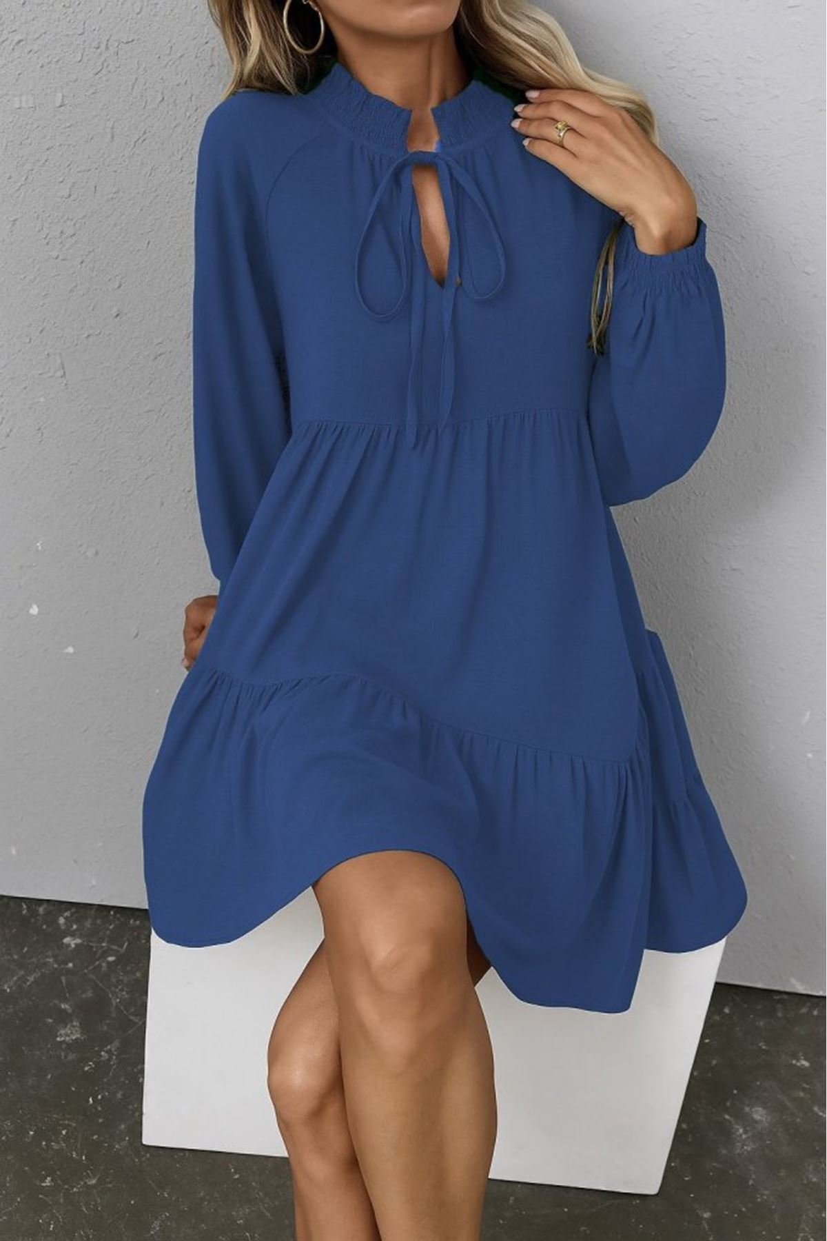 Kadın Uzun Kollu Yakadan Bağcıklı Fırfırlı Keten Mini Elbise