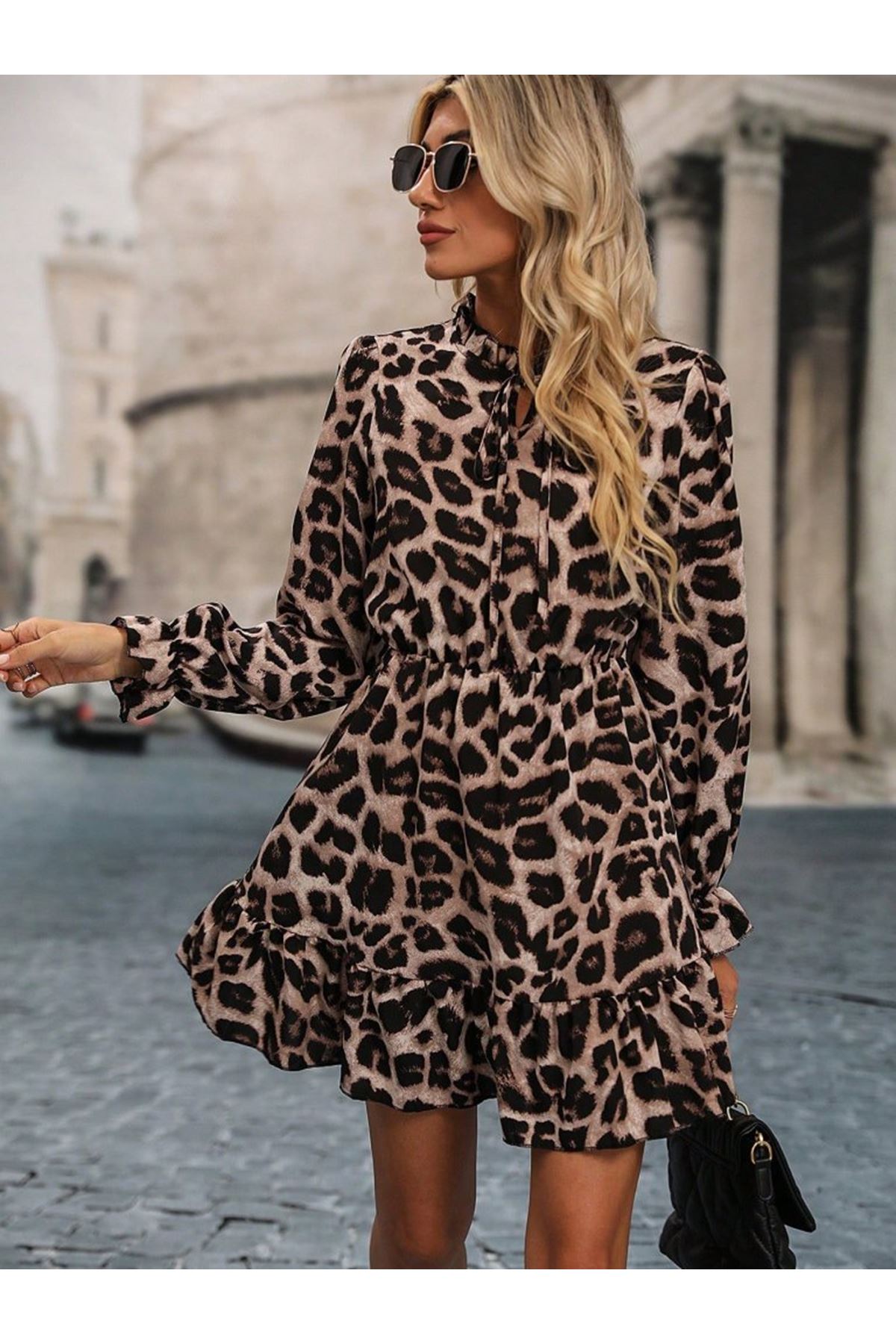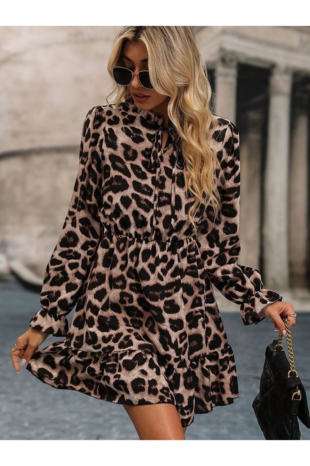 Kadın Uzun Kollu Yakadan Bağcıklı Modal Leopar Desenli Mini Elbise